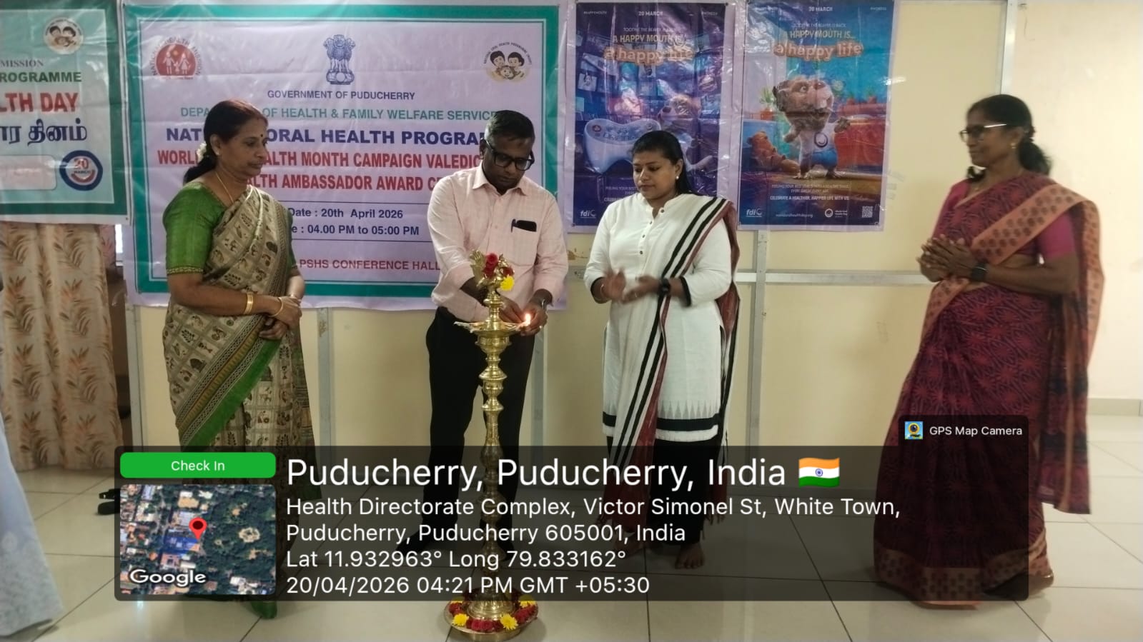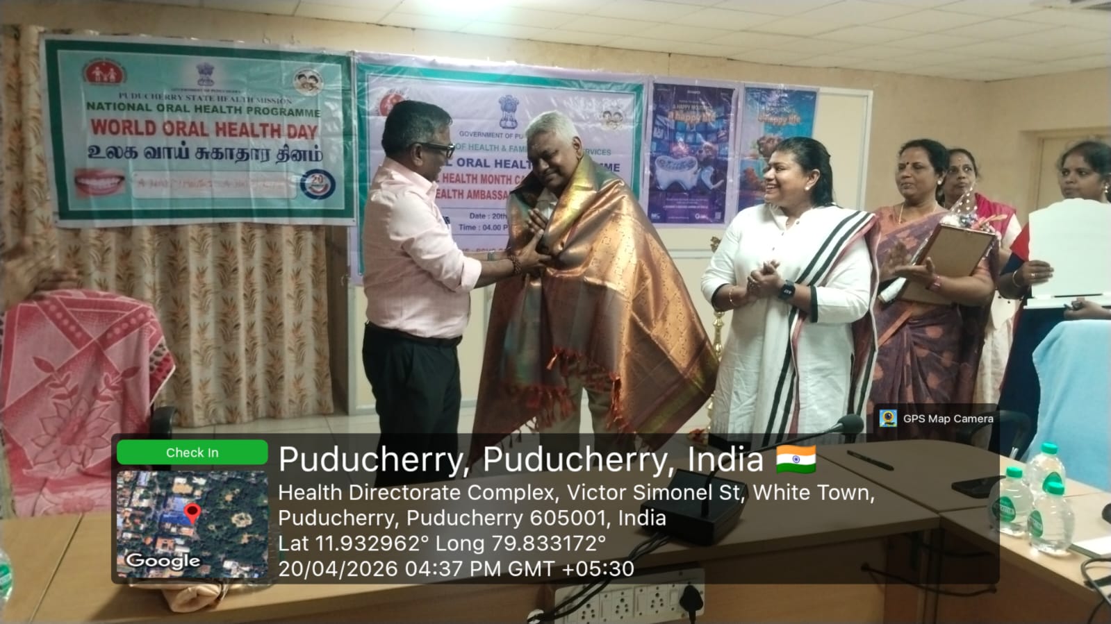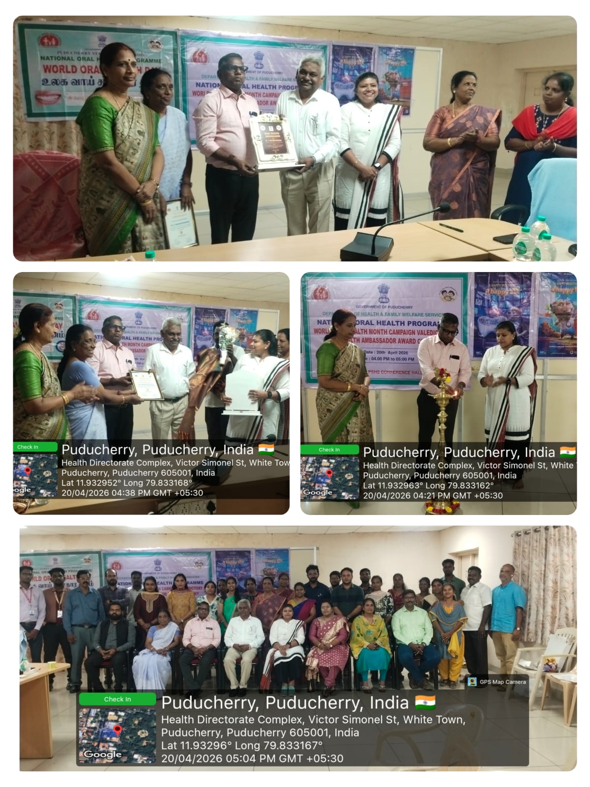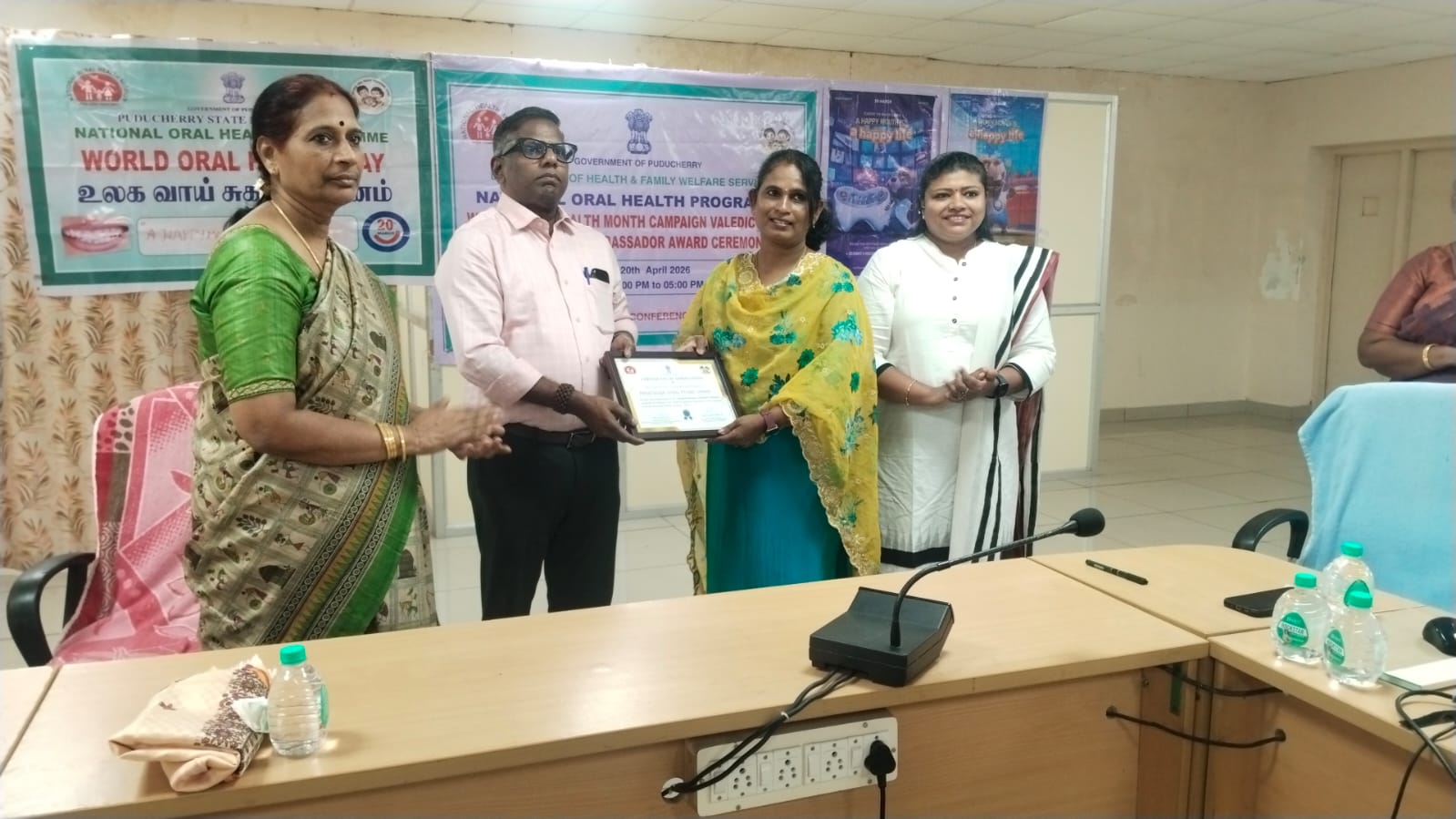 As a special event of World Oral Health Day Celebration 2026, the Oral Health Ambassador Award has been proposed for Dr. S. Ramasubramanian, Chief Dental Surgeon (SAG) at Indira Gandhi Government General Hospital and Postgraduate Institute. This recognition honors his outstanding contributions to the field of oral health, particularly his leadership, dedication, and commitment to improving community dental care. Through his exemplary service, he has played a vital role in strengthening oral health programs, promoting preventive care, and mentoring healthcare professionals. The award acknowledges his continuous efforts in advancing oral health awareness and delivering quality dental services to the public. The award and the certificate were given by Dr. S.Sevvel, Director Health as part of the Valedictory ceremony of the World Oral Health Month campaign at NHM Conference Hall, Puducherry on 20th March. (20th March - 20th April 2026). Nearly 80 participated.