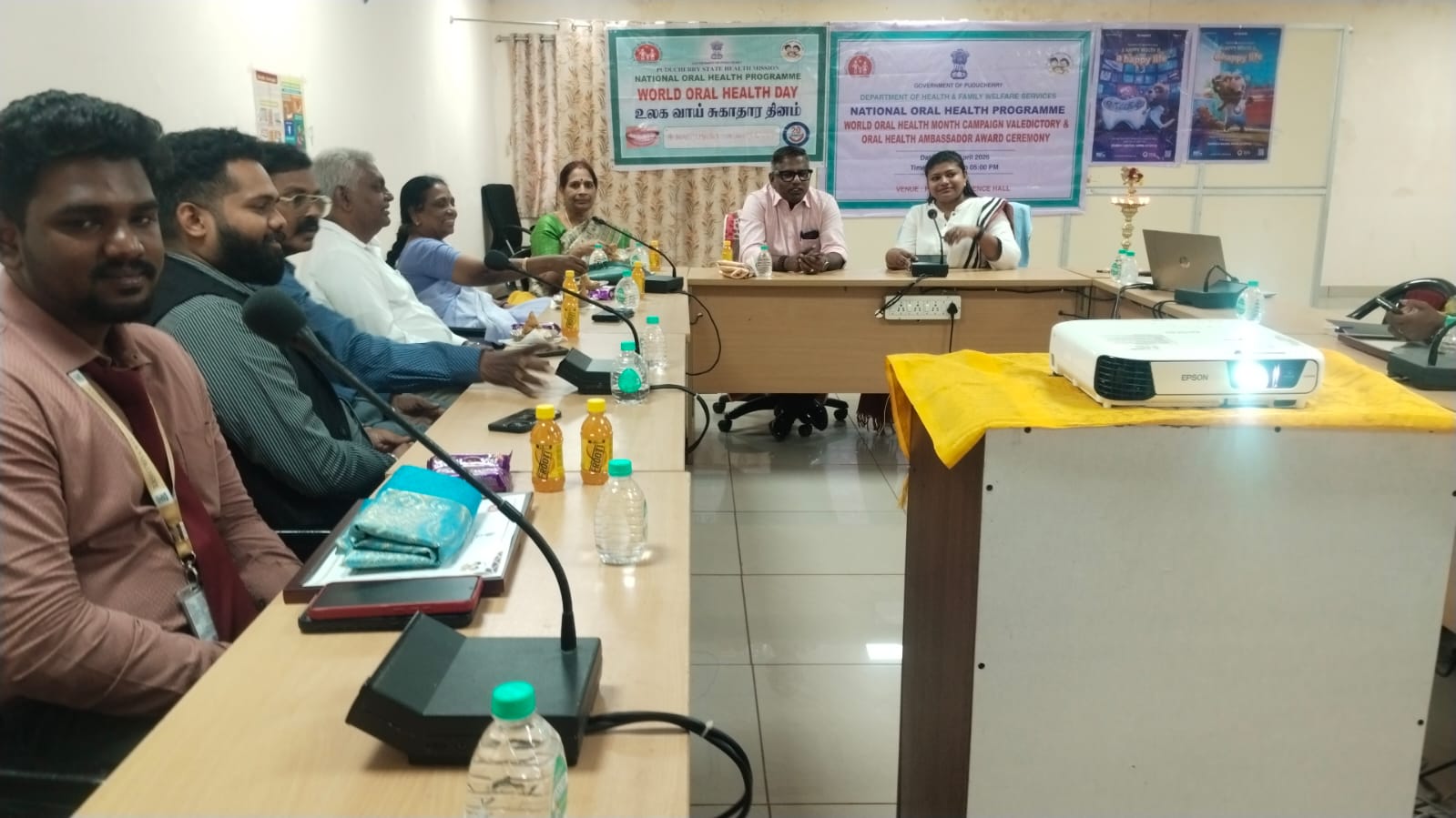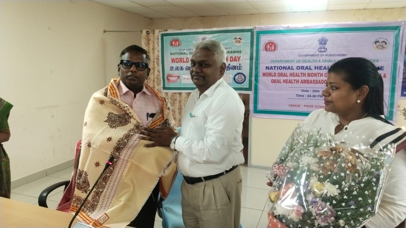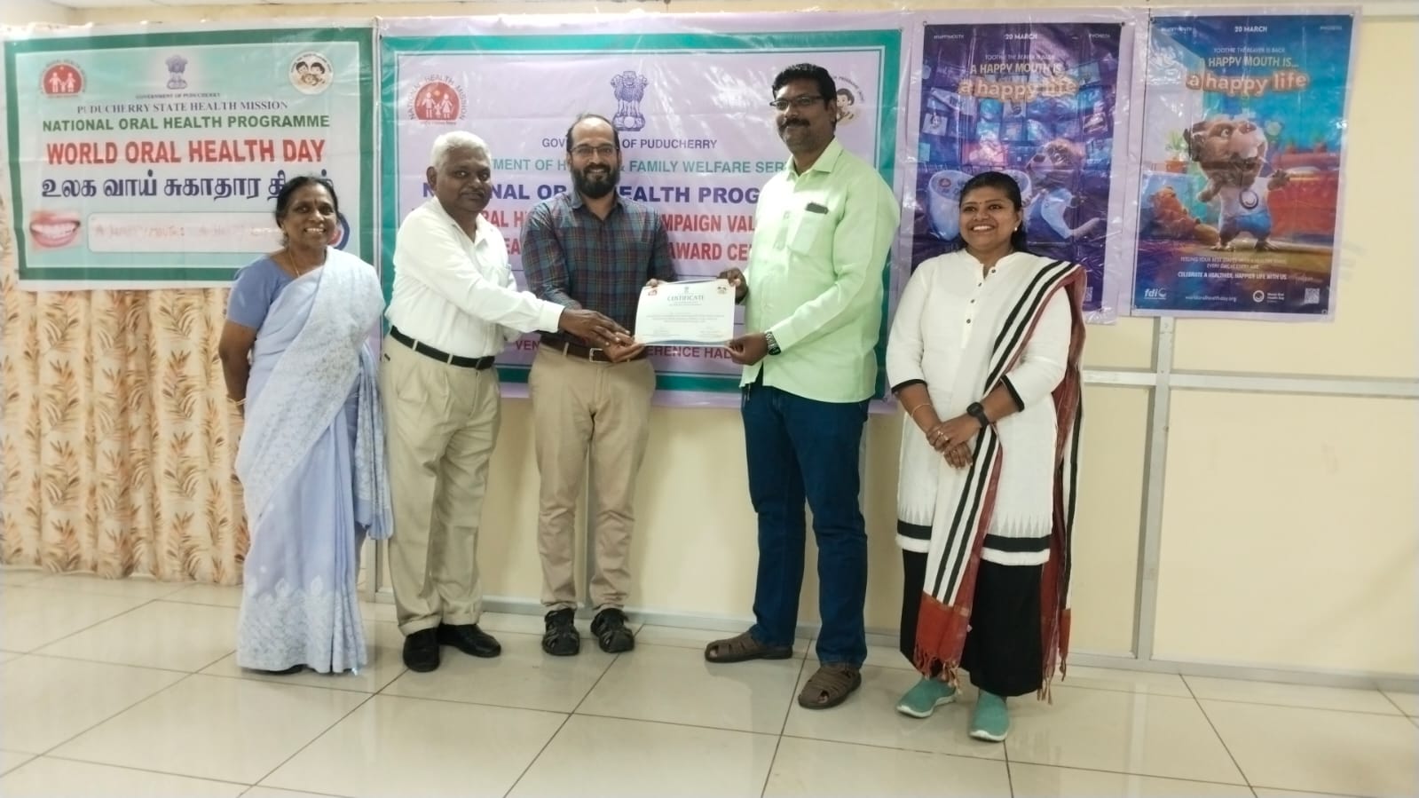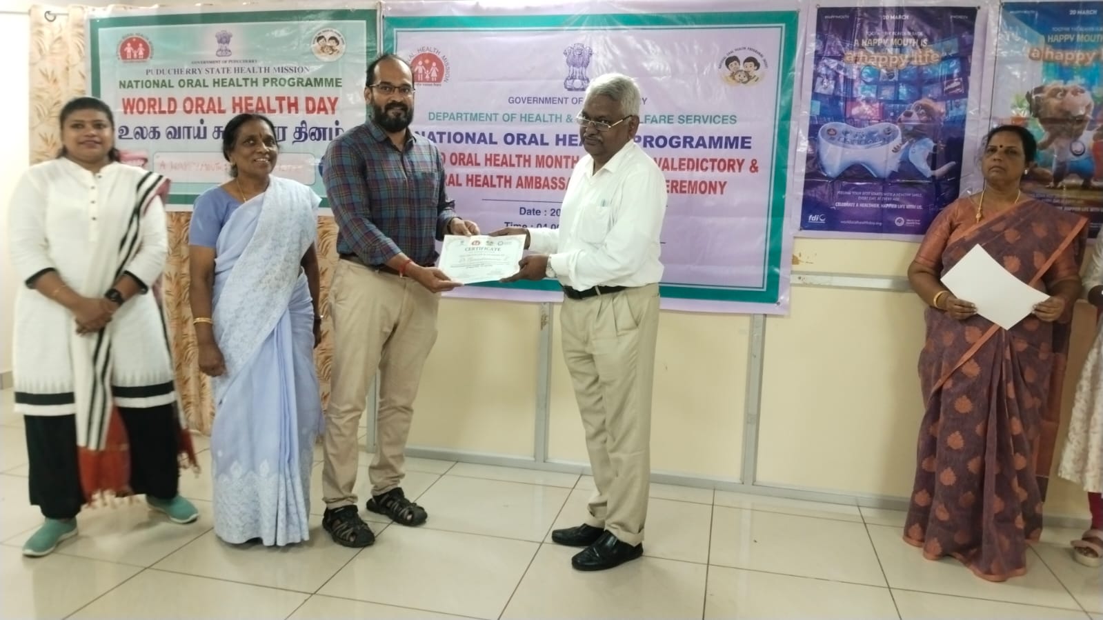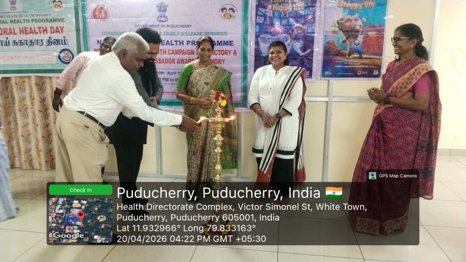 As a special event of World Oral Health Day Celebration 2026, the Oral Health Ambassador Award has been proposed for Dr. S. Ramasubramanian, Chief Dental Surgeon (SAG) at Indira Gandhi Government General Hospital and Postgraduate Institute. This recognition honors his outstanding contributions to the field of oral health, particularly his leadership, dedication, and commitment to improving community dental care. Through his exemplary service, he has played a vital role in strengthening oral health programs, promoting preventive care, and mentoring healthcare professionals. The award acknowledges his continuous efforts in advancing oral health awareness and delivering quality dental services to the public. The award and the certificate were given by Dr. S.Sevvel, Director Health as part of the Valedictory ceremony of the World Oral Health Month campaign at NHM Conference Hall, Puducherry on 20th March. (20th March - 20th April 2026). Nearly 80 participated.