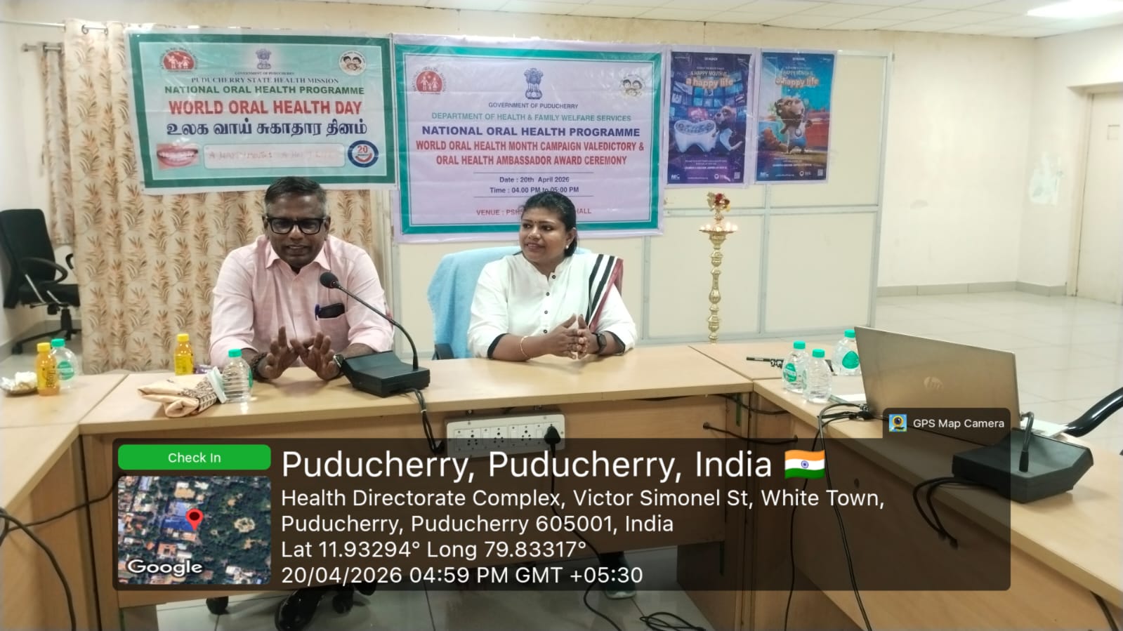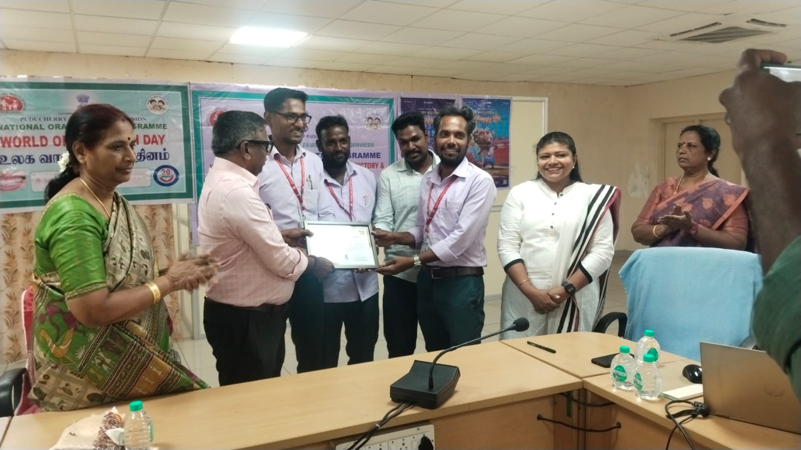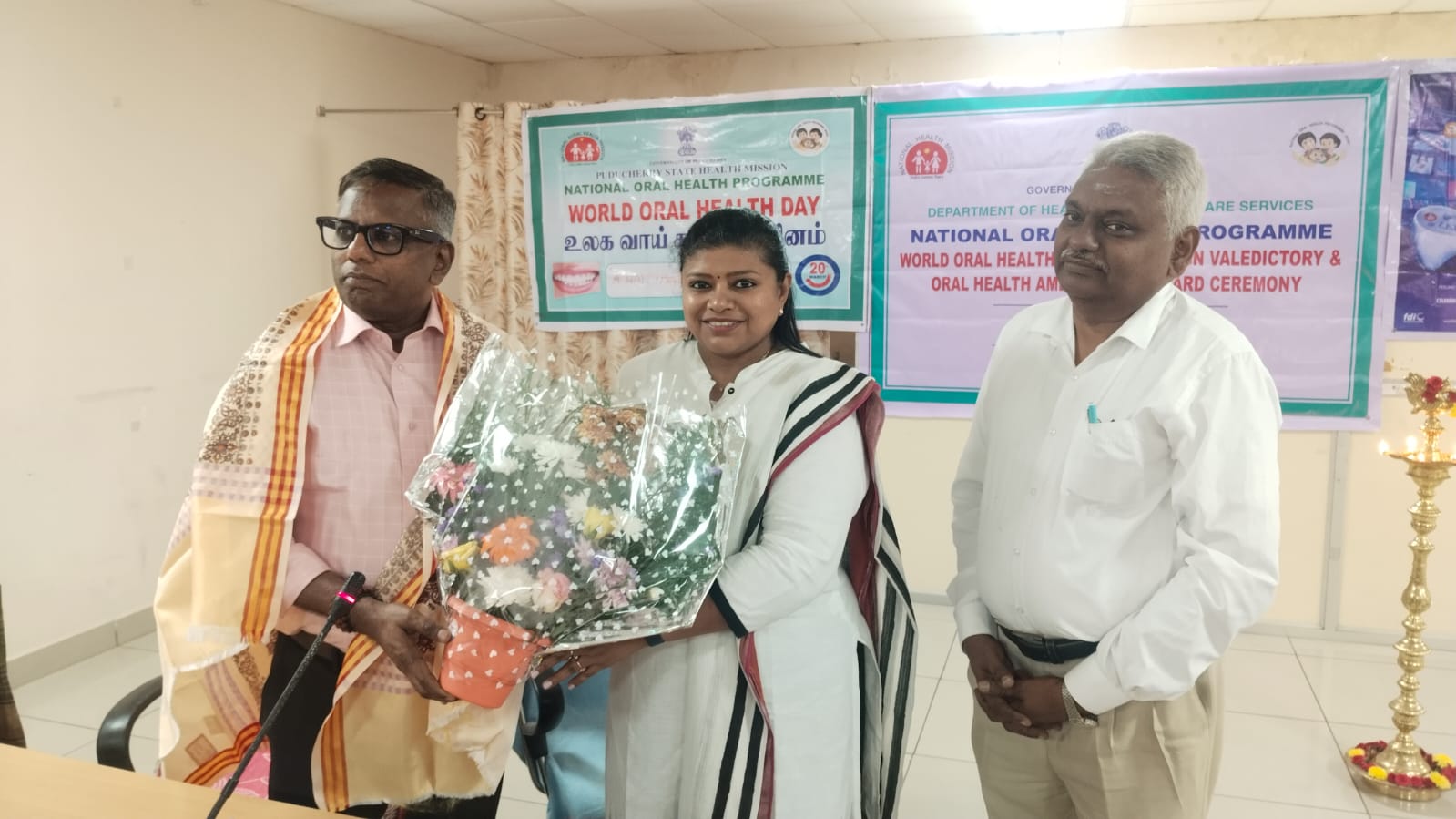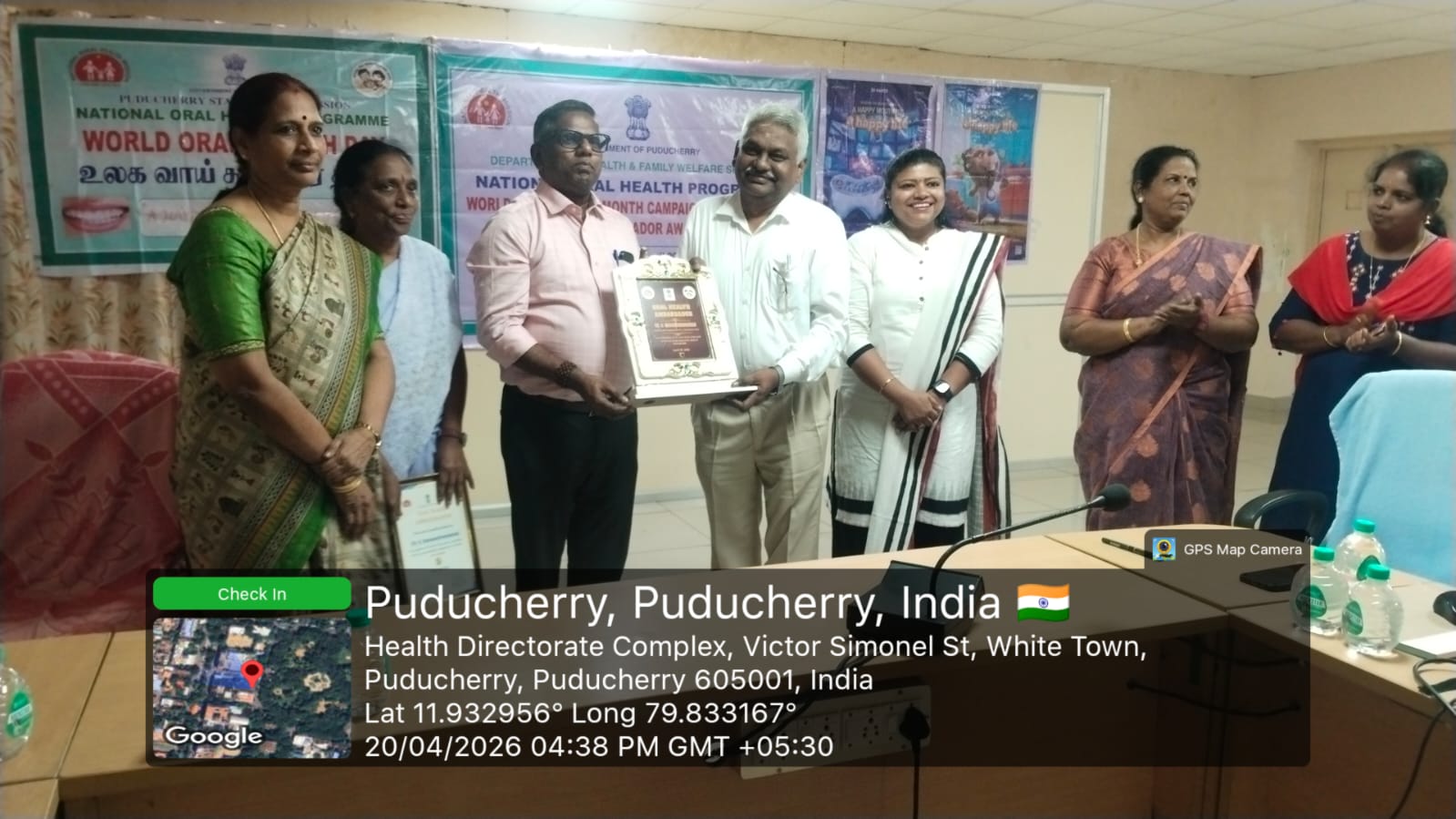 As a special event of World Oral Health Day Celebration 2026, the Oral Health Ambassador Award has been proposed for Dr. S. Ramasubramanian, Chief Dental Surgeon (SAG) at Indira Gandhi Government General Hospital and Postgraduate Institute. This recognition honors his outstanding contributions to the field of oral health, particularly his leadership, dedication, and commitment to improving community dental care. Through his exemplary service, he has played a vital role in strengthening oral health programs, promoting preventive care, and mentoring healthcare professionals. The award acknowledges his continuous efforts in advancing oral health awareness and delivering quality dental services to the public. The award and the certificate were given by Dr. S.Sevvel, Director Health as part of the Valedictory ceremony of the World Oral Health Month campaign at NHM Conference Hall, Puducherry on 20th March. (20th March - 20th April 2026). Nearly 80 participated.