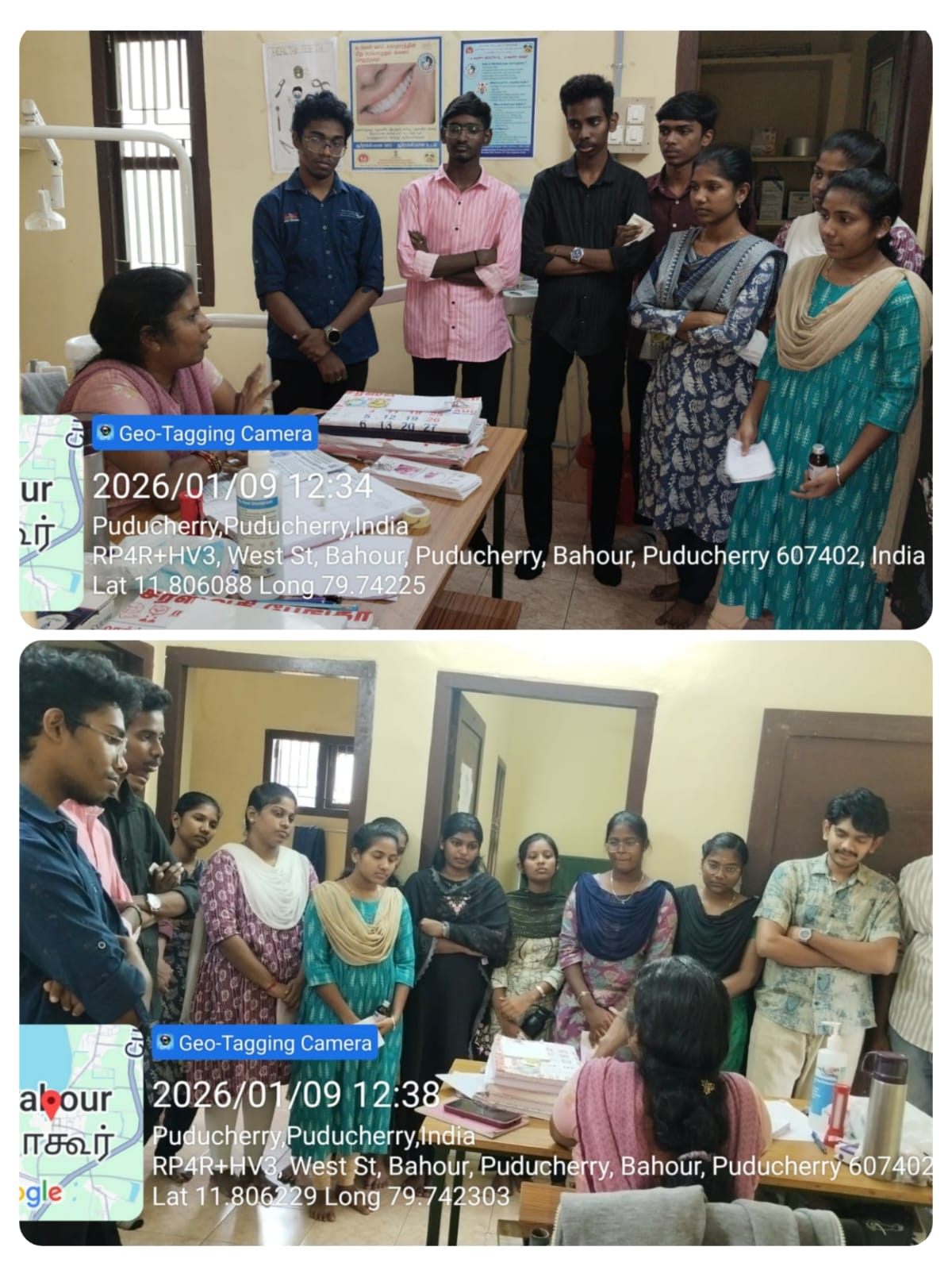 On 09.01.26, a dental check-up and treatment camp was conducted for first-year B.Sc. Nursing students at PHC Bahour from AG Padmavathi Nursing College. An oral health orientation session was delivered focusing on oral disease identification, prevention, and early intervention. Students were also briefed about the Ayushman Arogya Mandir setup and its services. An awareness talk on the harmful effects of tobacco use, quitting methods, and counseling services available at the Tobacco Cessation Clinic (TCC), PHC Bahour, including NRT availability, was provided. Pamphlets were distributed. A total of 15 students benefited from the program.