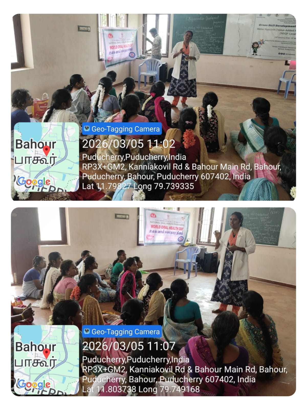 AAM Bahour At Green skill development program created an awareness about oral health among enterpreneur. The program aimed to create awareness about the importance of maintaining good oral hygiene and preventing dental diseases. Brushing techniques were demonstrated using dental models to educate participants on proper oral care practices. Informative posters highlighting common dental problems and preventive measures were displayed for better understanding. The theme Happy Mouth is a Happy Life was clearly explained, emphasizing the connection between oral health nearly 50 benefited by this interactive session
