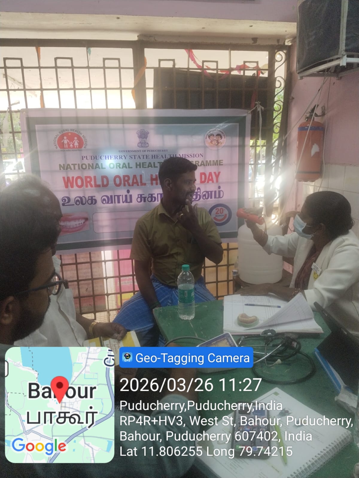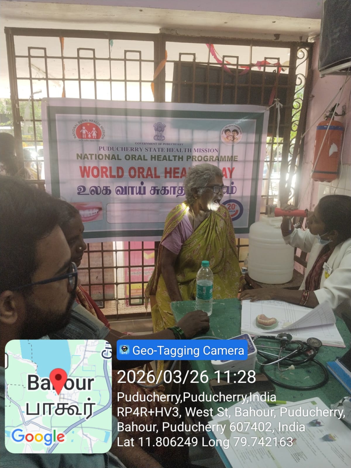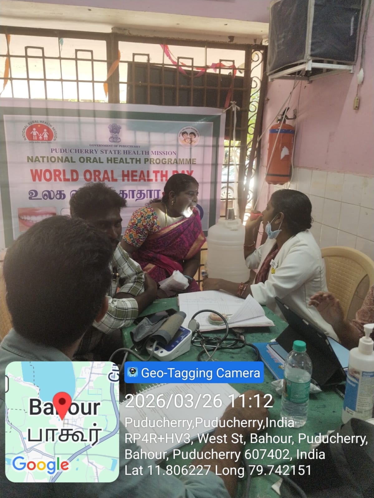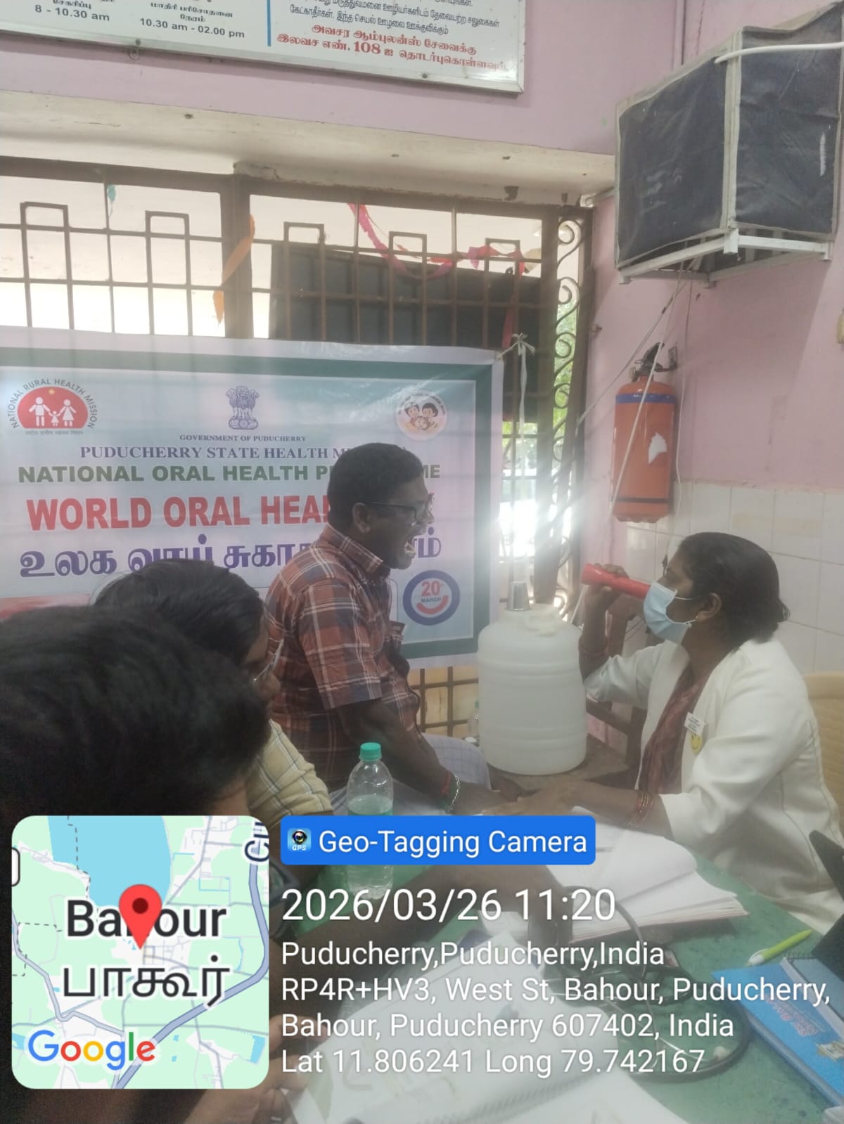 26.03.26 PHC Bahour, Oral Screening Camp ,WOHD 2026World Oral Health Day celebration dental awareness session was conducted for the well baby clinic mothers and general public. The theme “ Happy Mouth is a Happy Life" was explained, highlighting the importance of maintaining good oral hygiene, early detection of dental problems, and promoting oral health awareness among the community participated and gained useful knowledge. On account of World Oral Health Day the theme " A happy mouth is a happy life"& Oral health pamplets distributed.