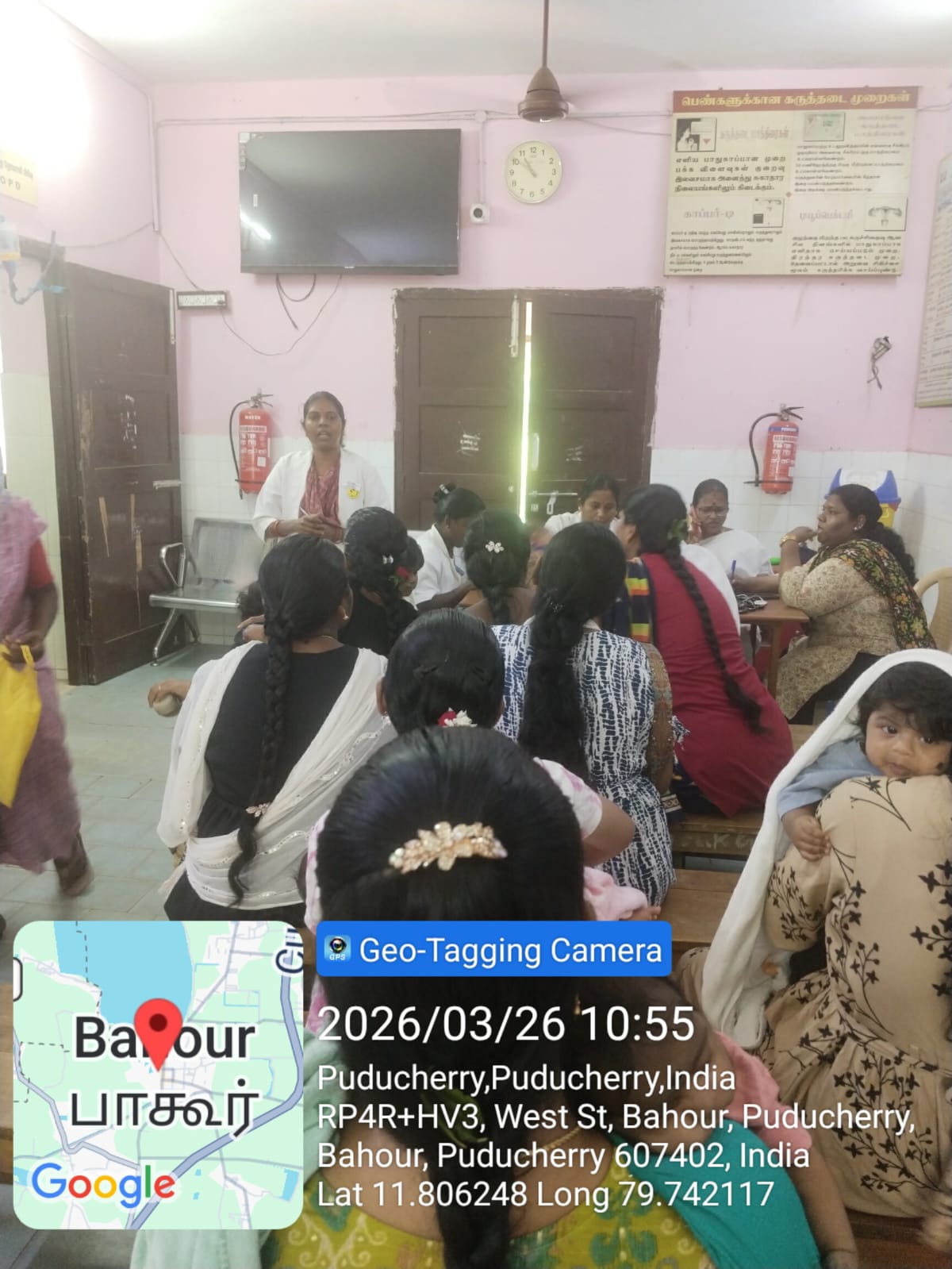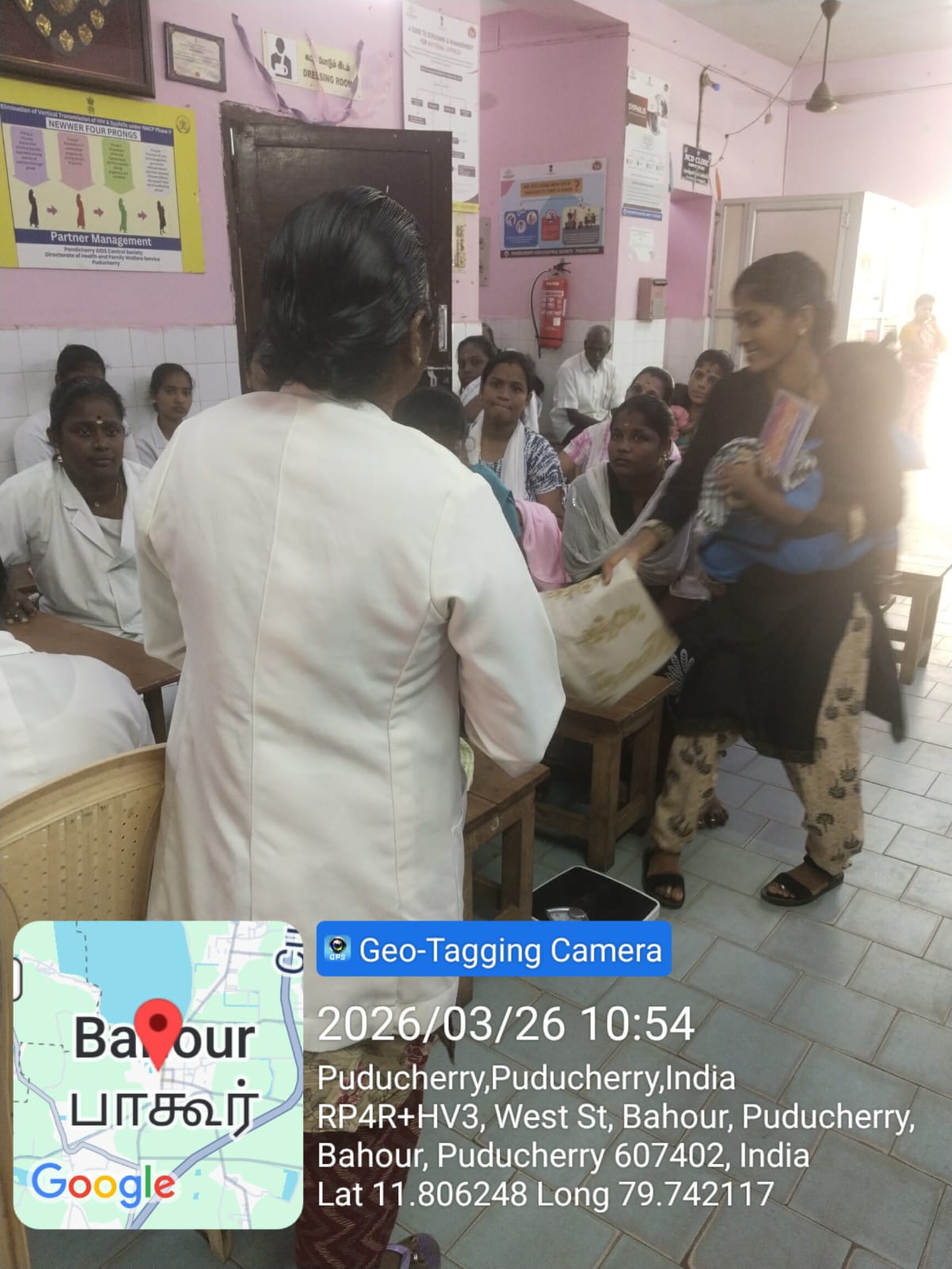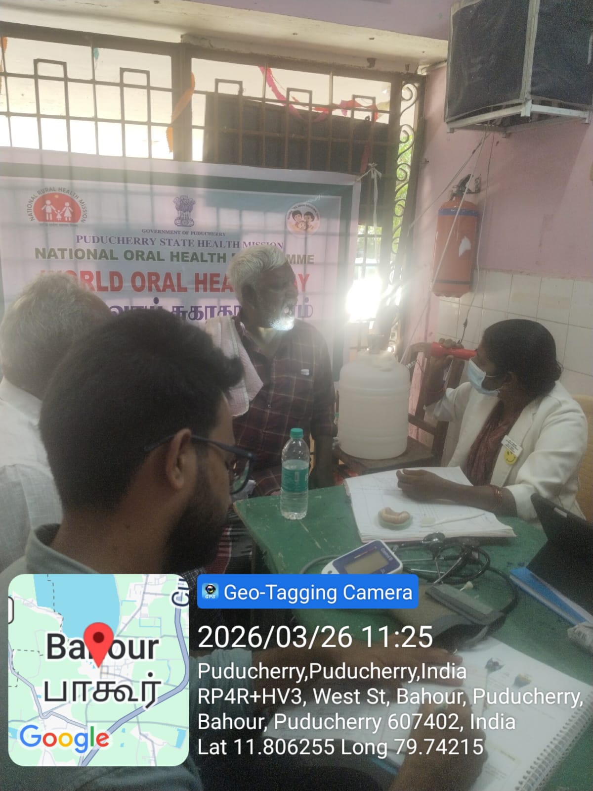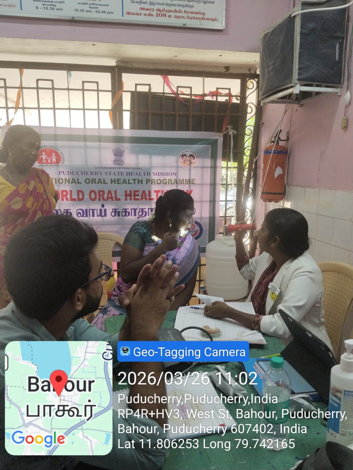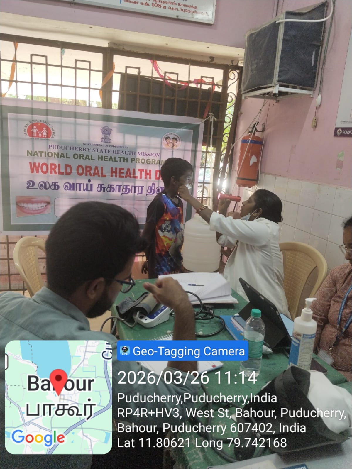 26.03.26 PHC Bahour, Oral Screening Camp ,WOHD 2026World Oral Health Day celebration dental awareness session was conducted for the well baby clinic mothers and general public. The theme “ Happy Mouth is a Happy Life" was explained, highlighting the importance of maintaining good oral hygiene, early detection of dental problems, and promoting oral health awareness among the community participated and gained useful knowledge. On account of World Oral Health Day the theme " A happy mouth is a happy life"& Oral health pamplets distributed.