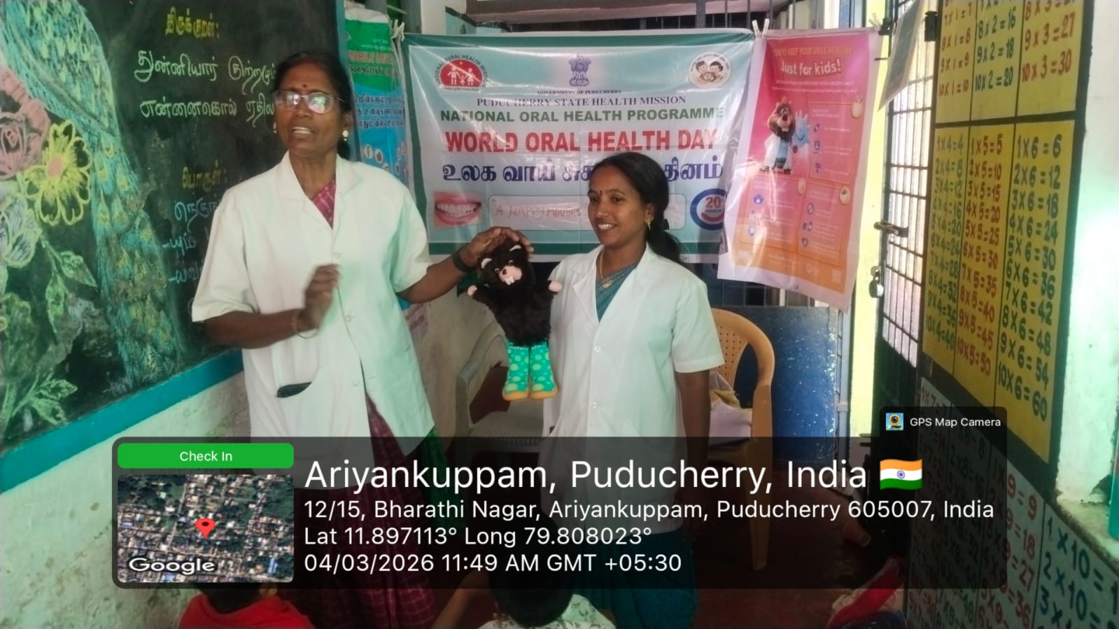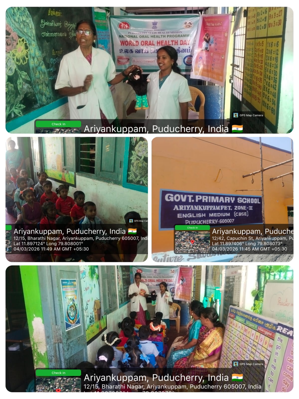 As part of the *World Oral Health Day (WOHD)* 2026 celebration, an oral health awareness session was conducted at *Government Primary School - Ariyankuppampet* on 04.03.2026. The session aimed to educate children about the importance of maintaining good oral hygiene for a healthy life. Proper brushing techniques were demonstrated using dental models and a toothie doll to make the learning process interactive and enjoyable. Students were taught the correct method and duration of brushing, along with the importance of rinsing after meals. The program was well received, and nearly *35* benefited from this informative and engaging session.