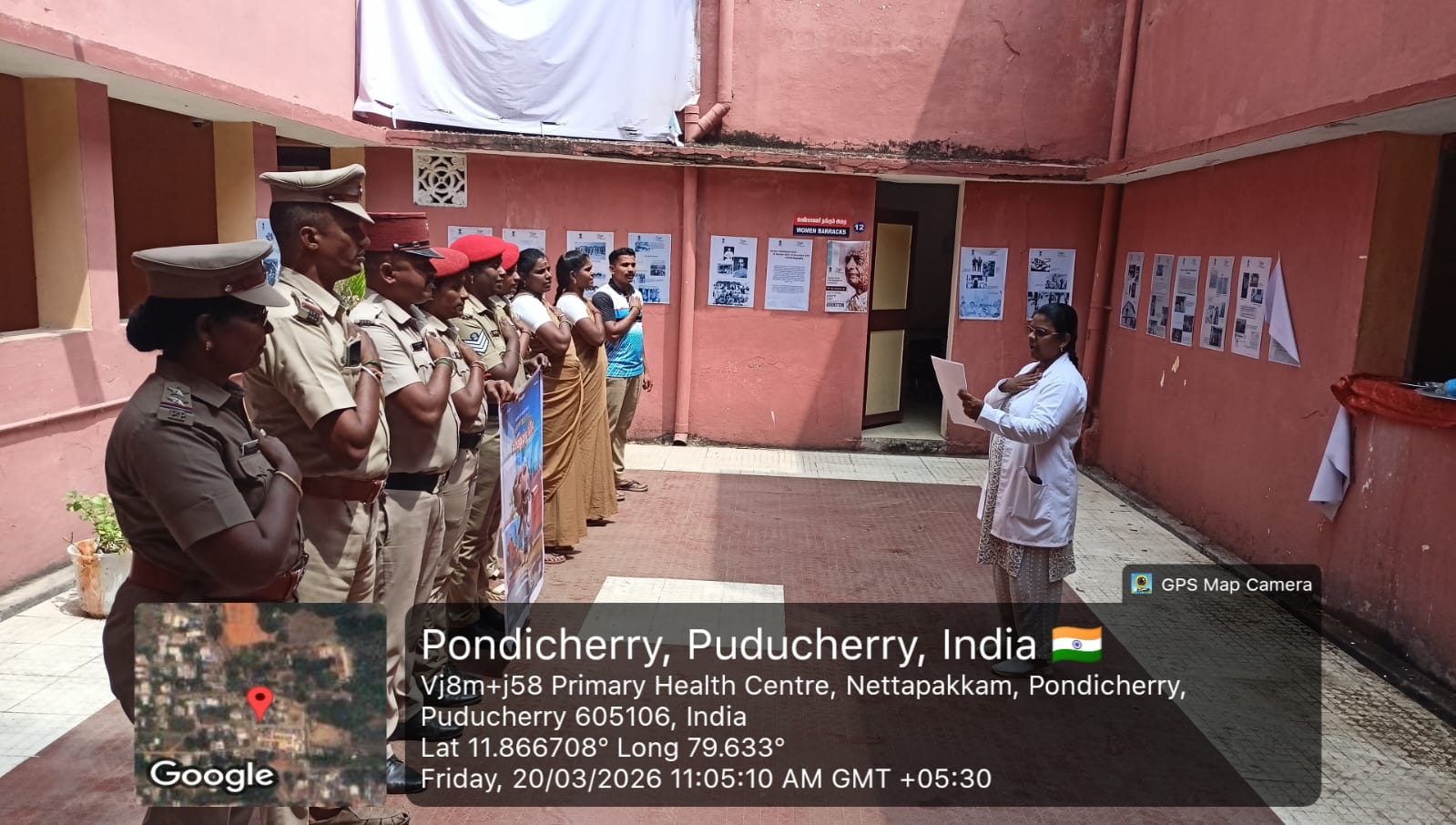 On 20/03/2026, as part of WOHD Celebration 2026, an oral health awareness program was conducted at Nettapakkam Police Station by PHC Nettapakkam. Awareness on do’s and don’ts of oral care was provided, followed by an oral health pledge. Pamphlets and posters were distributed. A total of 9 beneficiaries and 2 health staff participated.