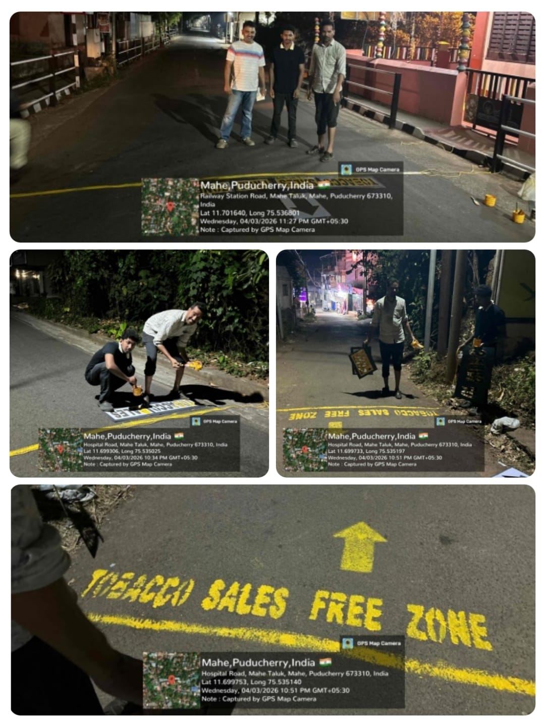 Demarcation lines of Tobacco Sales Free Zone along with correction of controversial old lines in Mahe region was carried out at Midnight by Mr Adarsh P Epidemiologist, Mr Abhishek Dialysis Tech and Dr Satish B DNO NTCP & NOHP at midnight of 4th March 2026