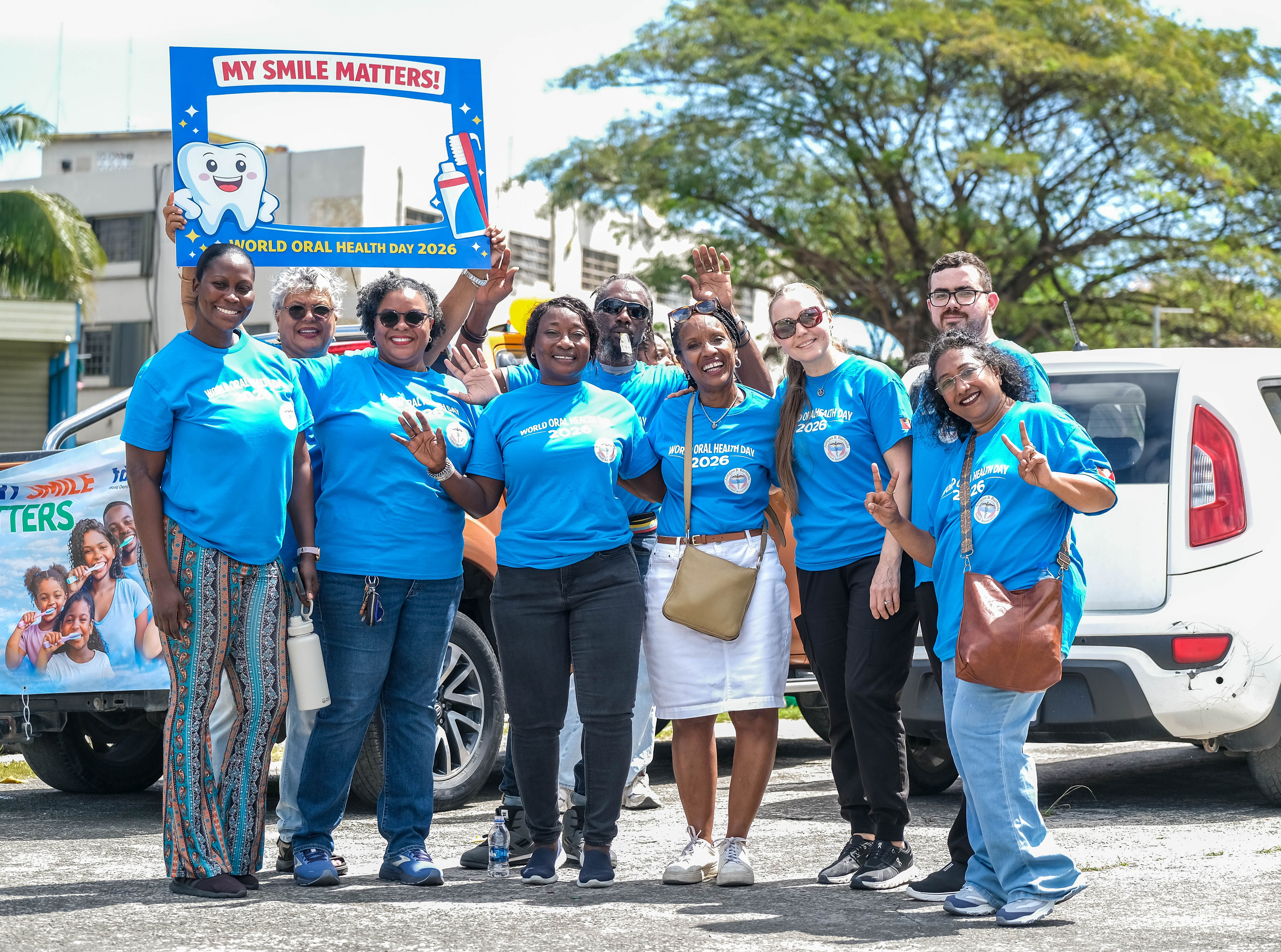 Promotion began with radio advertisements featuring Toothie, the official FDI mascot, ending with our parade message and helping to build public anticipation and awareness. The parade opened with our police escort, followed by the Bon Appétit Drum Corps and bold 3 ft by 6 ft banners displaying the World Oral Health Day message and the logos of ABDA and FDI. The procession featured Toothie, fruits, vegetables, Mr. Toothpaste, and other costumed characters; 50 children from our Sunny Smiles schools accompanied by teachers; dentists walking and driving; and two decorated trucks carrying banners with messages such as “Your Smile Matters” and “Drink Water, Eat Fruits and Vegetables,” along with the 2026 slogan. Eighteen medical students from the University of Health Sciences Medical School participated, along with volunteers, first responders, and the Antigua and Barbuda Red Cross ambulance, one of our coalition partners. Participants wore blue World Oral Health Day T-shirts, while the costumes, music, movement, and color brought oral health and nutrition education to life. A main feature of the parade was also the photo frames taken with people who were lining the streets. They enjoyed having their pictures taken. Over 1,000 toothbrushes and toothpaste were given out along with 43 certificates for dental cleanings.