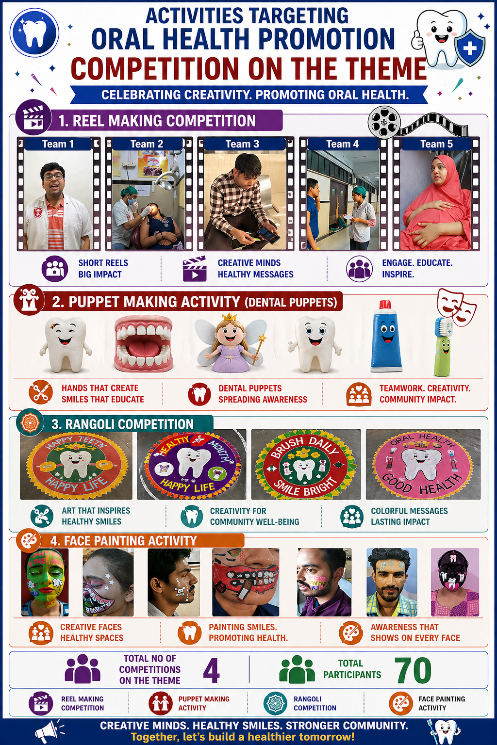 Creative engagement plays a pivotal role in strengthening health promotion by transforming knowledge into meaningful expression. In academic settings, such initiatives encourage students to internalize public health messages while enhancing their communication and advocacy skills. In alignment with the global vision of the FDI World Dental Federation and the theme “A Happy Mouth is a Happy Life”, the Creative Smile Fest was organized as an innovative platform to integrate oral health promotion with creativity, expression, and student participation. The event aimed to inspire future dental professionals to become effective oral health ambassadors, using creative mediums to spread awareness and influence community behaviour.