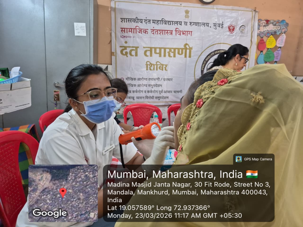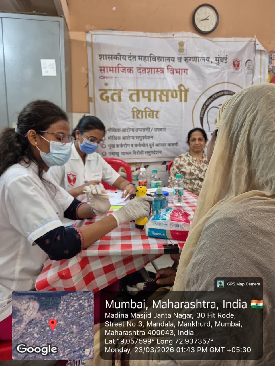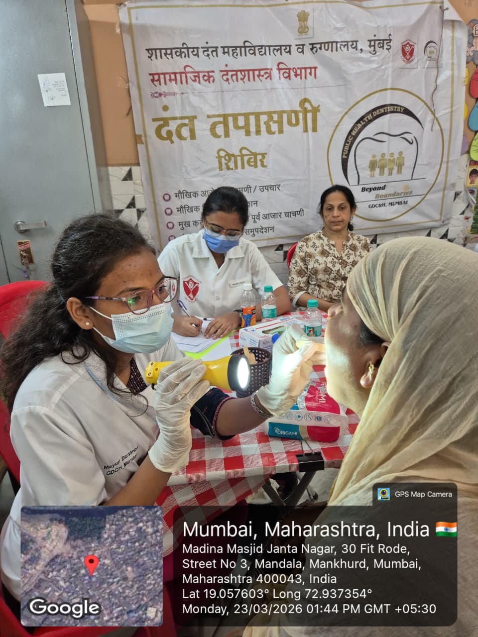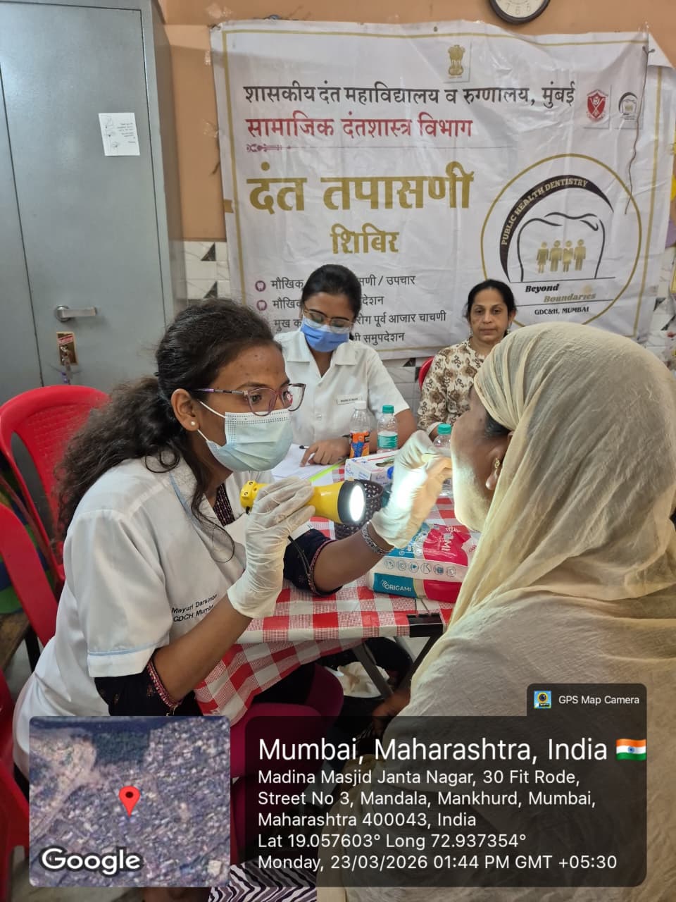 Oral health continues to be a major public health concern among underserved urban communities, where limited access to care, lack of awareness, and high prevalence of risk factors contribute to a significant burden of preventable diseases. As part of the World Oral Health Day 2026 campaign, and in alignment with the global initiative, “A Happy Mouth is a Happy Life”, the Department of Public Health Dentistry, Government Dental College & Hospital, Mumbai, conducted a comprehensive Oral Health Screening and Education Camp at Madina Masjid, Janta Nagar, 30 Road, Mandala, Mankhurd. This outreach initiative aimed to bring preventive oral healthcare services directly to the community, ensuring accessibility and early intervention.