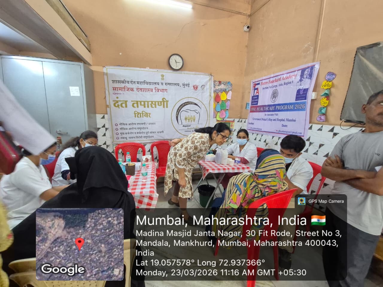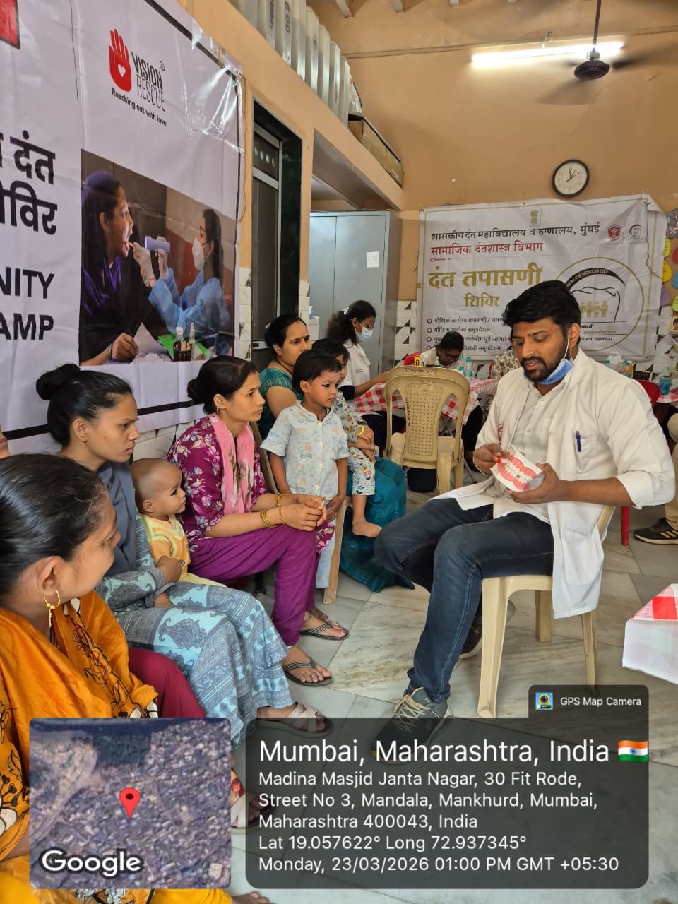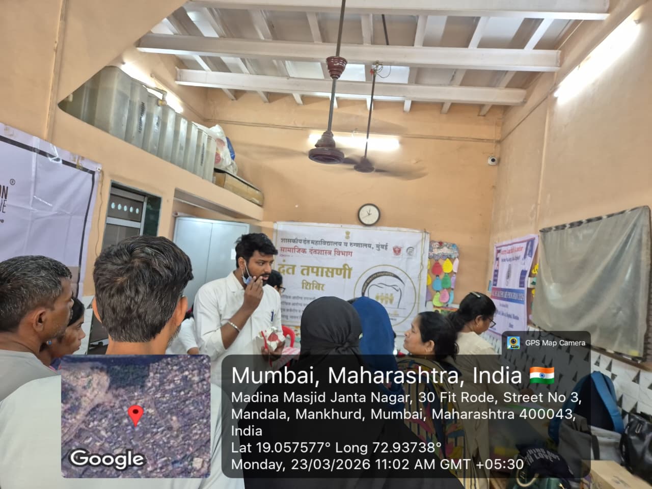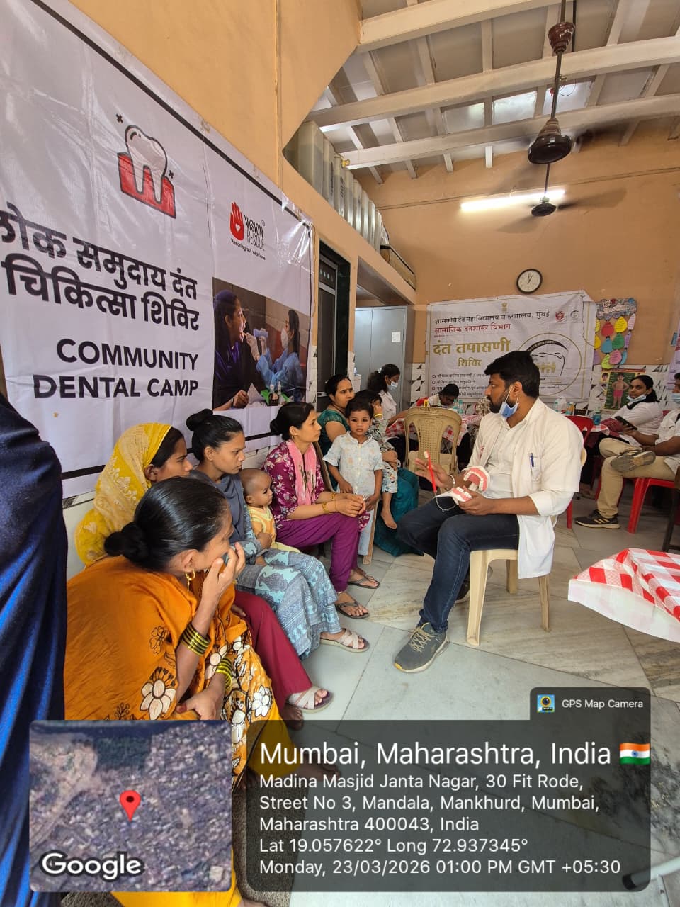 Oral health continues to be a major public health concern among underserved urban communities, where limited access to care, lack of awareness, and high prevalence of risk factors contribute to a significant burden of preventable diseases. As part of the World Oral Health Day 2026 campaign, and in alignment with the global initiative, “A Happy Mouth is a Happy Life”, the Department of Public Health Dentistry, Government Dental College & Hospital, Mumbai, conducted a comprehensive Oral Health Screening and Education Camp at Madina Masjid, Janta Nagar, 30 Road, Mandala, Mankhurd. This outreach initiative aimed to bring preventive oral healthcare services directly to the community, ensuring accessibility and early intervention.