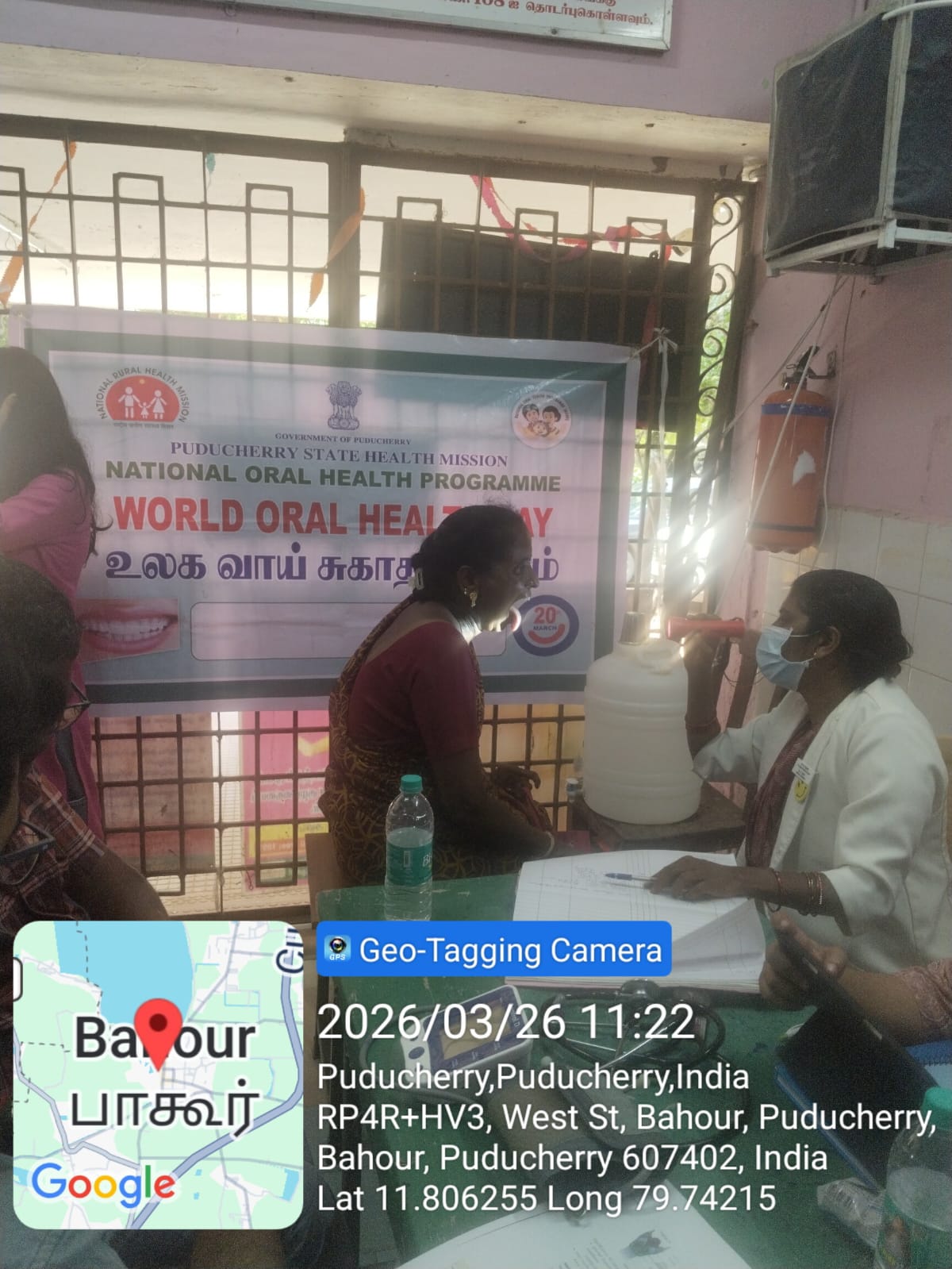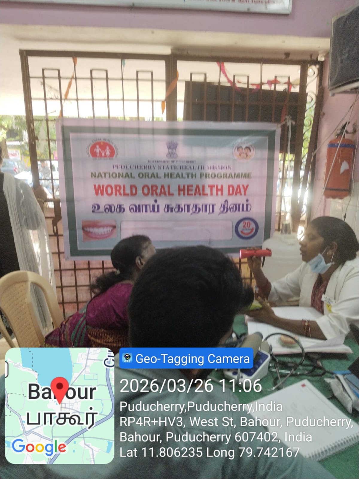 26.03.26 PHC Bahour, Oral Screening Camp ,WOHD 2026World Oral Health Day celebration dental awareness session was conducted for the well baby clinic mothers and general public. The theme “ Happy Mouth is a Happy Life" was explained, highlighting the importance of maintaining good oral hygiene, early detection of dental problems, and promoting oral health awareness among the community participated and gained useful knowledge. On account of World Oral Health Day the theme " A happy mouth is a happy life"& Oral health pamplets distributed.