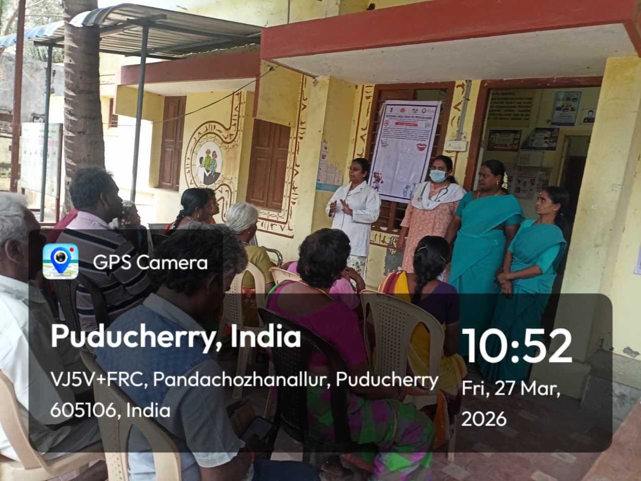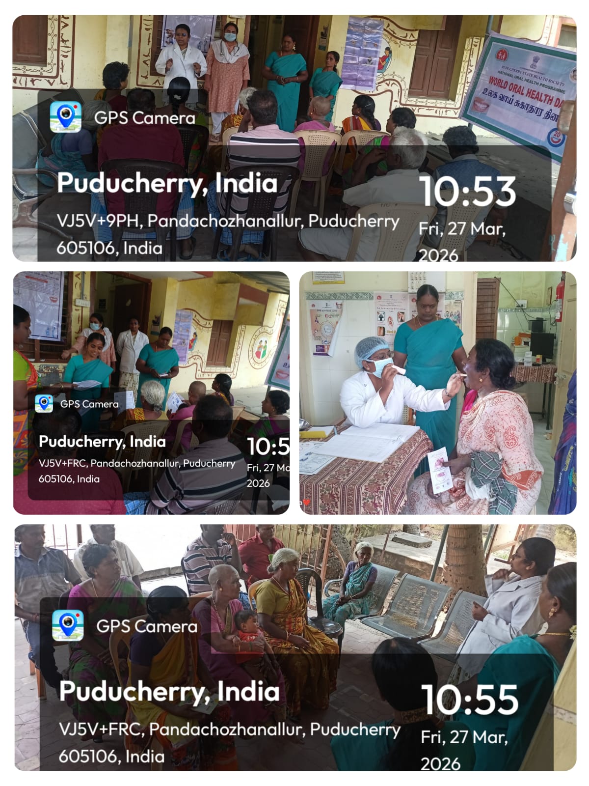 27/3/26 Dental unit- PHC Nettapakkam # WOHD 26 Celebration @ SUBCENTRE PANDASOZHANALLU.The NCD patients were given awareness on Oral Health and its relationship to overall wellness. Do's and don'ts in oral care were explained. Brushing techniques were demonstrated using dental models and posters. Ill effects of Tobacco and its vulnerability among adolescents were highlighted. Role of TCC services and NRT gums availability at the facility were stressed upon. Oral hygiene pledge was taken. Oral screening was done and referred to dental OPD, PHC Nettapakkam for dental management. Oral health and insights of Tobacco pamphlets were distributed for good oral hygiene practices and healthy living.Beneficiaries: 17