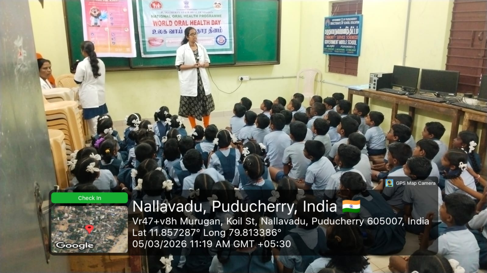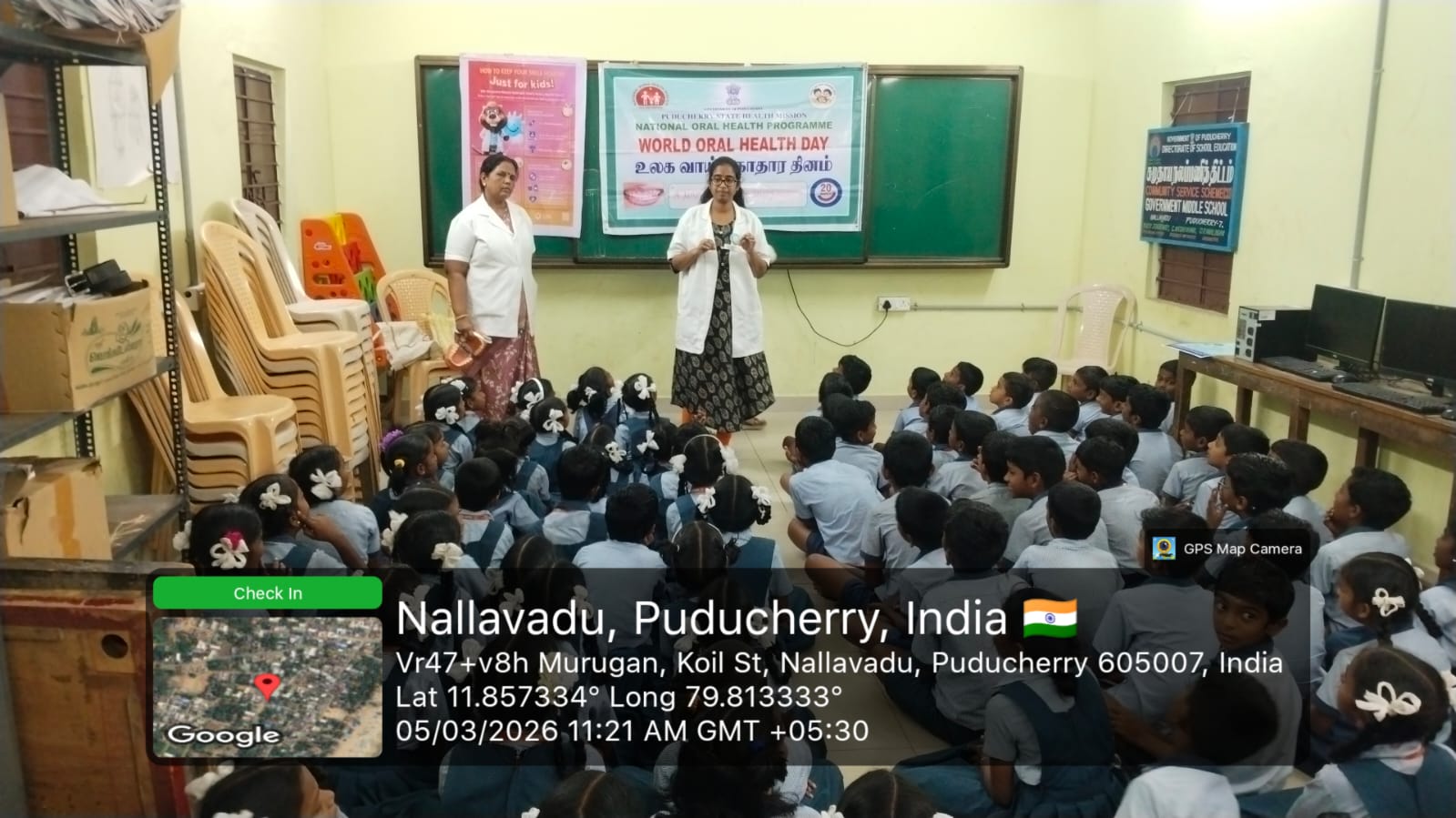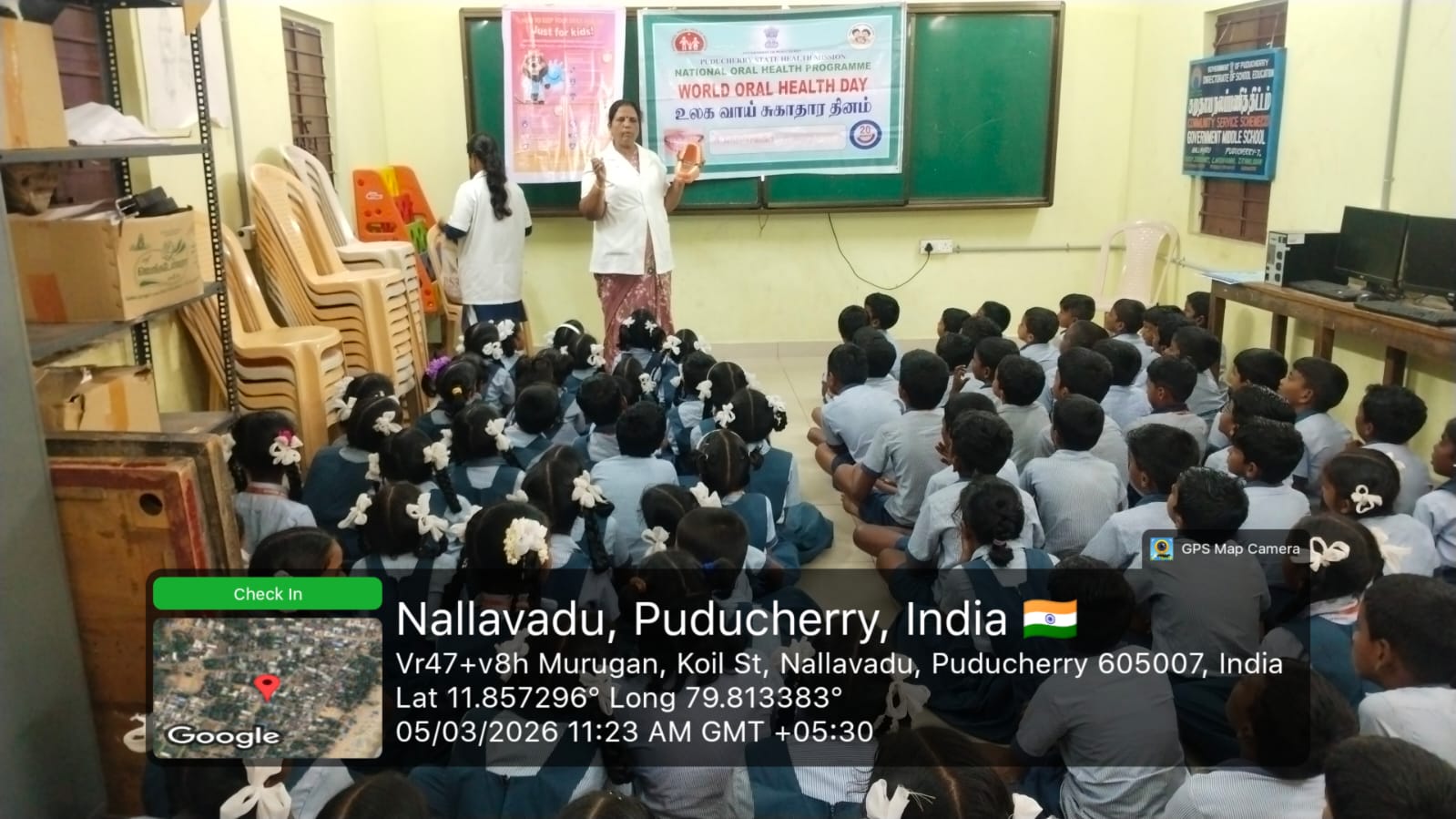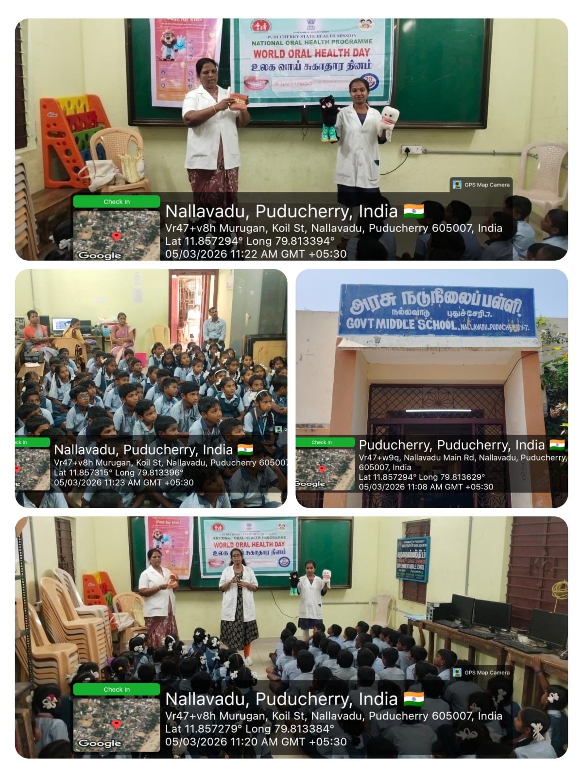 As a part of World Oral Health Day celebrations, an oral health awareness programme was conducted at *Government Middle School, Nallavadu* on 05.03.2026. The session aimed to educate school students about the importance of maintaining good oral hygiene for overall health. Students were taught about proper tooth-brushing habits, healthy food choices, and the prevention of common dental problems such as tooth decay and gum diseases. A brushing technique demonstration was carried out using a *Toothie* model, which helped students clearly understand the correct method of brushing. The programme encouraged children to practice good oral hygiene daily. Nearly *118* benefited from this awareness session