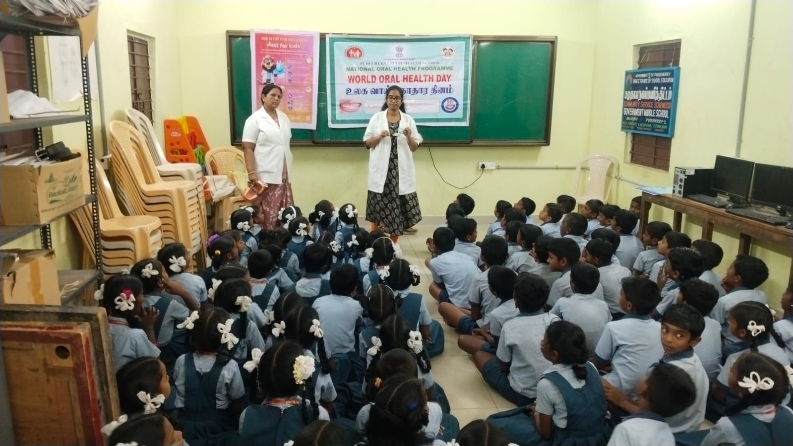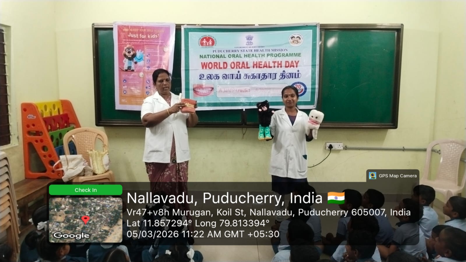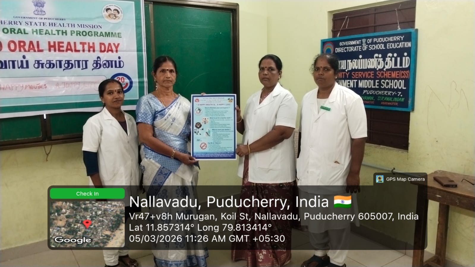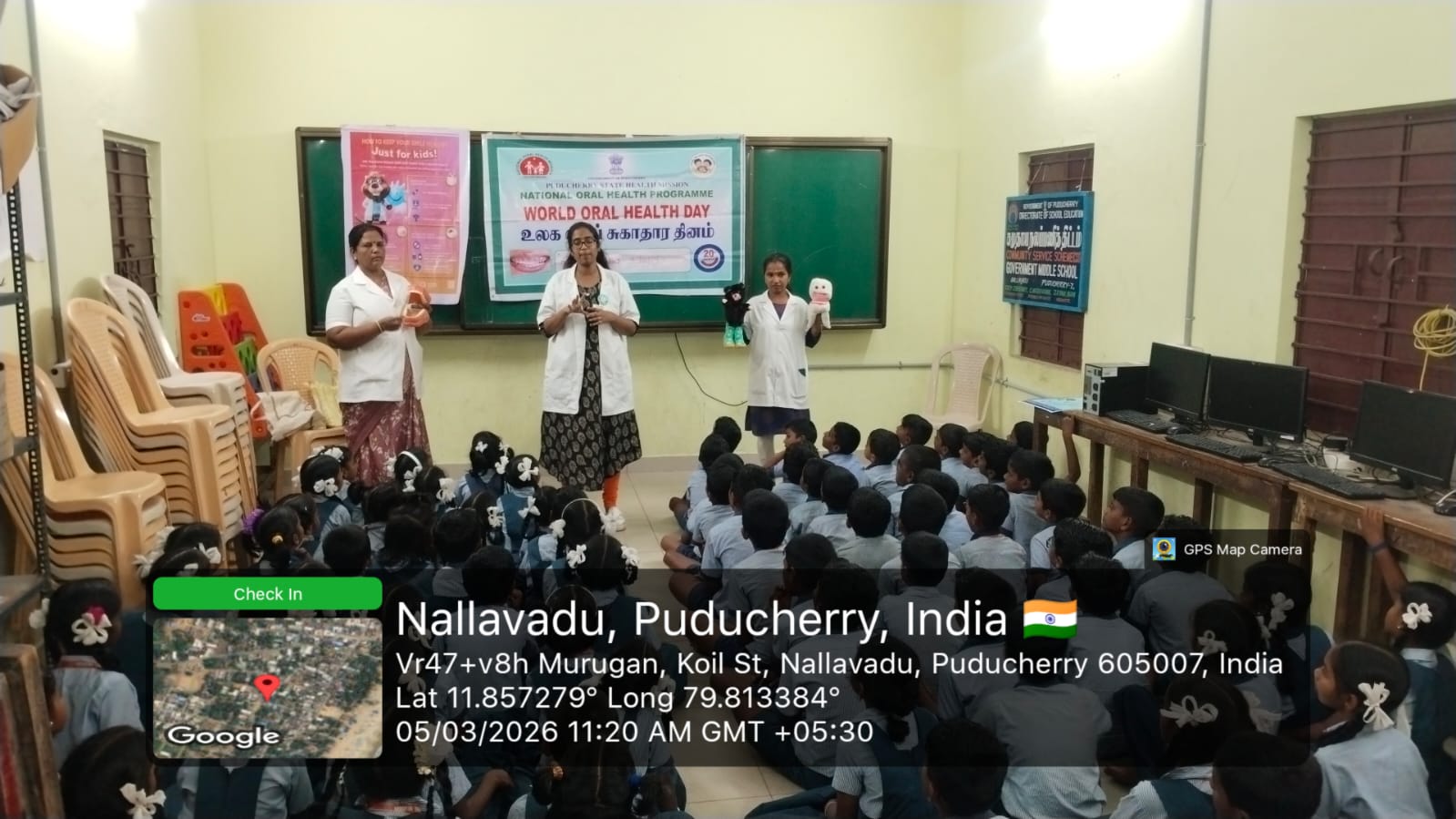 As a part of World Oral Health Day celebrations, an oral health awareness programme was conducted at *Government Middle School, Nallavadu* on 05.03.2026. The session aimed to educate school students about the importance of maintaining good oral hygiene for overall health. Students were taught about proper tooth-brushing habits, healthy food choices, and the prevention of common dental problems such as tooth decay and gum diseases. A brushing technique demonstration was carried out using a *Toothie* model, which helped students clearly understand the correct method of brushing. The programme encouraged children to practice good oral hygiene daily. Nearly *118* benefited from this awareness session