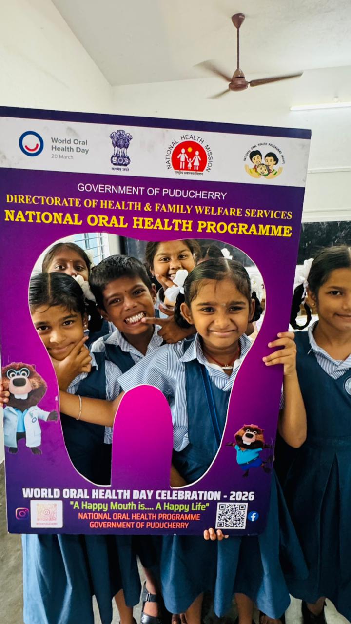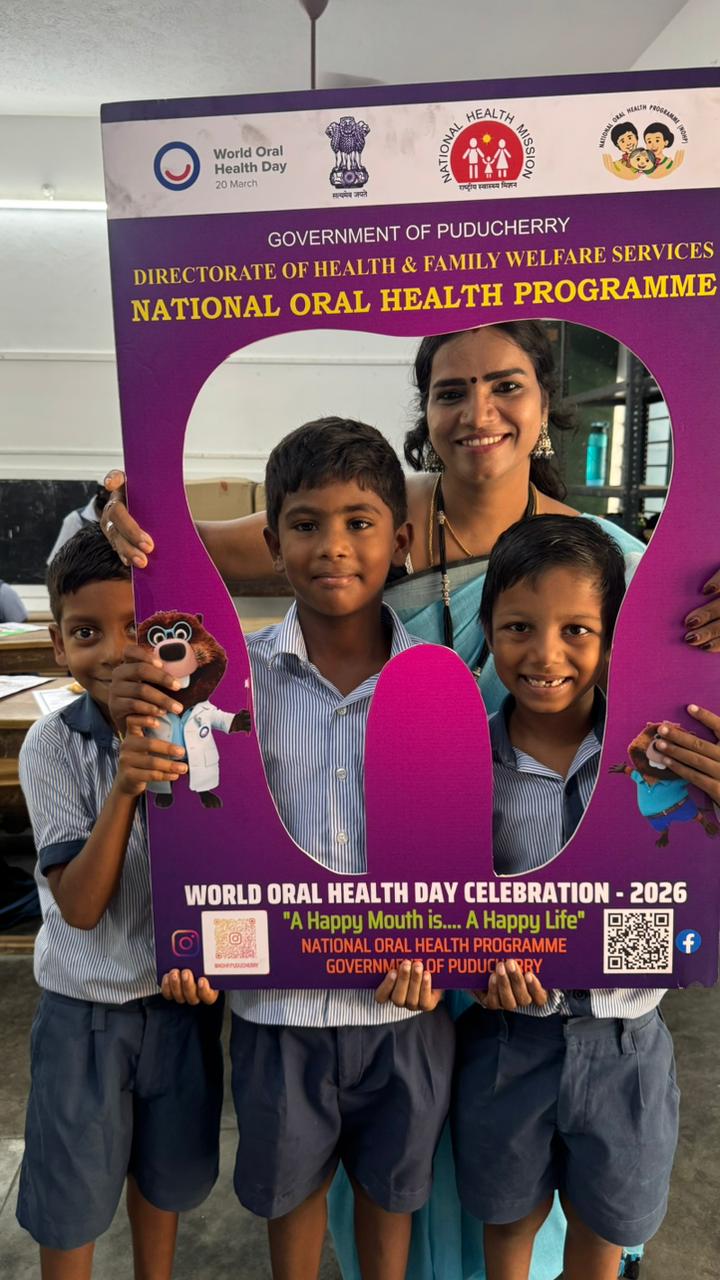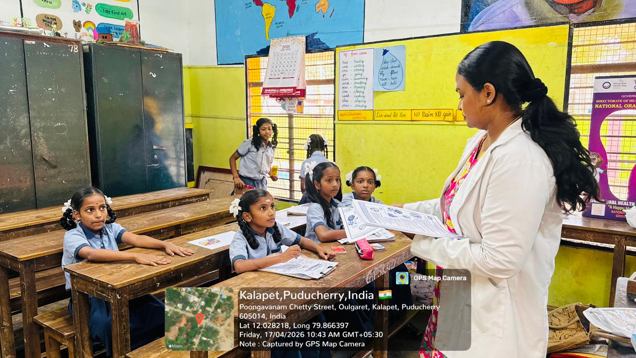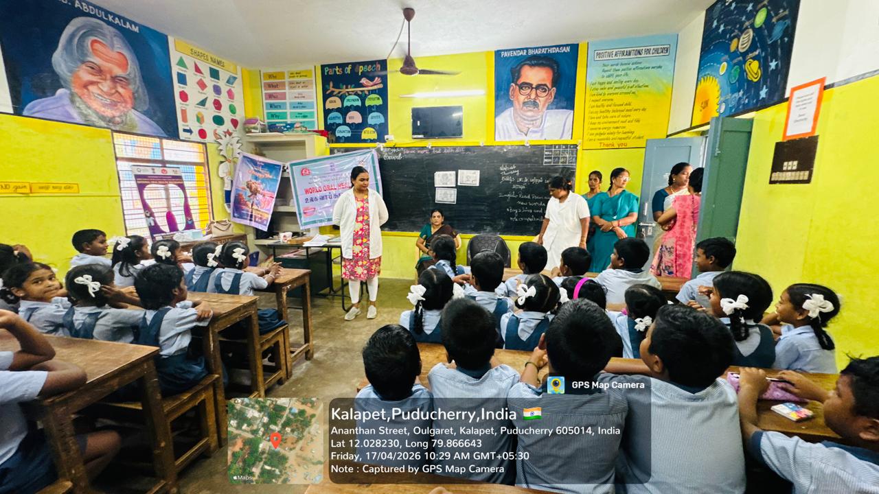 On behalf of World Oral Health Day 2026, an oral health awareness camp was conducted at Government Primary School, Kalapet Kuppam for students of 3rd, 4th, and 5th standards.