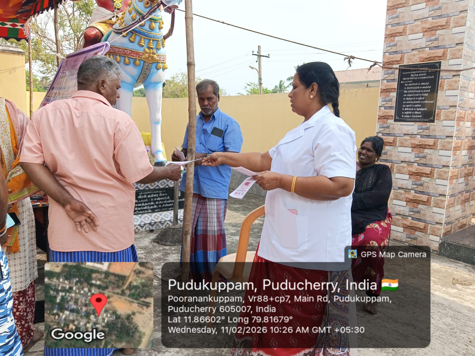 An *Oral Screening* and *Oral Awareness* Camp was successfully organized at Pudukuppam - Community hall in collaboration with the *Pondicherry AIDS Control Society (PACS)* and *National AIDS Control Organization (NACO).* The event formed part of an *Integrated Health Camp* held on February 7, 2026.