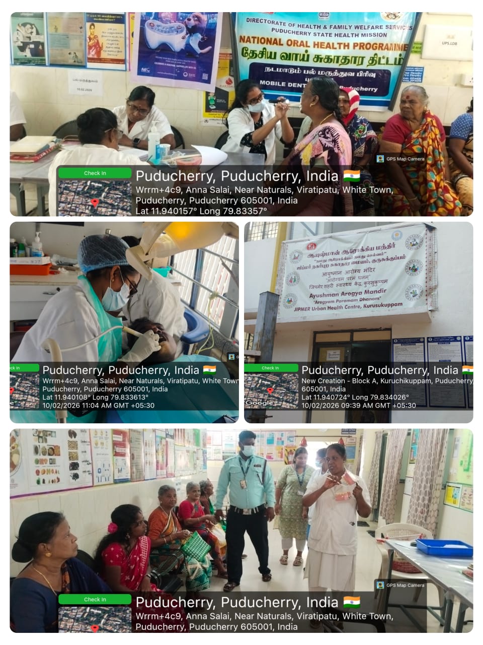 An oral screening and treatment camp was conducted at *AAM JIPMER Urban Health Centre, Kurusukuppam* on 10-02-2026. During the camp, oral health screening was carried out for patients attending the *NCD* clinic. The patients were examined for dental caries, gum diseases, oral infections, and early signs of oral cancer. Necessary treatment such as oral prophylaxis, medication advice, and referral for advanced care were provided based on individual needs. Oral health awareness was also given to the patients, emphasizing the importance of maintaining good oral hygiene to prevent complications related to diabetes, hypertension, and other non-communicable diseases. Instructions on correct brushing technique, healthy dietary habits, and harmful effects of tobacco and alcohol use were explained. IEC materials were displayed to reinforce key messages. Nearly *47* beneficiaries attended and benefited from the screening, treatment services, and health education provided during the camp.