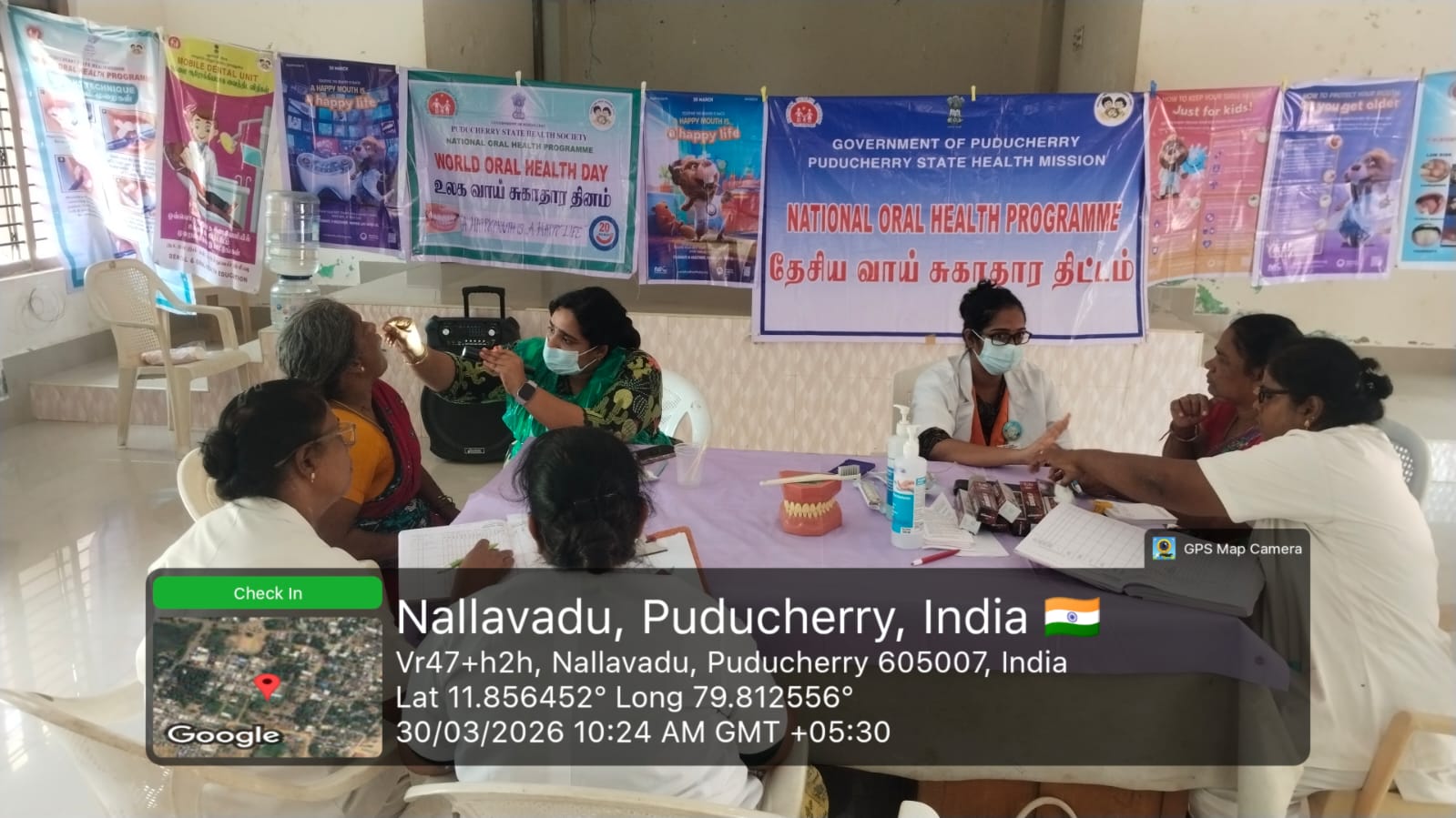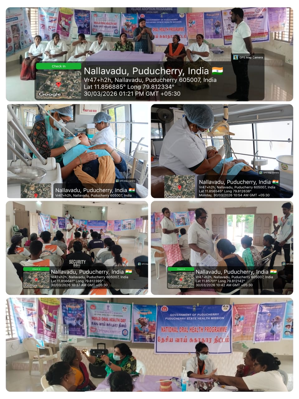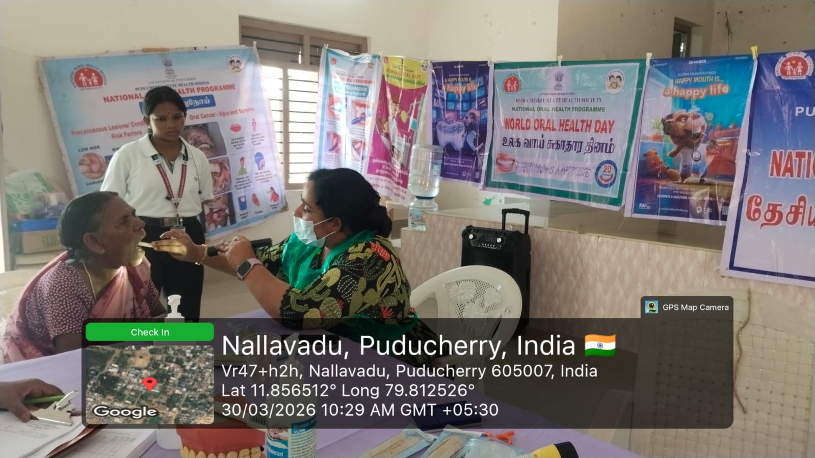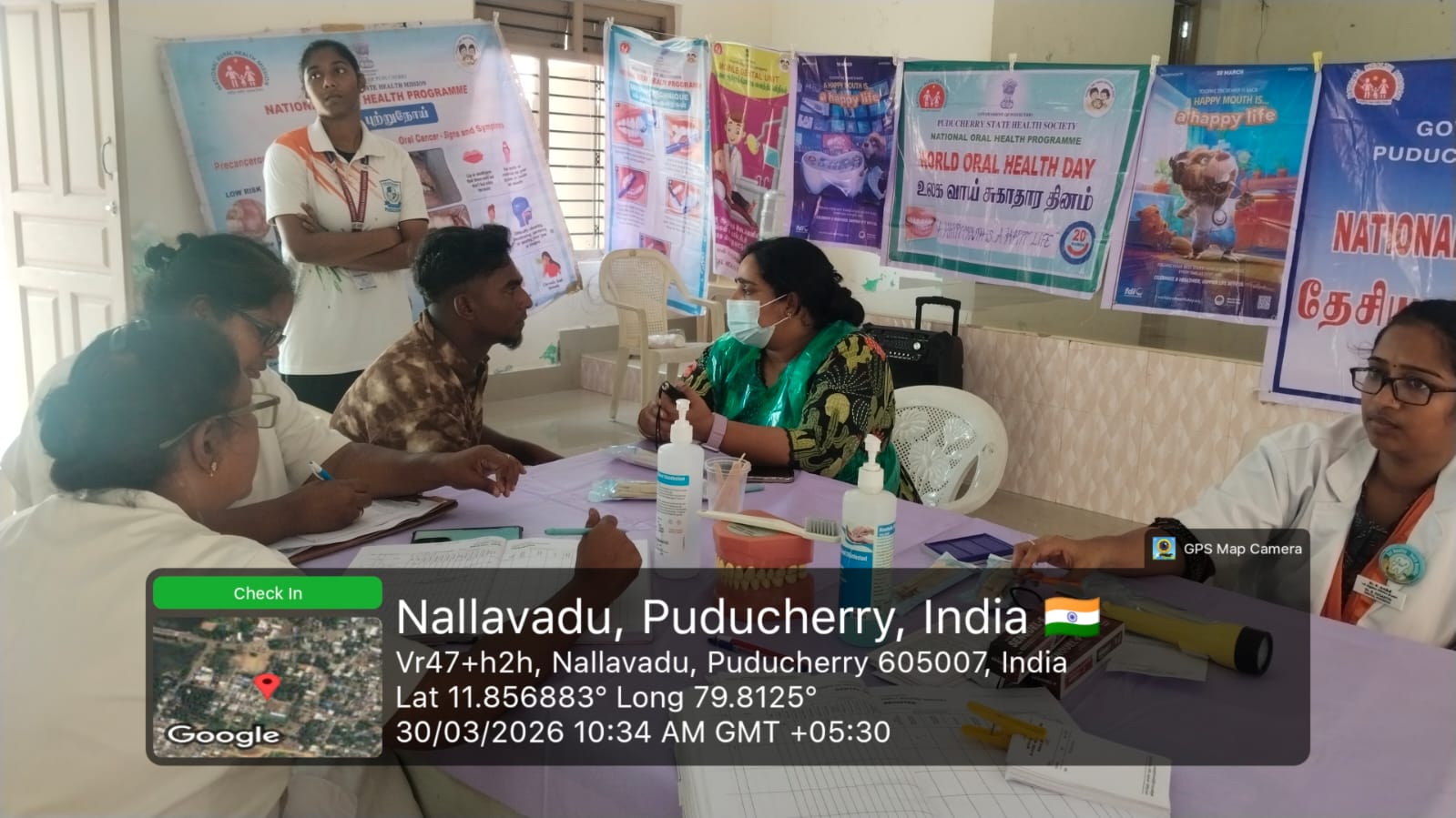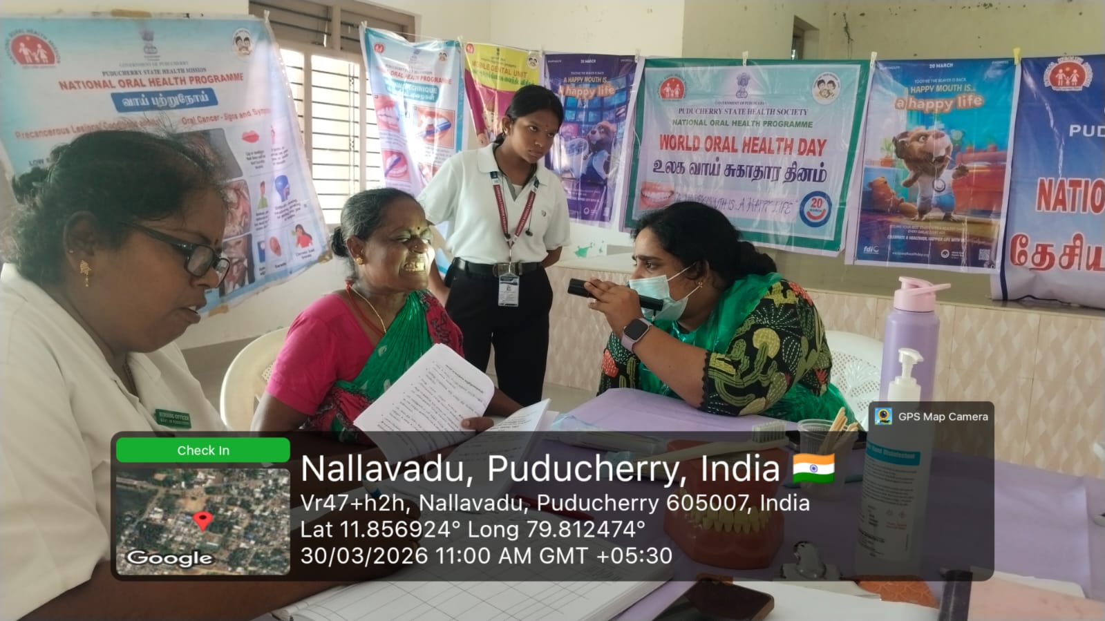 On the occasion of *World Oral Health Day* and the *World TB Day 100 Days Campaign,* a special oral screening and treatment camp was successfully conducted for the general public at the Community Hall, *Nallavadu* , in collaboration with the NSS team of *RR University,* Murungapakkam Campus on 30/03/2026.