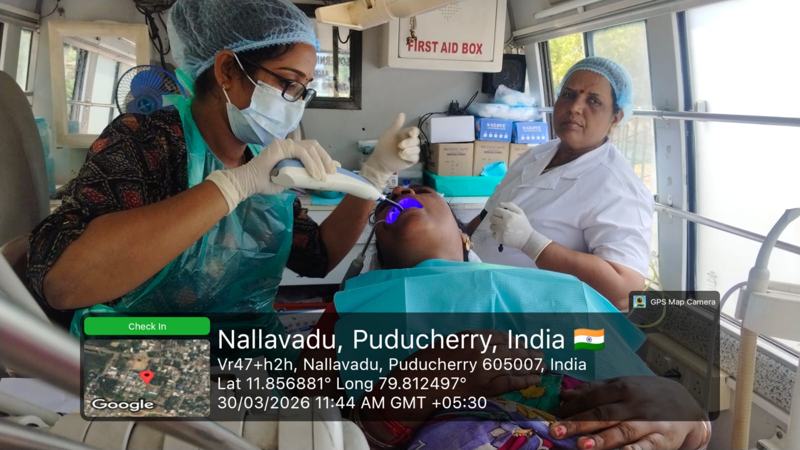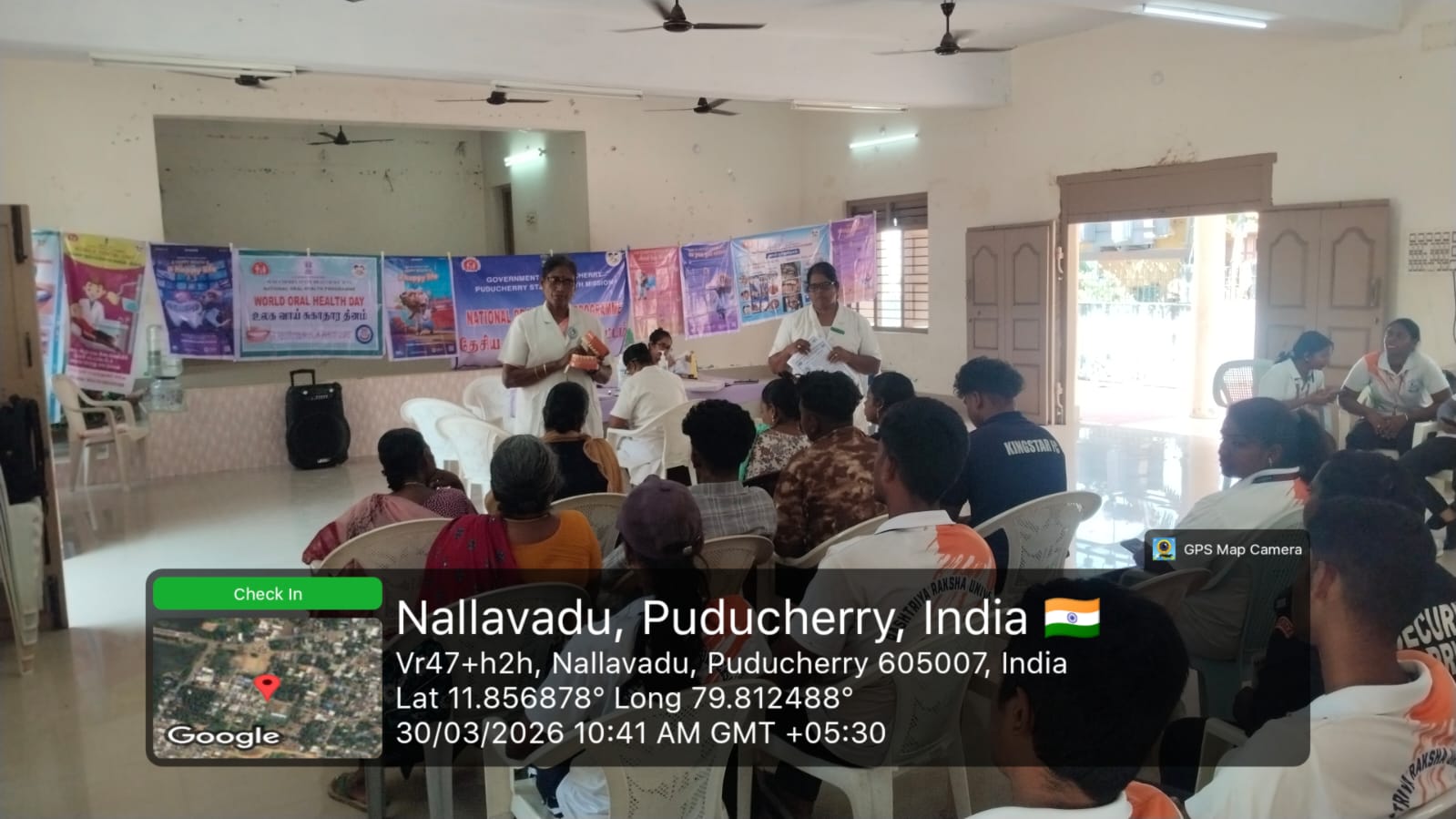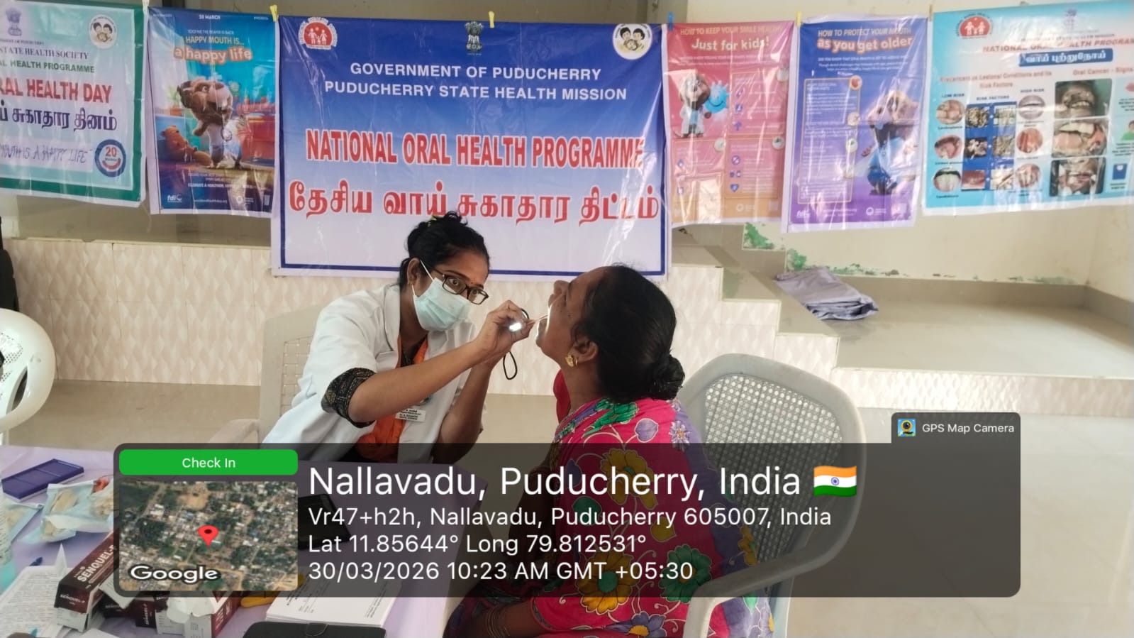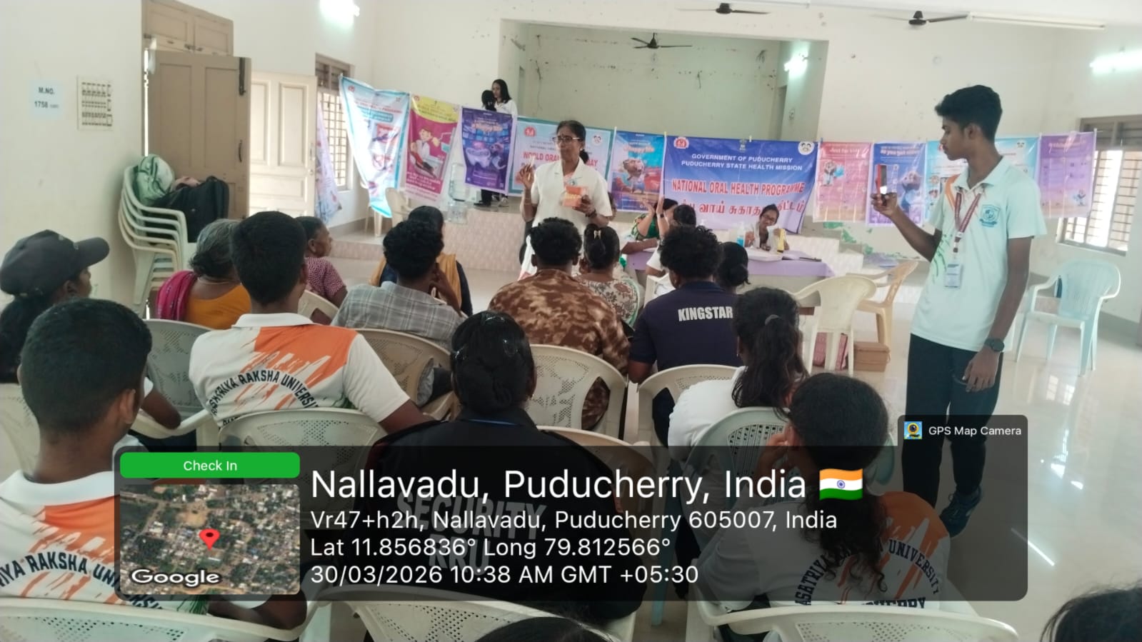 On the occasion of *World Oral Health Day* and the *World TB Day 100 Days Campaign,* a special oral screening and treatment camp was successfully conducted for the general public at the Community Hall, *Nallavadu* , in collaboration with the NSS team of *RR University,* Murungapakkam Campus on 30/03/2026.
