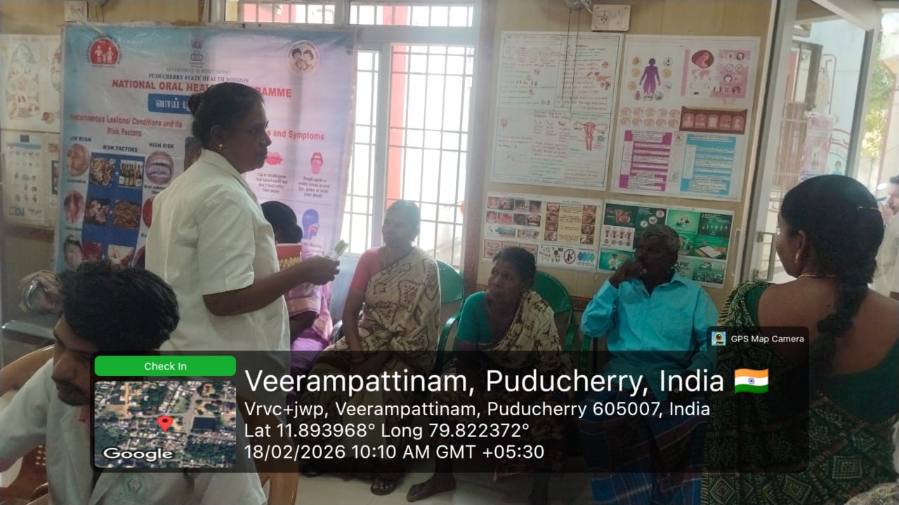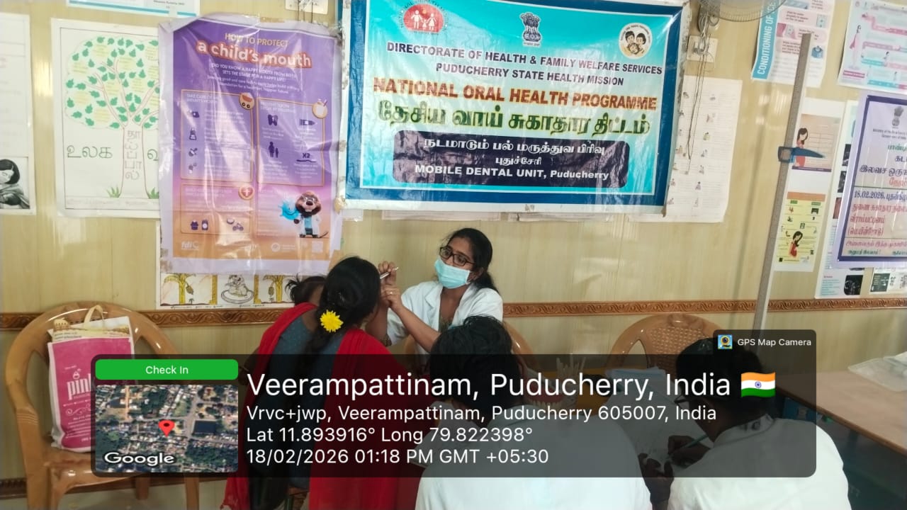 An oral screening camp was conducted at *Periyaveerampattinam* on 18-02-2026 as part of the _Seashore Integrated Health Camp_ organized by *Pondicherry AIDS Society Organization.* The camp aimed to improve oral health awareness and provide early screening services to the coastal community. Informative fact sheets were displayed to educate the public about the harmful effects of tobacco use and the importance of maintaining good oral hygiene.