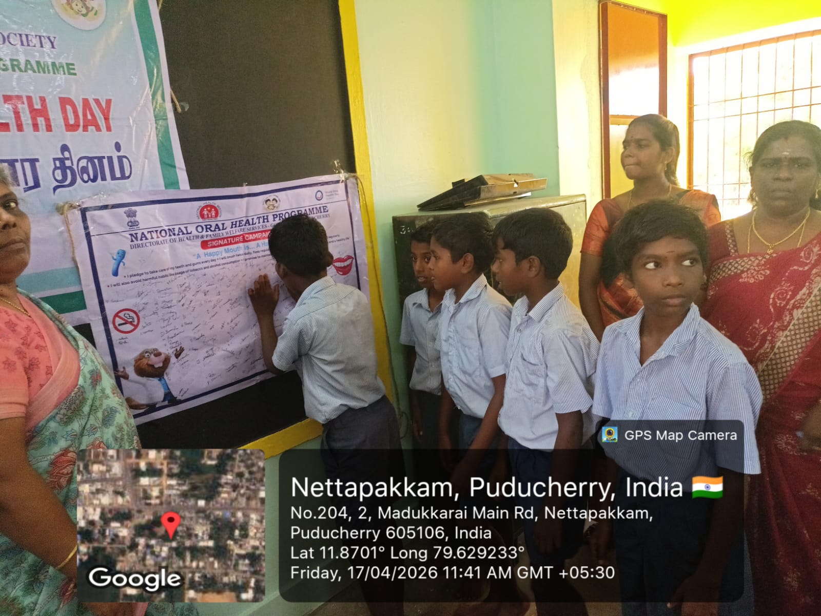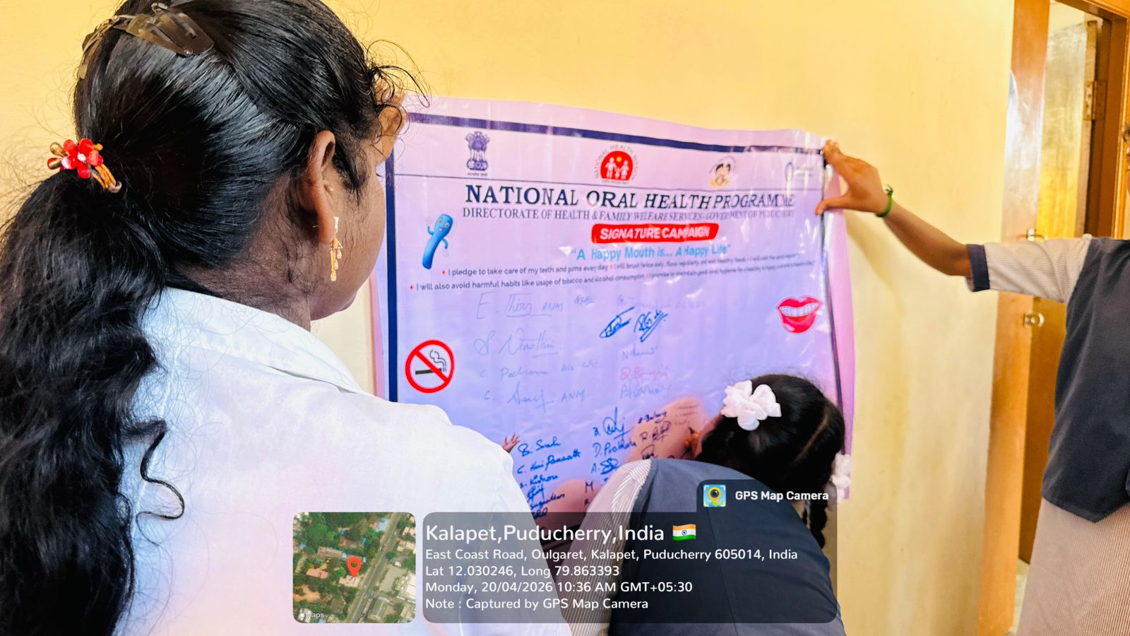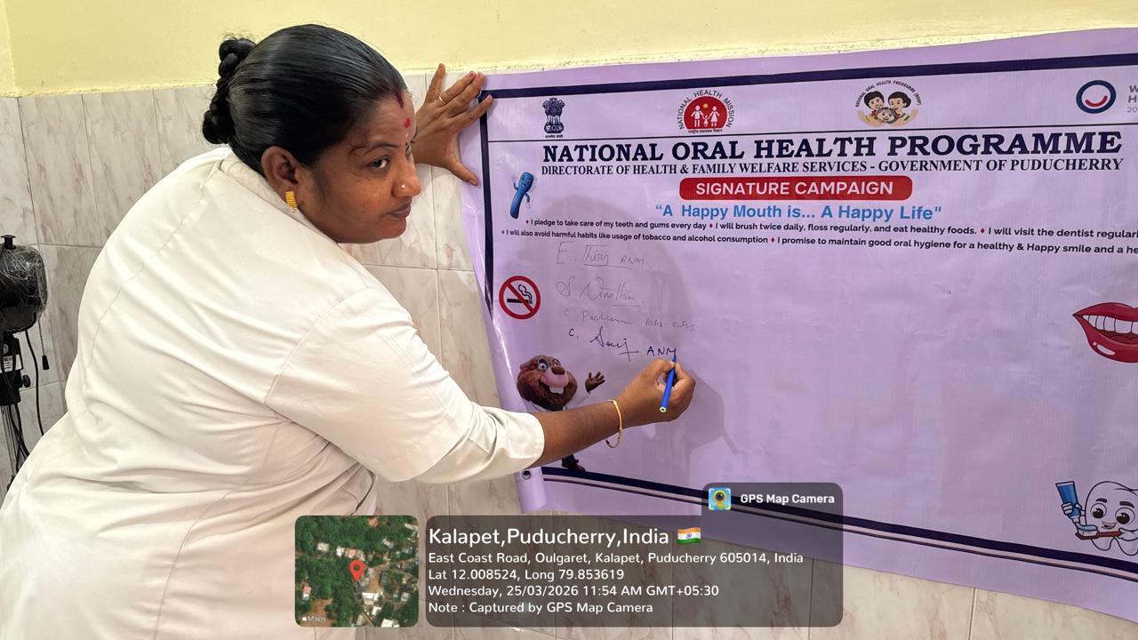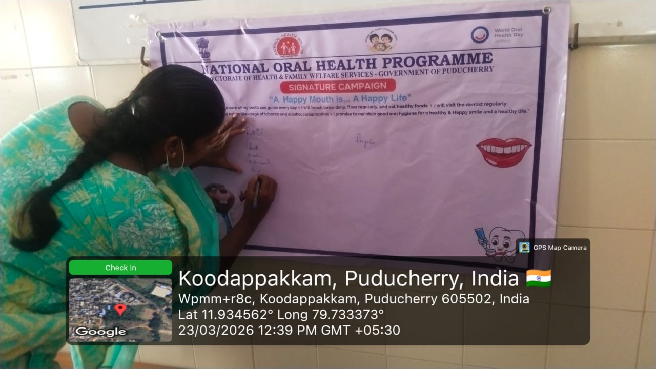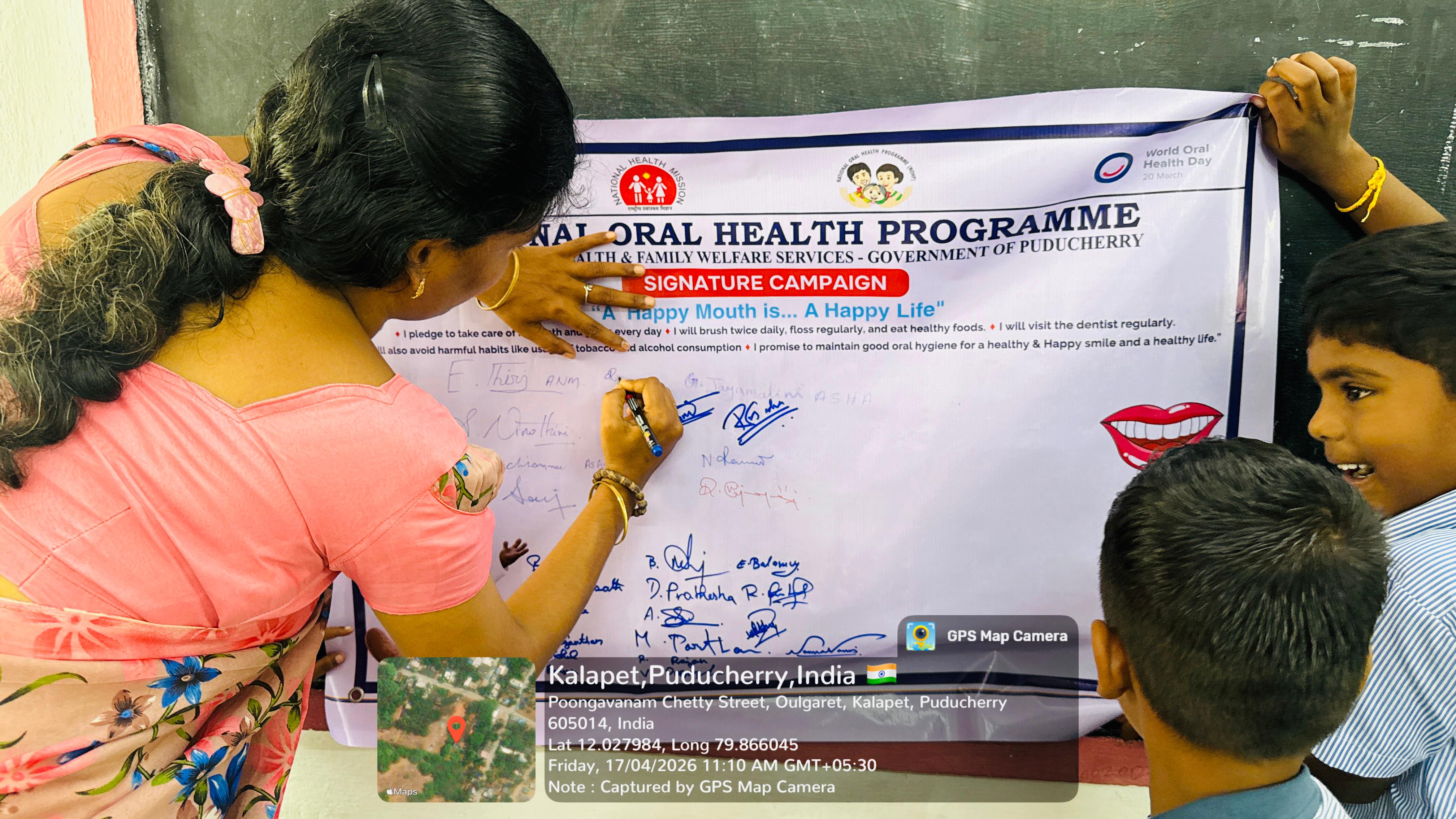 On behalf of the World Oral Health Day 2026 celebrations, *a special month-long signature campaign* was conducted from _March 20 to April 20_ based on the theme “ *A Happy Mouth is… A Happy Life.”* A well-designed banner featuring the oral health pledge was prepared and displayed at various locations to attract public participation. The campaign was carried out across organizations, educational institutions including schools, and Health and Wellness Centres, as well as public places such as Rock Beach.
