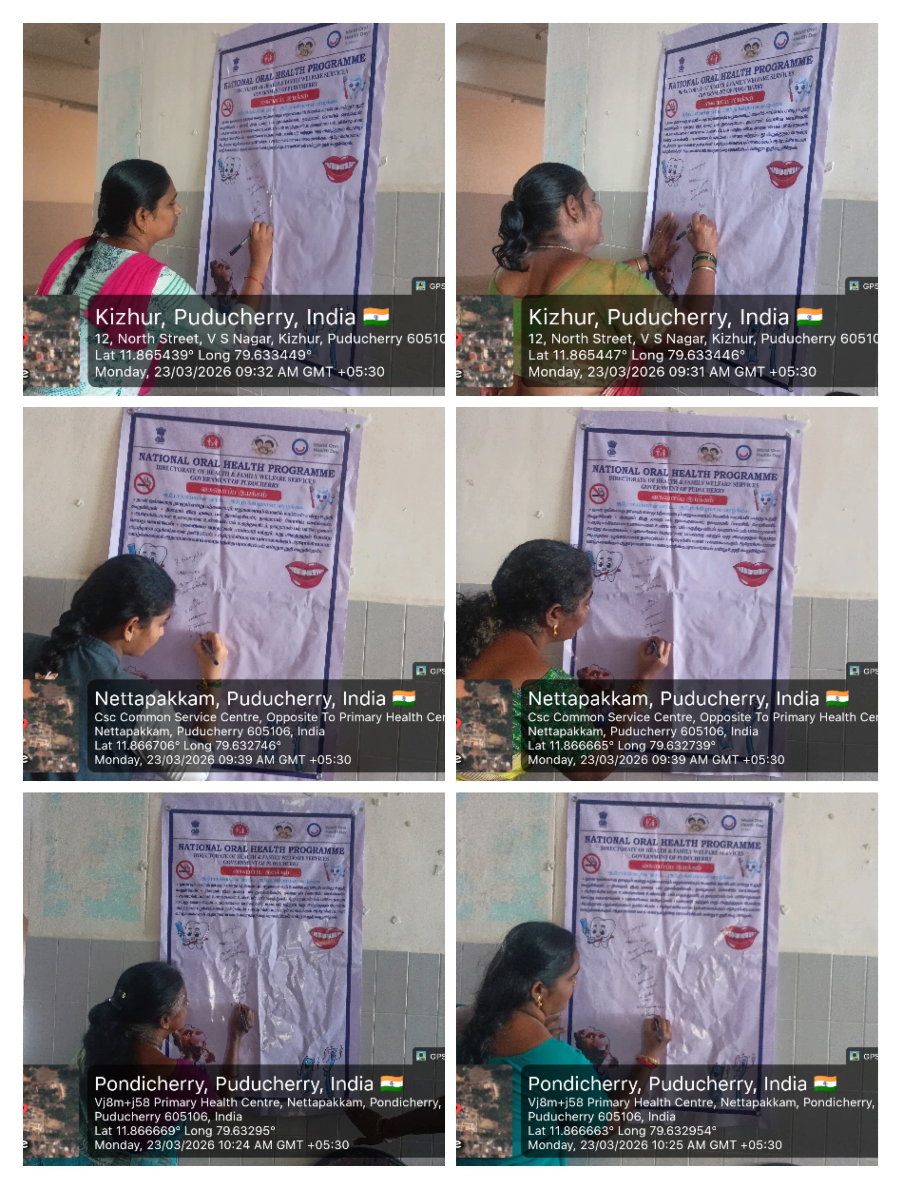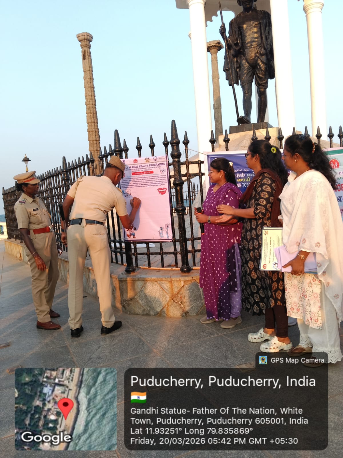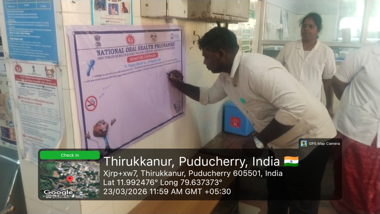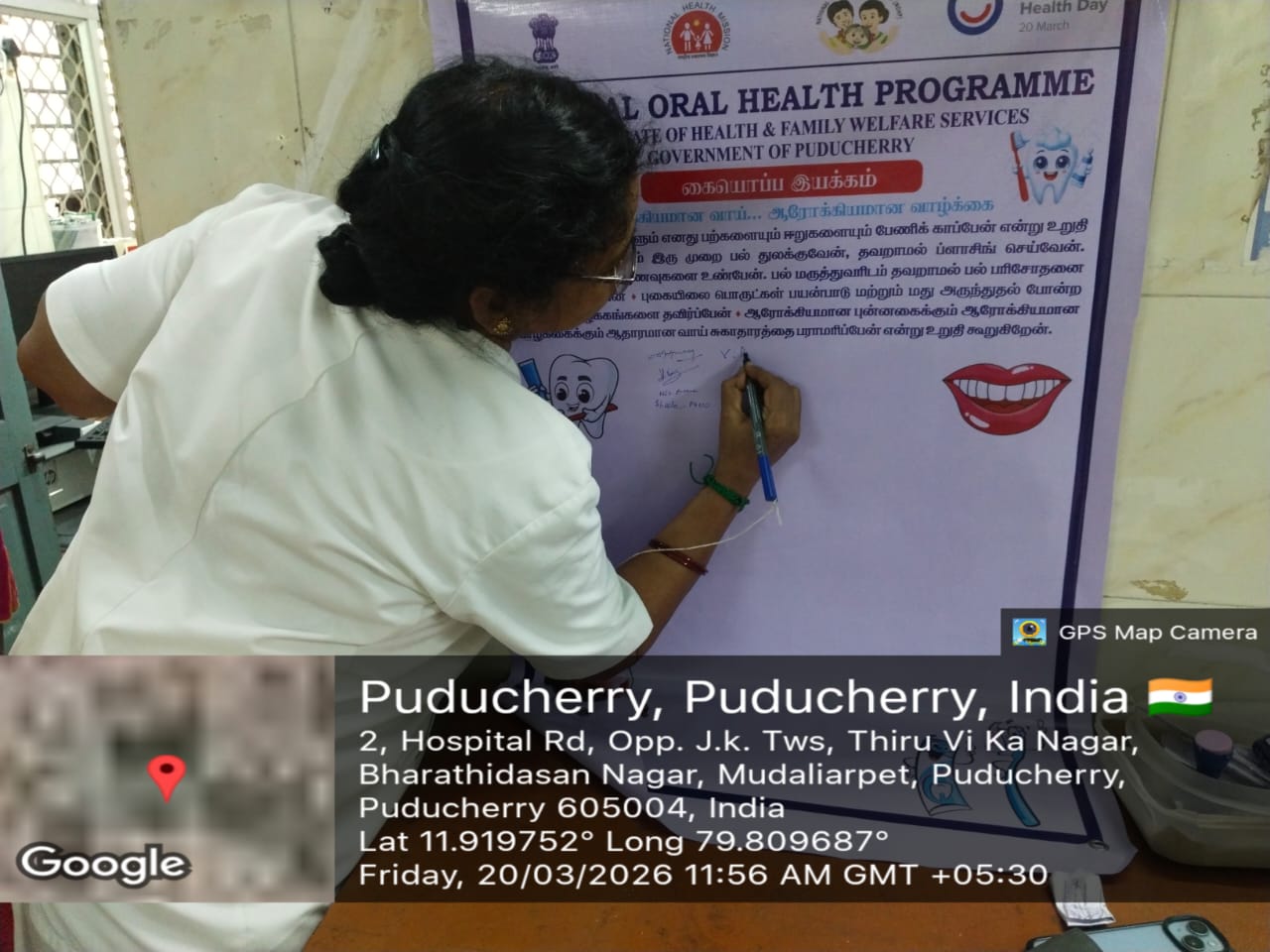 On behalf of the World Oral Health Day 2026 celebrations, *a special month-long signature campaign* was conducted from _March 20 to April 20_ based on the theme “ *A Happy Mouth is… A Happy Life.”* A well-designed banner featuring the oral health pledge was prepared and displayed at various locations to attract public participation. The campaign was carried out across organizations, educational institutions including schools, and Health and Wellness Centres, as well as public places such as Rock Beach.