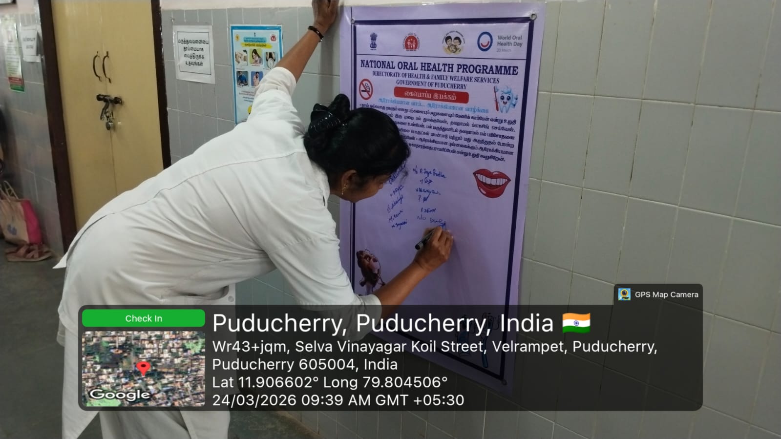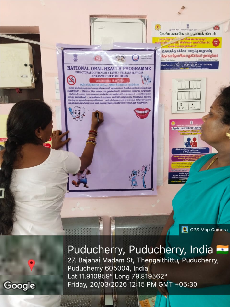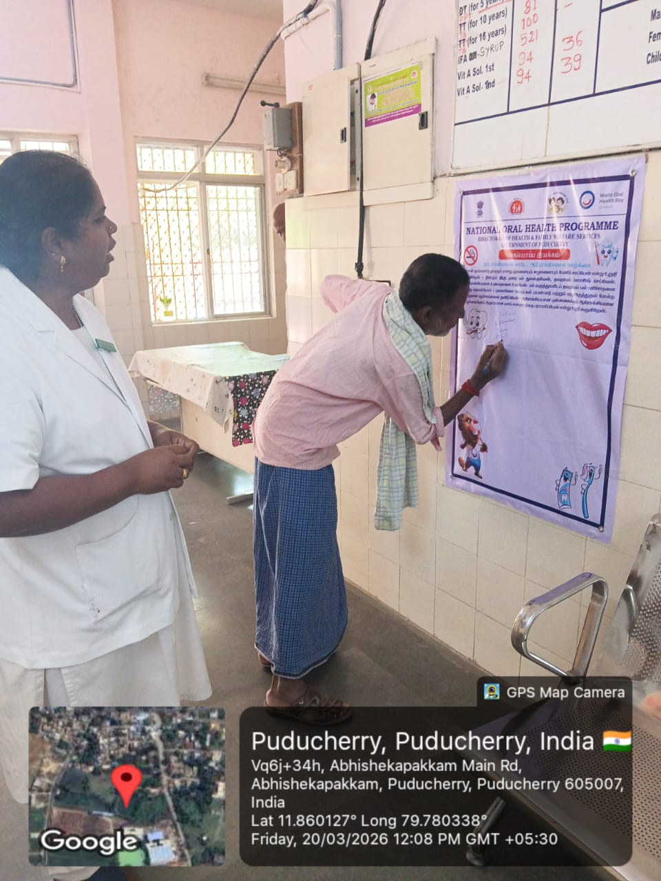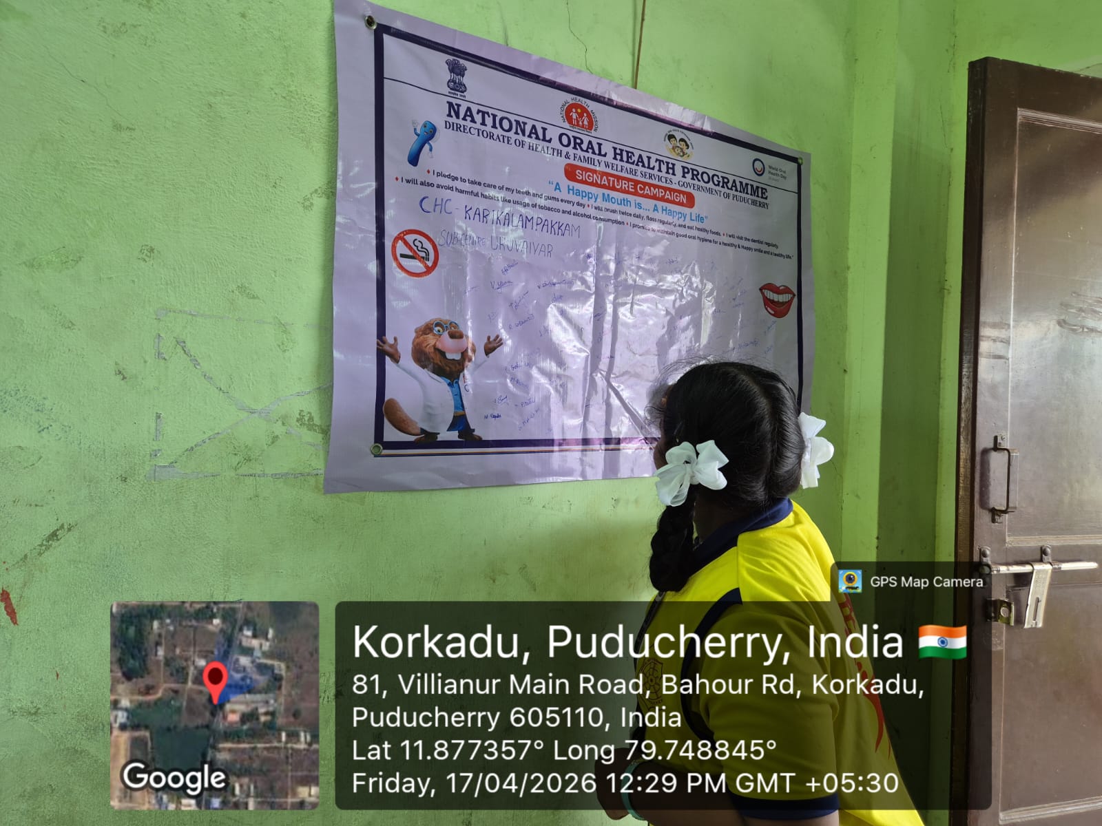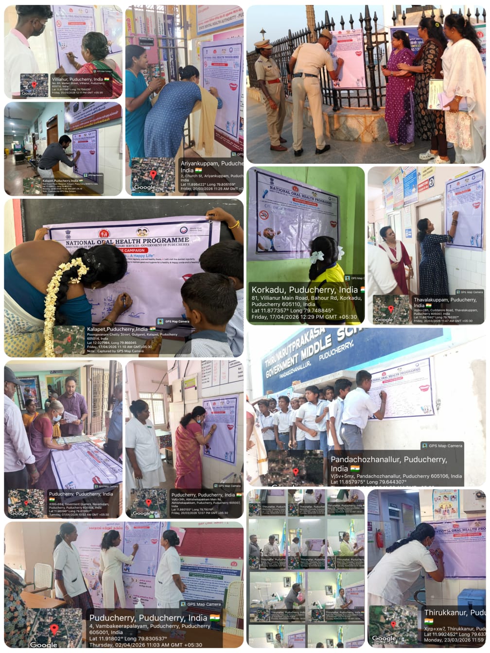 On behalf of the World Oral Health Day 2026 celebrations, *a special month-long signature campaign* was conducted from _March 20 to April 20_ based on the theme “ *A Happy Mouth is… A Happy Life.”* A well-designed banner featuring the oral health pledge was prepared and displayed at various locations to attract public participation. The campaign was carried out across organizations, educational institutions including schools, and Health and Wellness Centres, as well as public places such as Rock Beach.