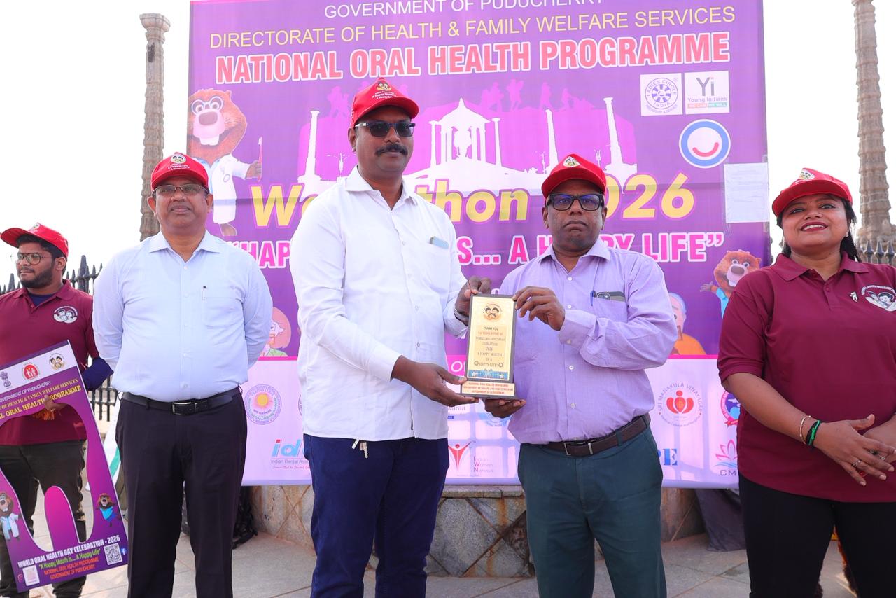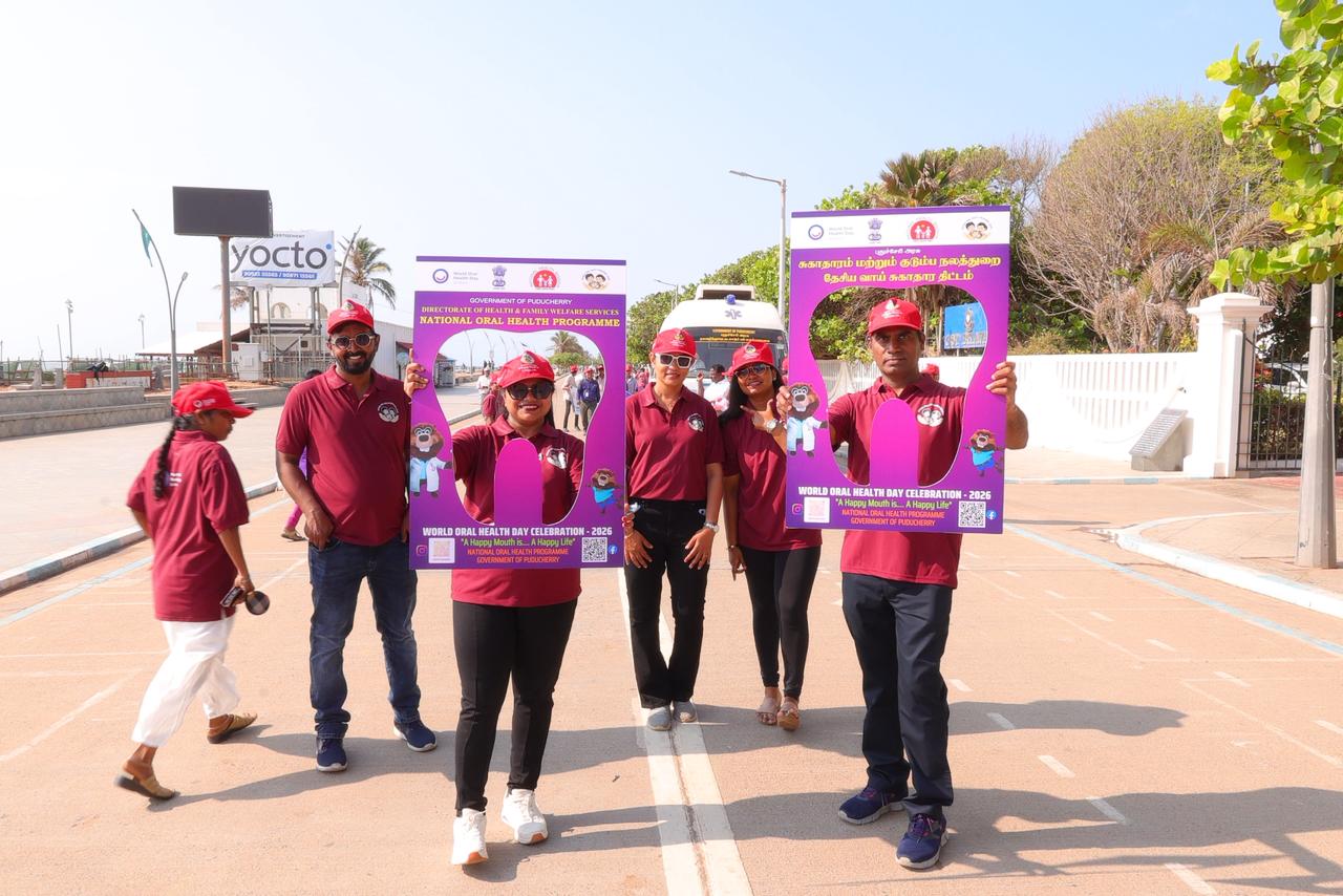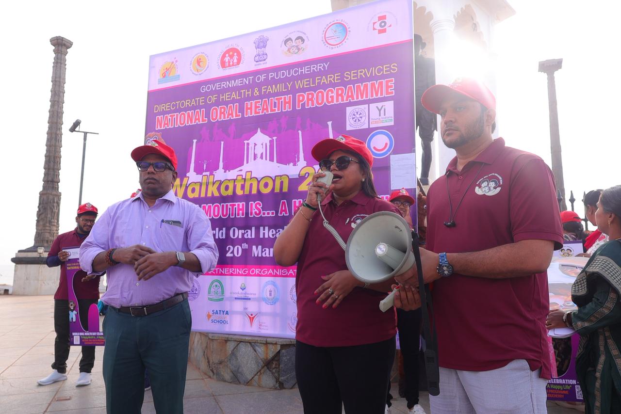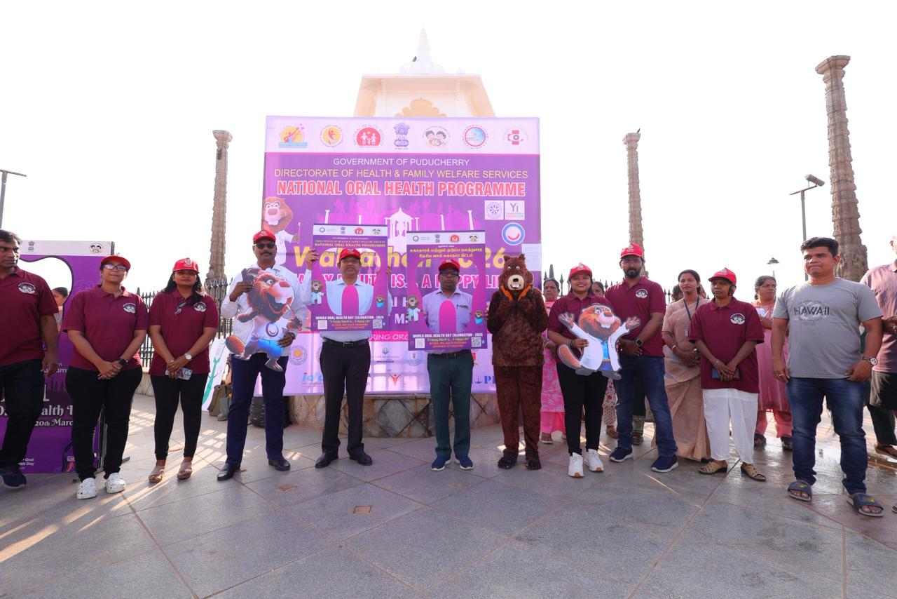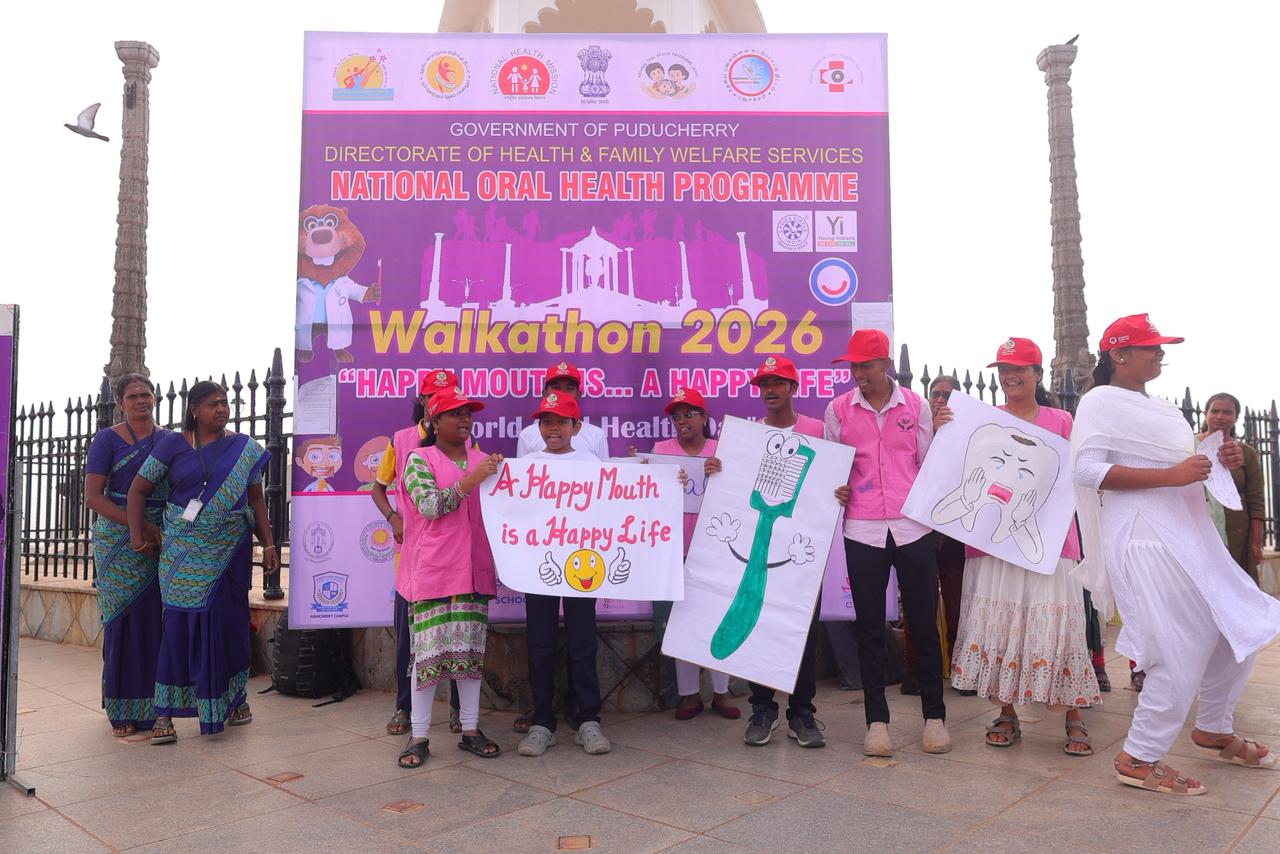 On the occasion of World Oral Health Day on March 20, an oral health awareness walkathon was conducted on March 19 under the National Oral Health Programme with the theme “A Happy Mouth is… A Happy Life.” The walkathon commenced from the Gandhi statue at Puducherry Beach and was flagged off at 8am by the Director of Health Services, Dr. Sevvel.