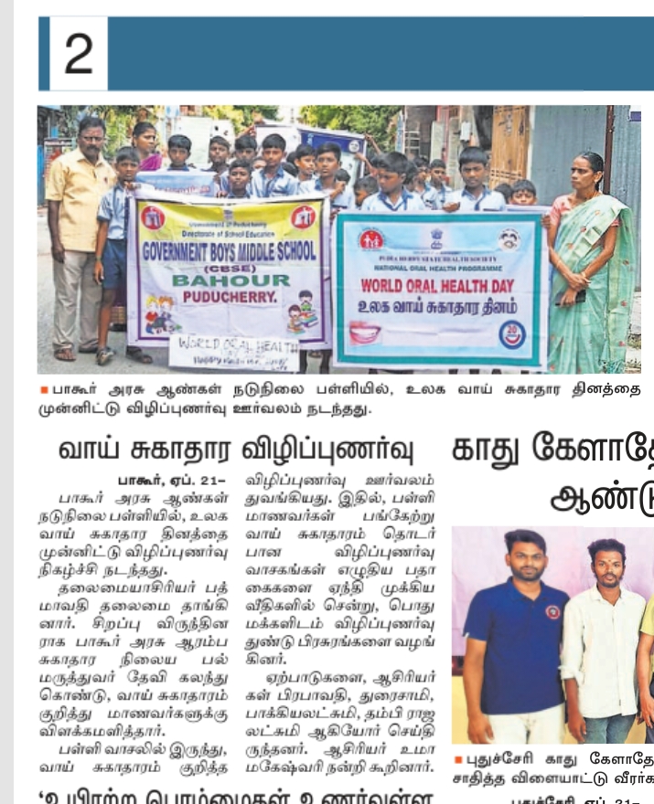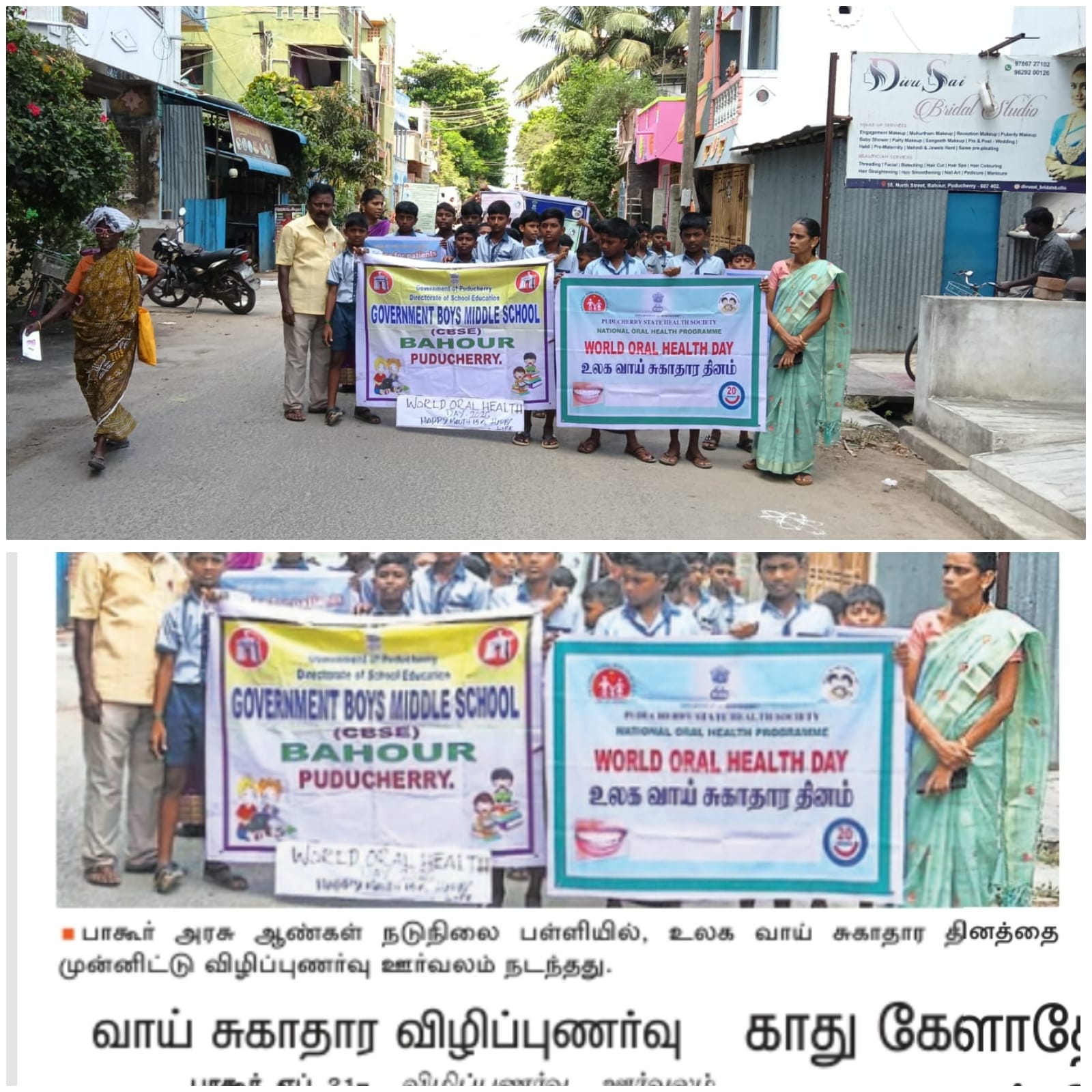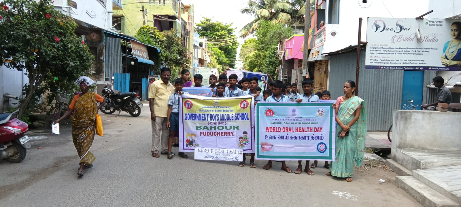 An oral health awareness rally was conducted on 20/04/2026 at the Government Middle School for Boys, Bahour, as part of World Oral Health Day (WOHD) 2026 activities under AAM Bahour. The program aimed to create awareness about the importance of maintaining good oral hygiene among school students and the general public. Around 100 students actively participated in the rally, which was carried out through the main streets of Bahour village. The participants displayed placards and raised slogans promoting oral health practices. Pamphlets containing key oral health messages were distributed to the public, helping to spread awareness and encourage healthy habits within the community.