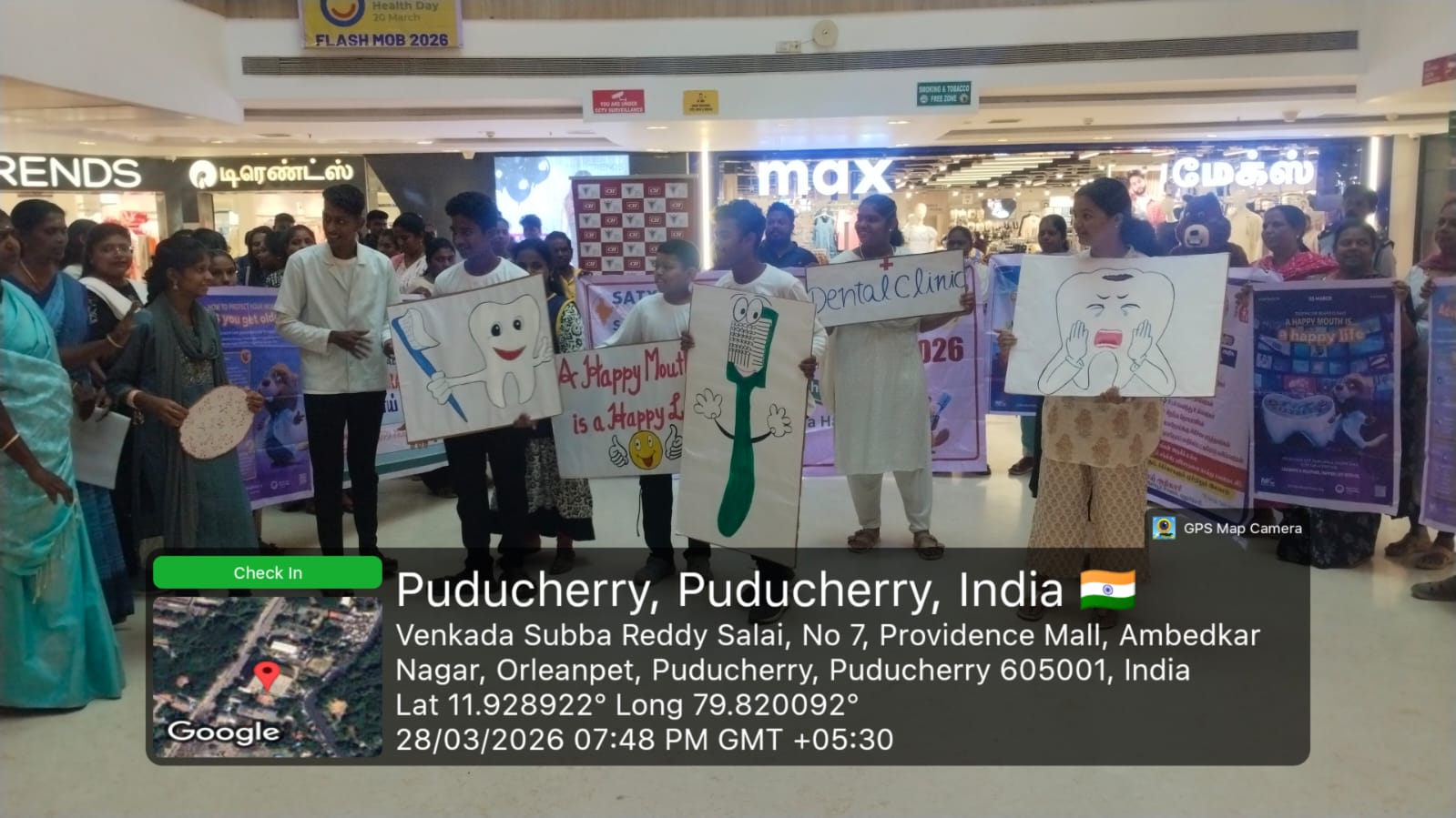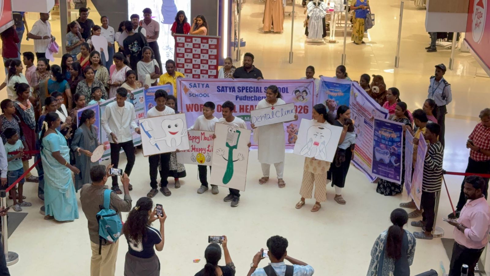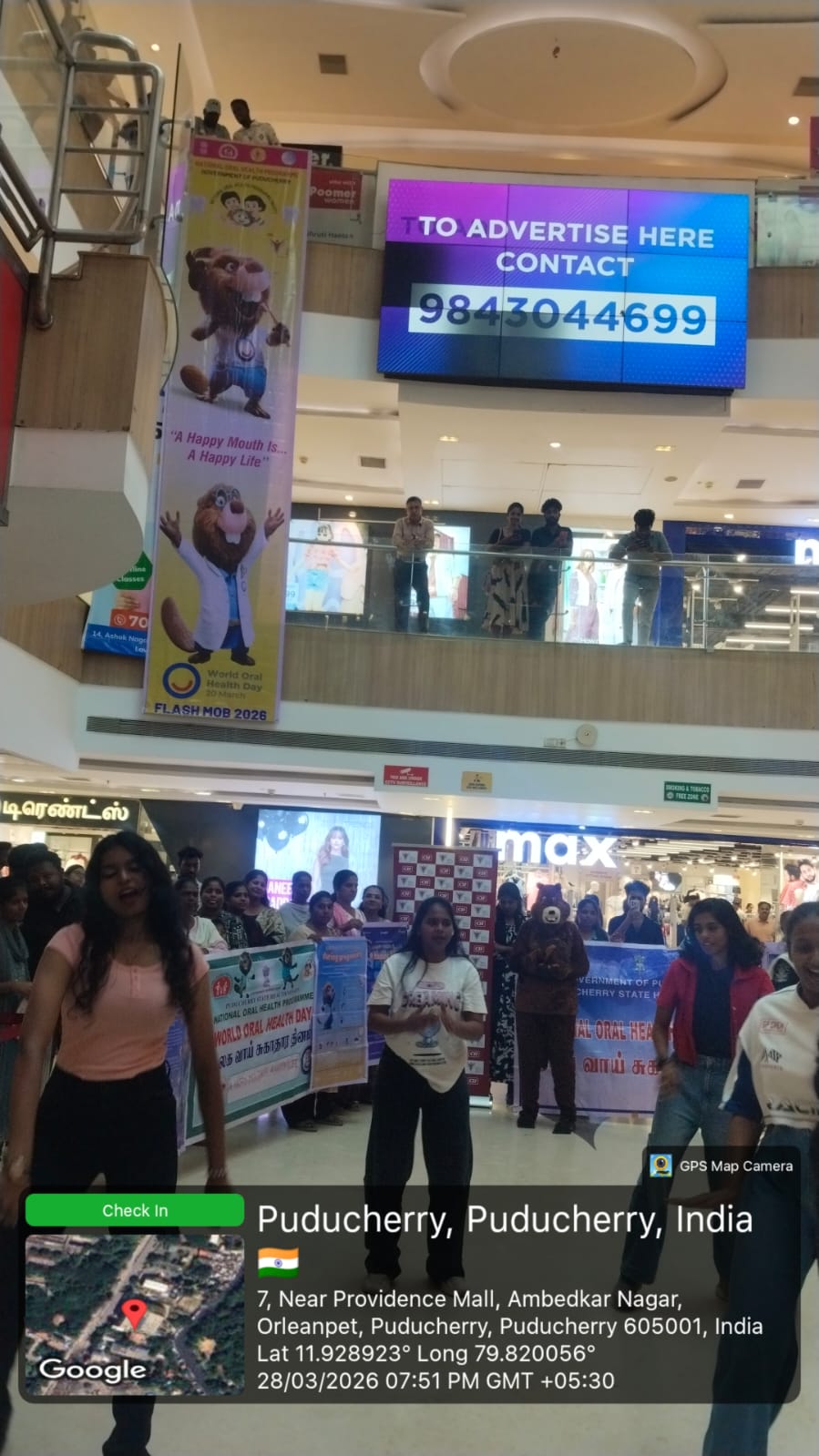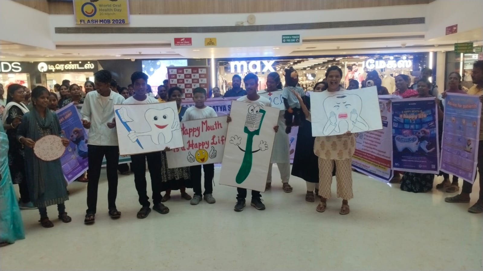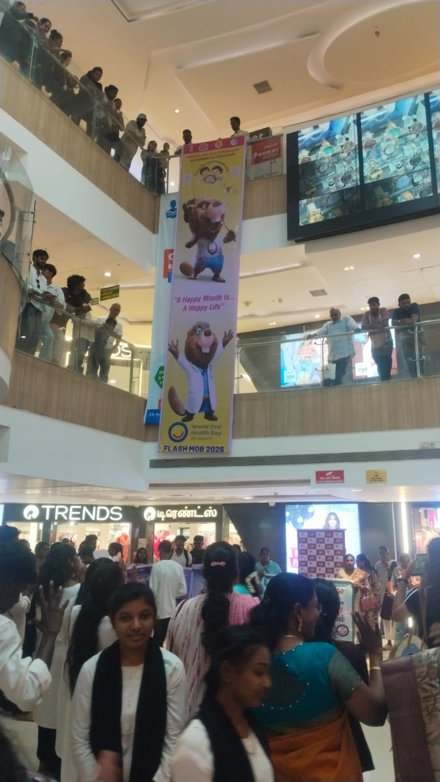 A dental awareness _banner drop_ was organized at a prominent shopping mall as part of the *World Oral Health Day* celebration, aiming to spread awareness about the importance of maintaining good oral hygiene among the general public on 28/03/2026 evening.