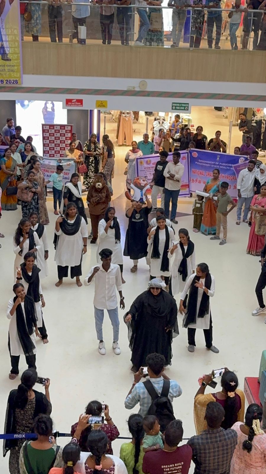 At a scheduled time, an eye-catching banner carrying key oral health messages such as “Brush Twice Daily,” “Say No to Tobacco,” and “Healthy Mouth, Healthy Life ” along with our mascot *Toothie* the Beaver was unveiled from an elevated level of the mall, instantly drawing the attention of shoppers and visitors. Simultaneously, dental professionals and students interacted with the public, distributing pamphlets and _flashmob_ educating them about preventive dental care, common oral diseases, and the importance of regular dental check-ups was also conducted. The event served as an effective platform to communicate simple yet impactful oral health messages in an engaging and memorable manner.