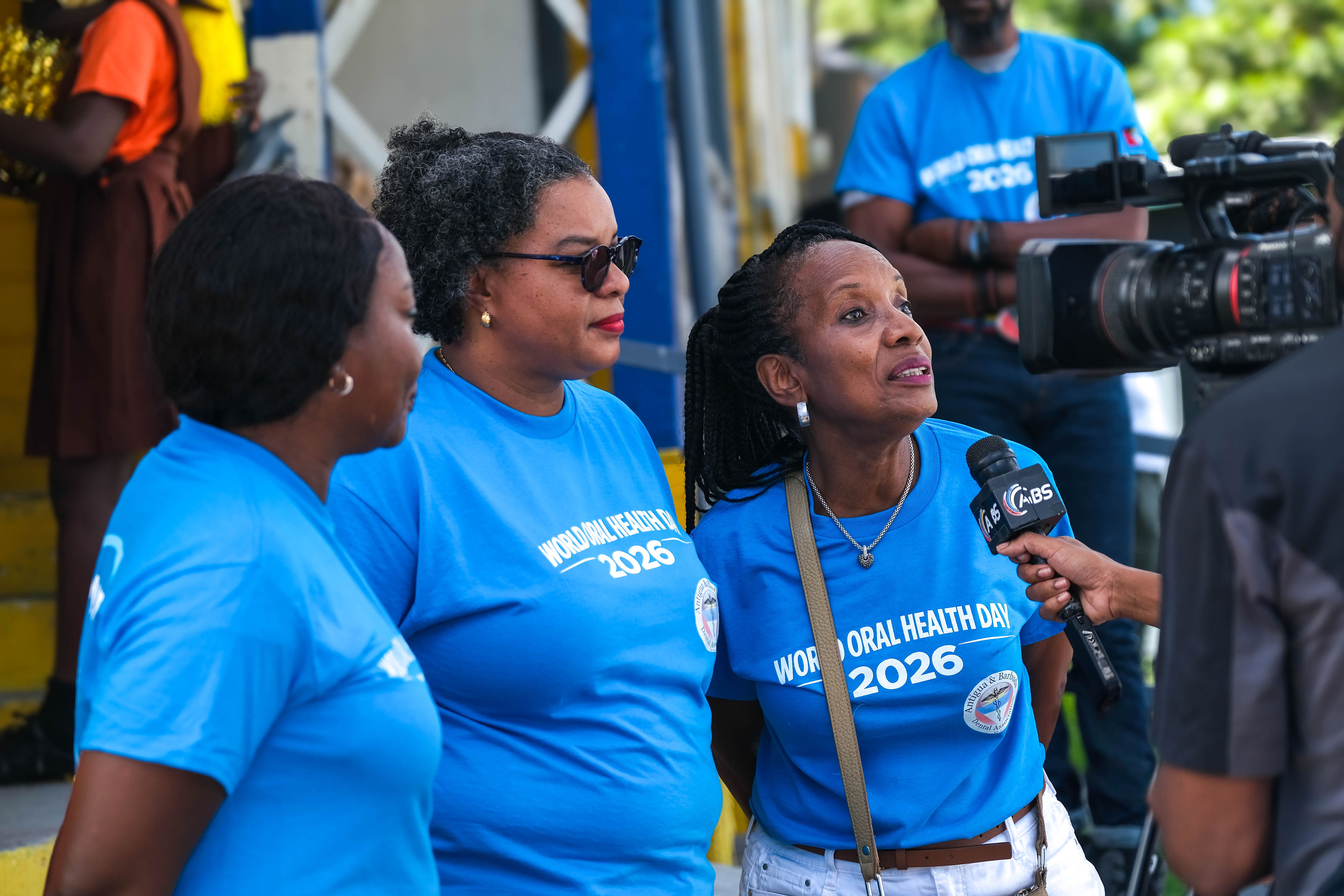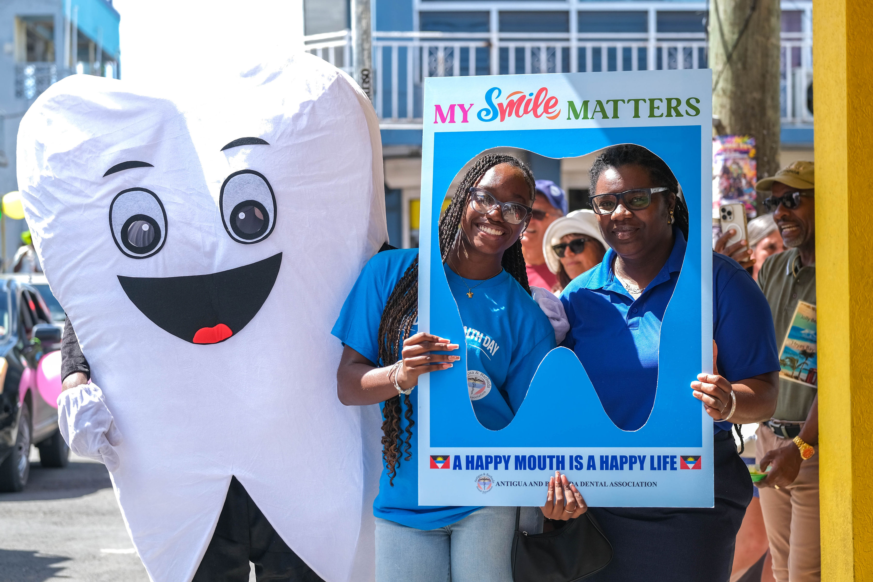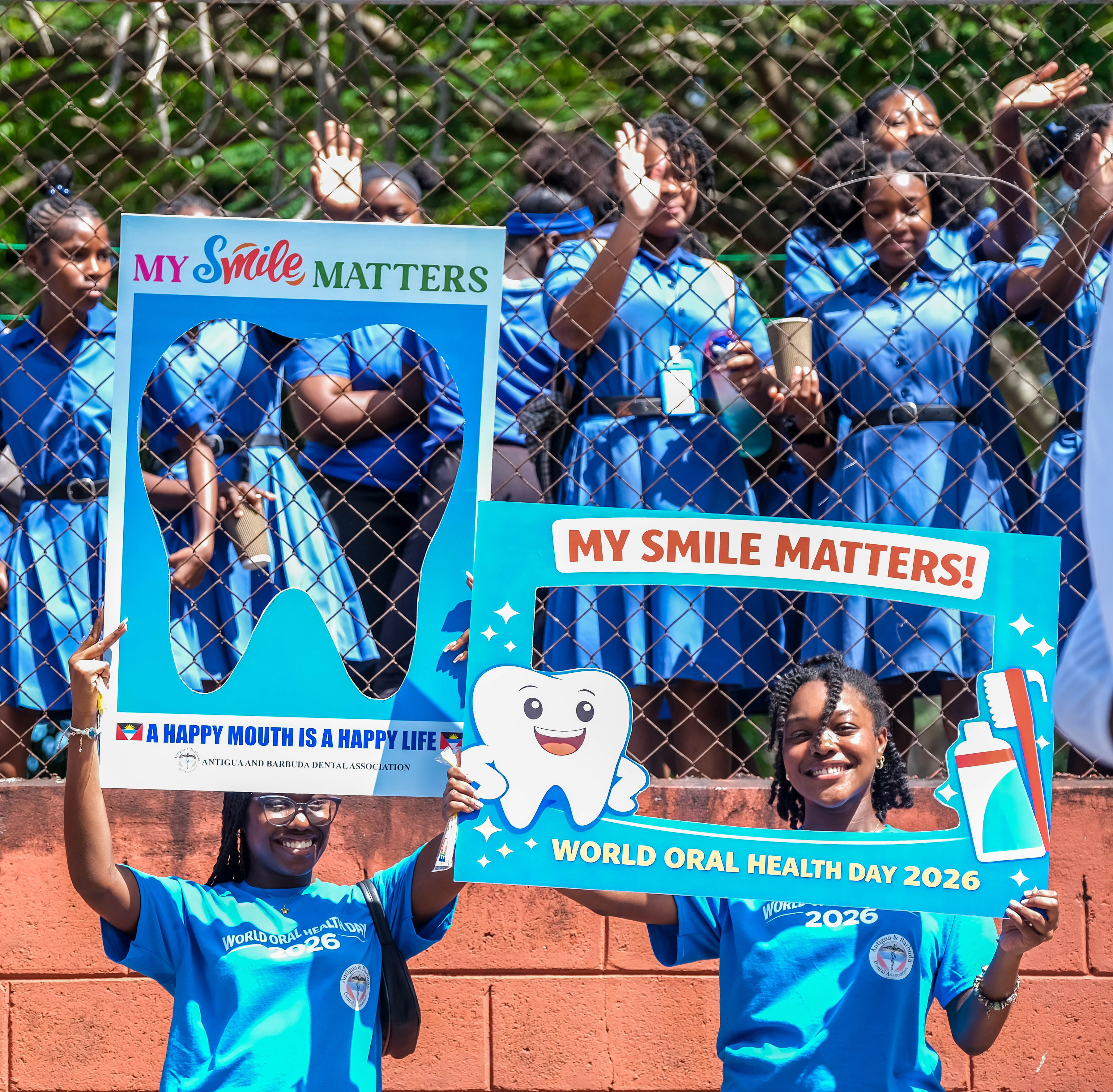 Promotion began with radio advertisements featuring Toothie, the official FDI mascot, ending with our parade message and helping to build public anticipation and awareness. The parade opened with our police escort, followed by the Bon Appétit Drum Corps and bold 3 ft by 6 ft banners displaying the World Oral Health Day message and the logos of ABDA and FDI. The procession featured Toothie, fruits, vegetables, Mr. Toothpaste, and other costumed characters; 50 children from our Sunny Smiles schools accompanied by teachers; dentists walking and driving; and two decorated trucks carrying banners with messages such as “Your Smile Matters” and “Drink Water, Eat Fruits and Vegetables,” along with the 2026 slogan. Eighteen medical students from the University of Health Sciences Medical School participated, along with volunteers, first responders, and the Antigua and Barbuda Red Cross ambulance, one of our coalition partners. Participants wore blue World Oral Health Day T-shirts, while the costumes, music, movement, and color brought oral health and nutrition education to life. A main feature of the parade was also the photo frames taken with people who were lining the streets. They enjoyed having their pictures taken. Over 1,000 toothbrushes and toothpaste were given out along with 43 certificates for dental cleanings.