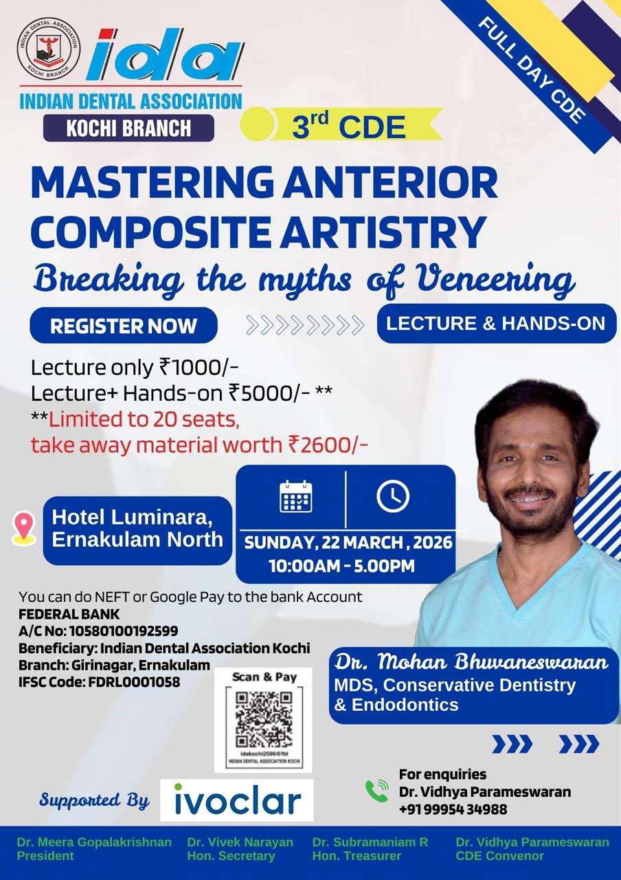 A full-day Continuing Dental Education (CDE) program with hands-on training titled “Mastering Anterior Composites: Breaking the Myths of Veneering” will be conducted on 22/03/2026 from 10AM- 5PM at Hotel Luminara, Ernakulam, Kerala, India.