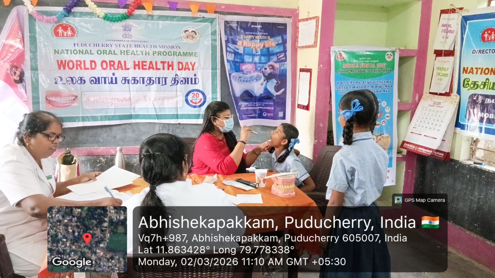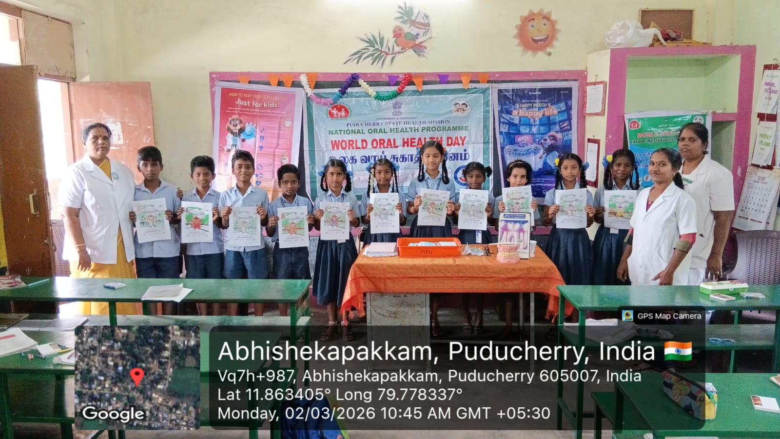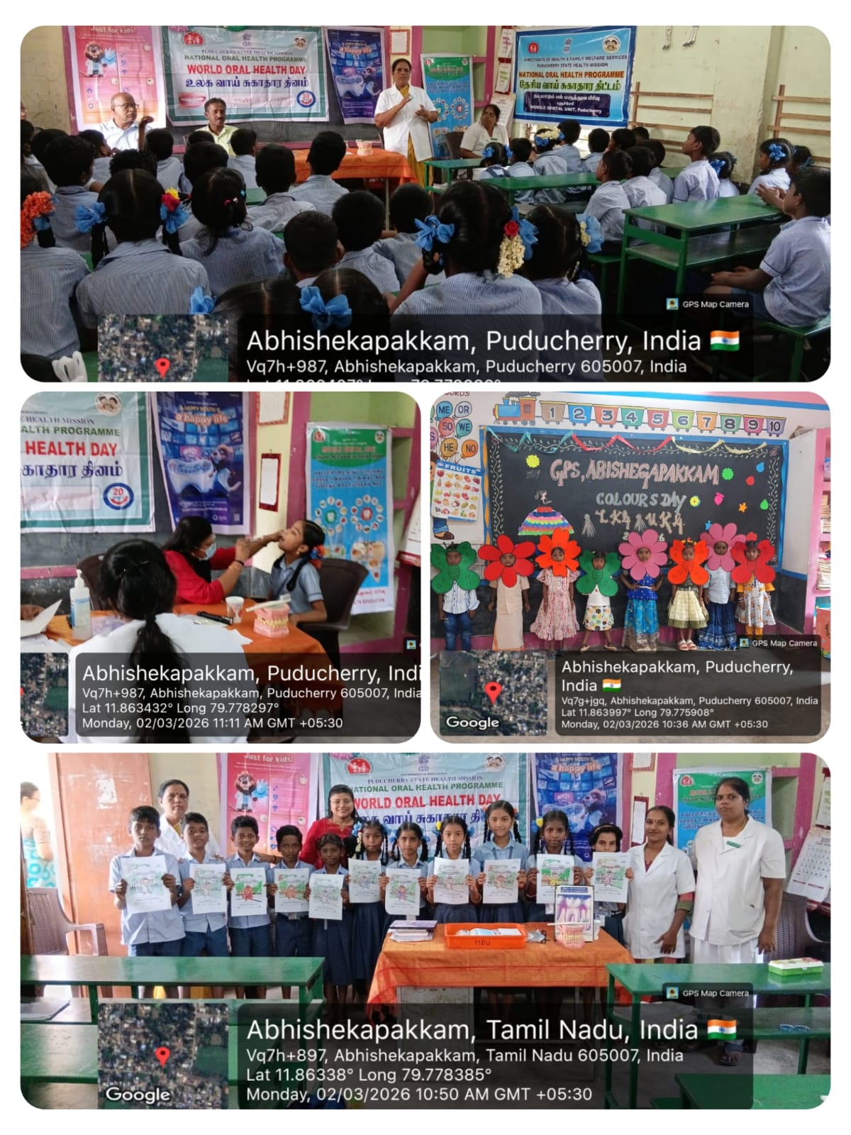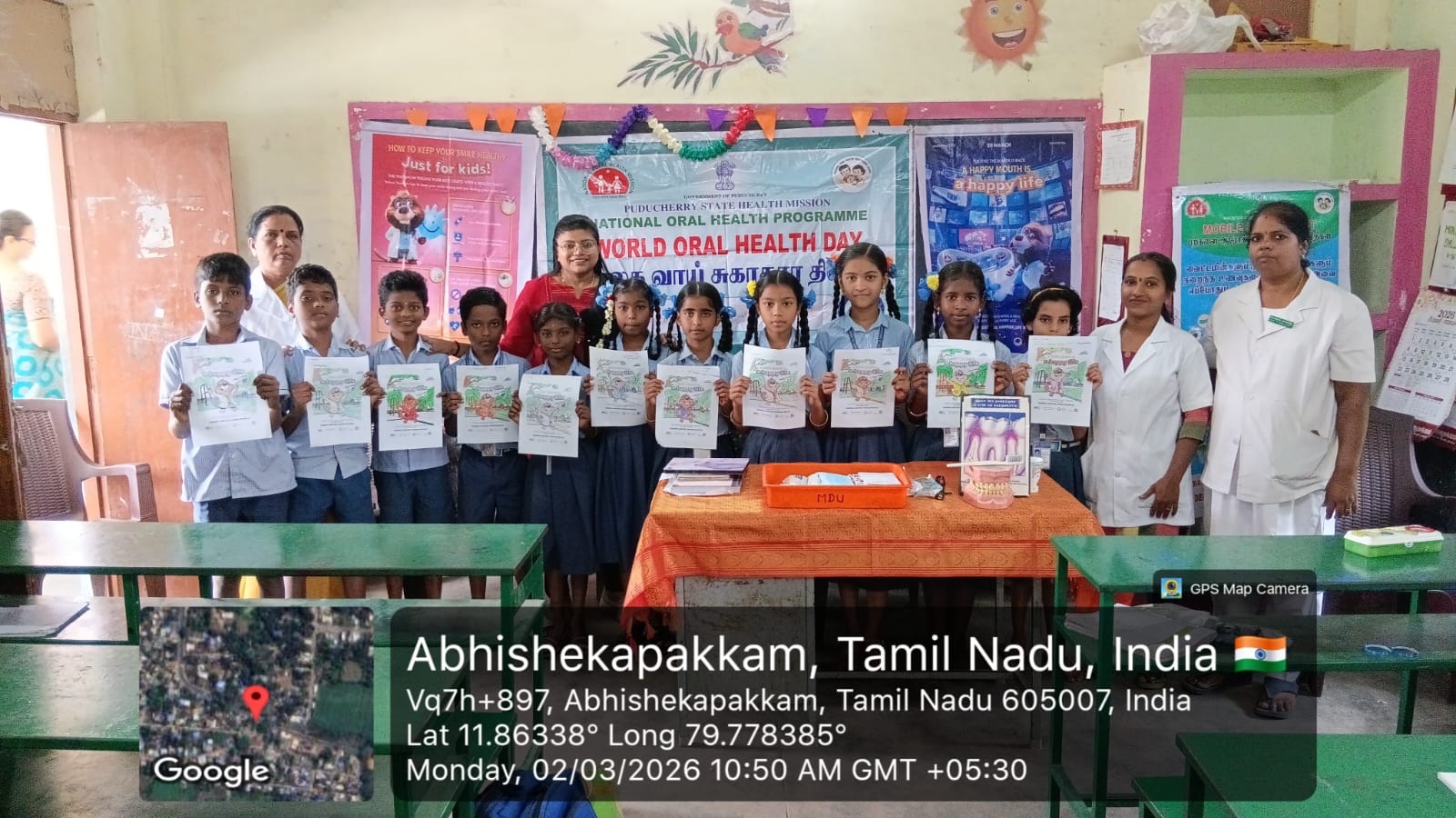 As part of the *World Oral Health Day 2026* celebrations, a _Drawing and colouring competition_ was conducted at *GPS Abhishekapakkam* on 02-03-2026. The event marked the beginning of the month-long activities with the theme *“Happy Mouth is a Happy Life.”* Children from Class 5 actively participated in the colouring competition, expressing their ideas on good oral hygiene practices. A special oral health awareness talk was also delivered to students and teachers, emphasizing proper brushing techniques, healthy eating habits, and the importance of regular dental check-ups. Around *72* students got benefitted from screening. The program was interactive and informative, benefiting nearly *121* participants.