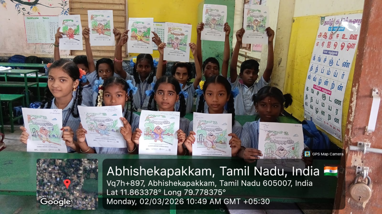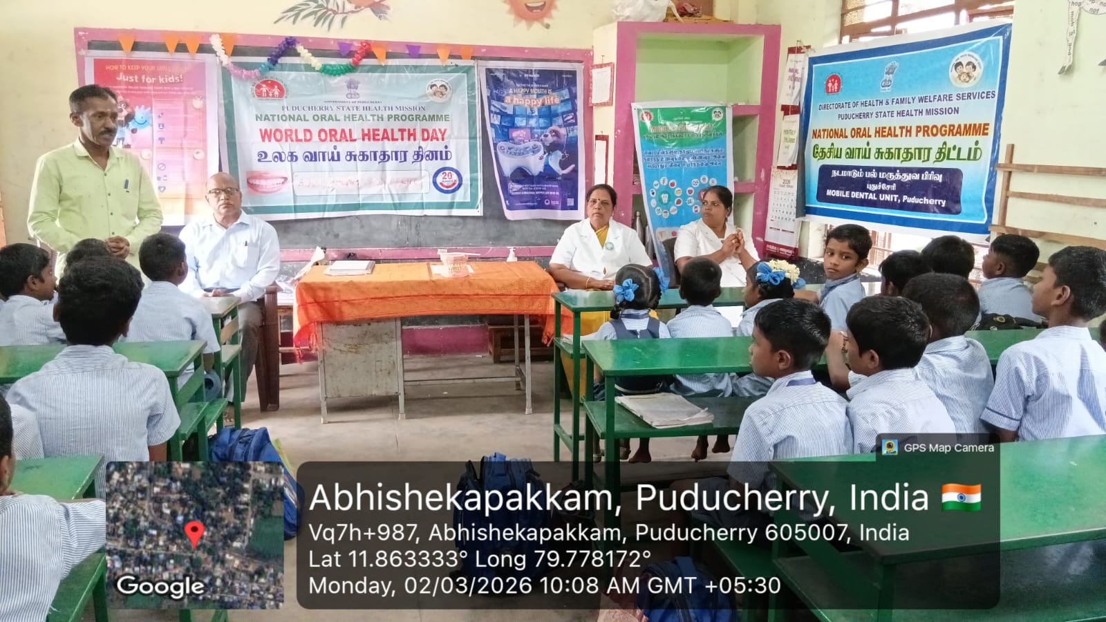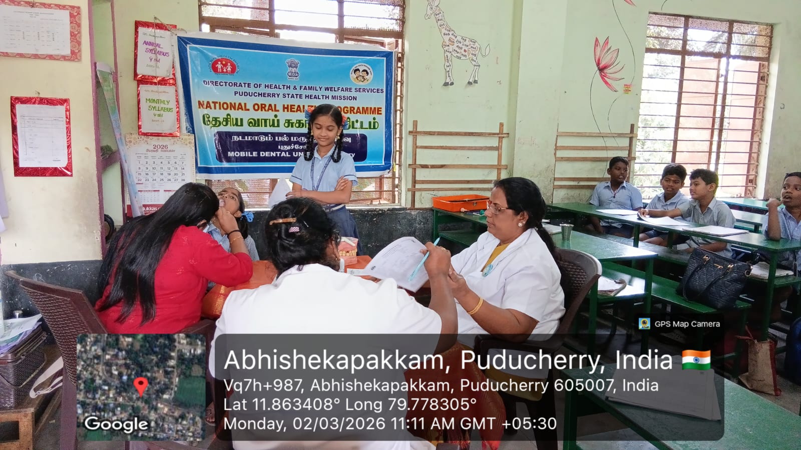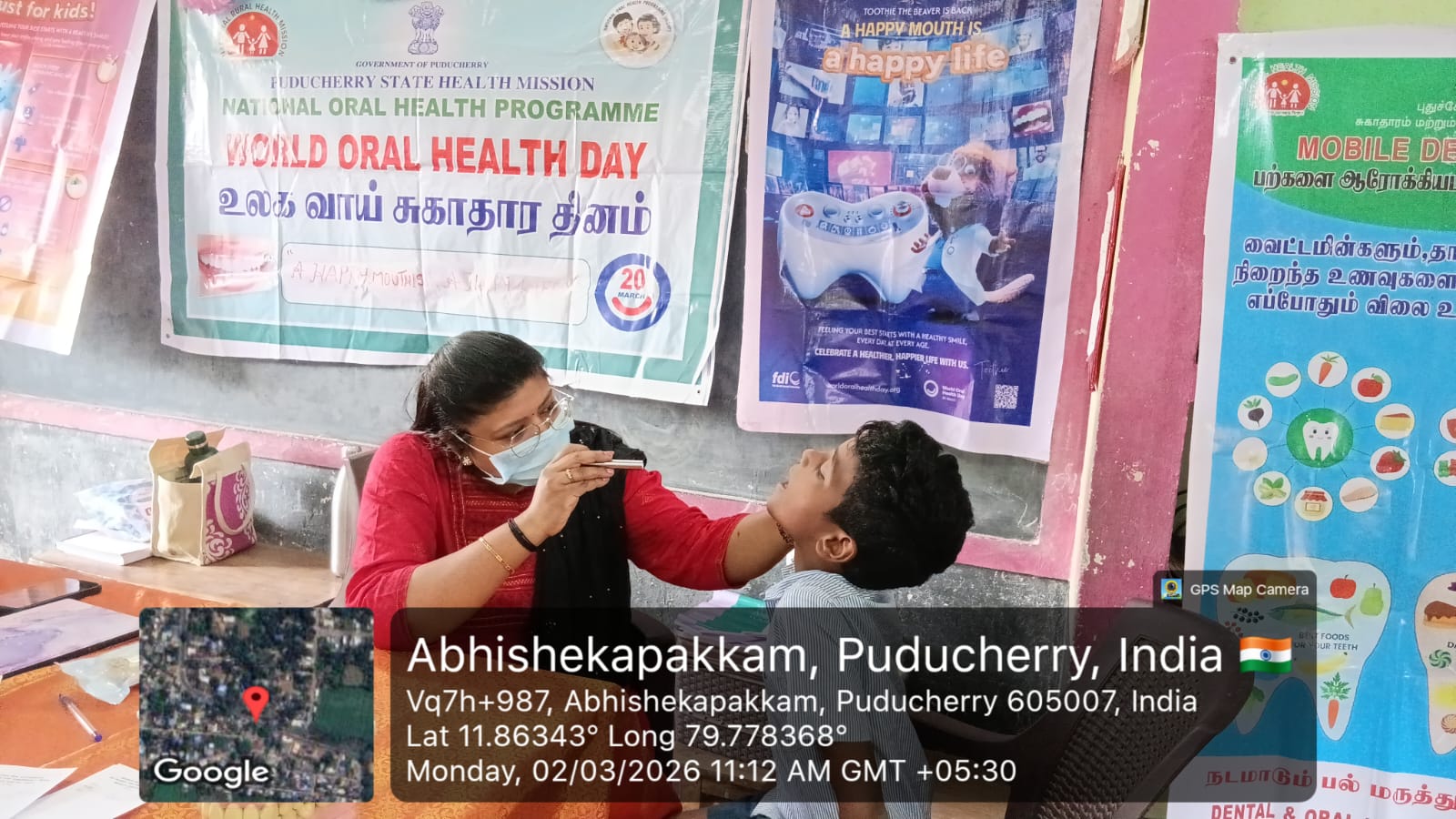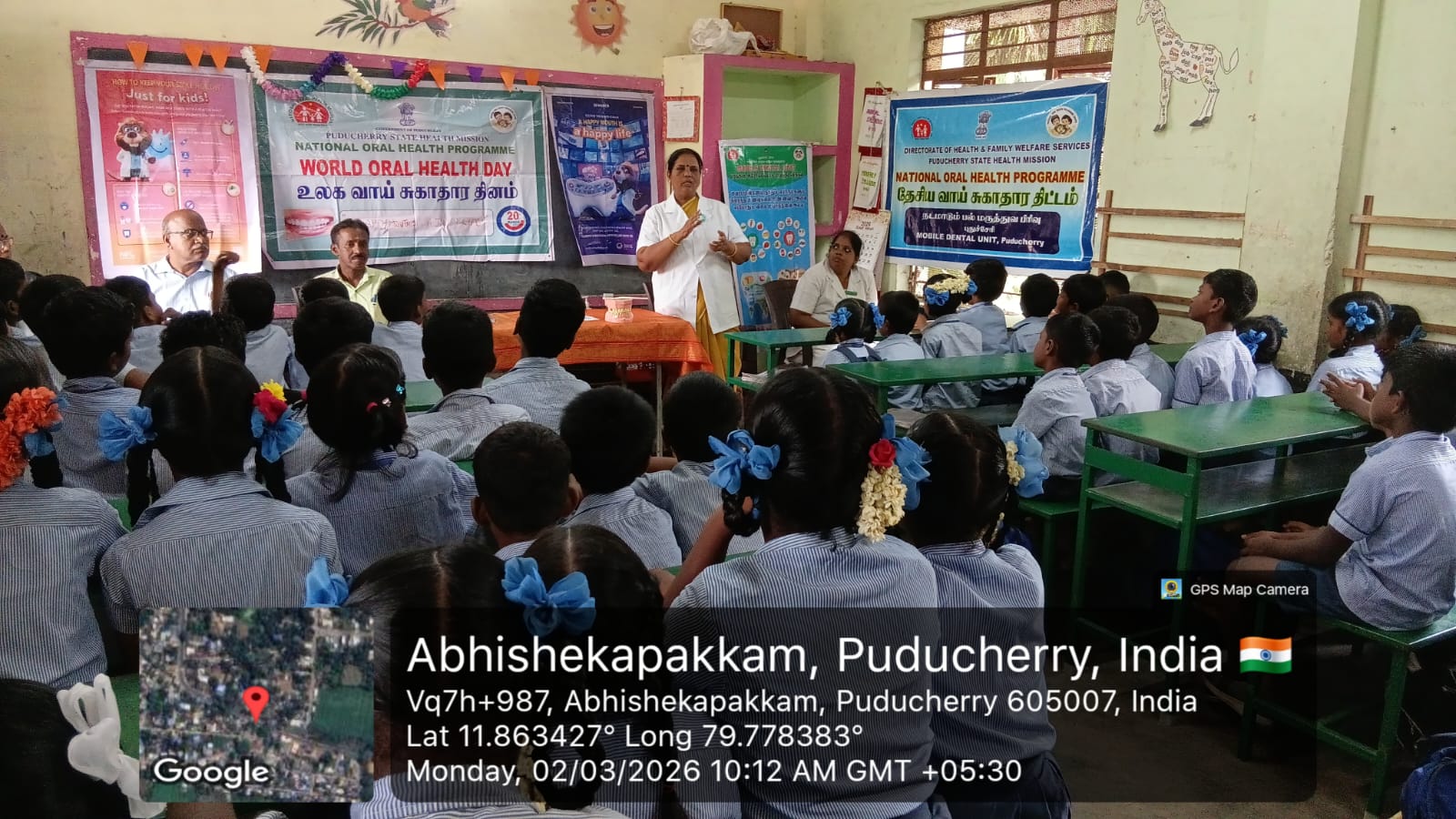 As part of the *World Oral Health Day 2026* celebrations, a _Drawing and colouring competition_ was conducted at *GPS Abhishekapakkam* on 02-03-2026. The event marked the beginning of the month-long activities with the theme *“Happy Mouth is a Happy Life.”* Children from Class 5 actively participated in the colouring competition, expressing their ideas on good oral hygiene practices. A special oral health awareness talk was also delivered to students and teachers, emphasizing proper brushing techniques, healthy eating habits, and the importance of regular dental check-ups. Around *72* students got benefitted from screening. The program was interactive and informative, benefiting nearly *121* participants.