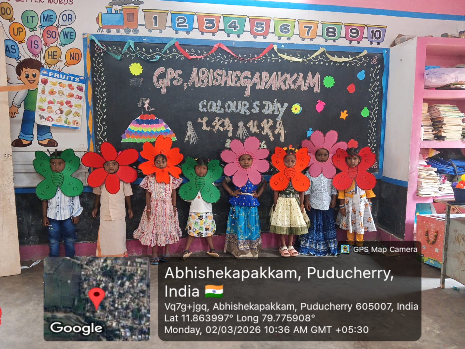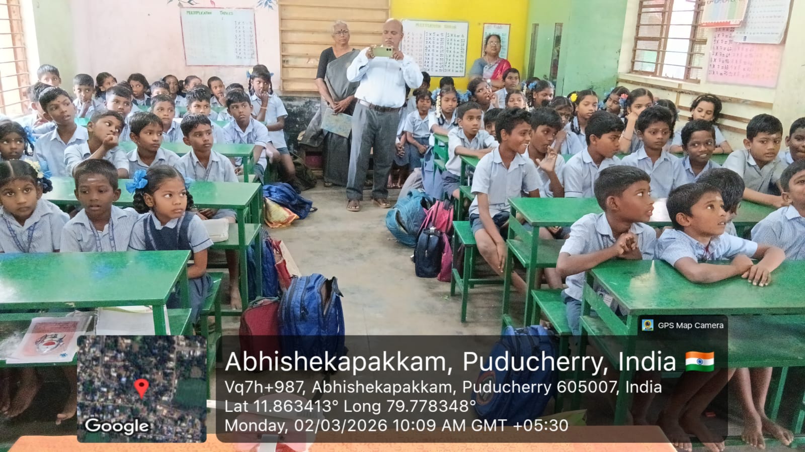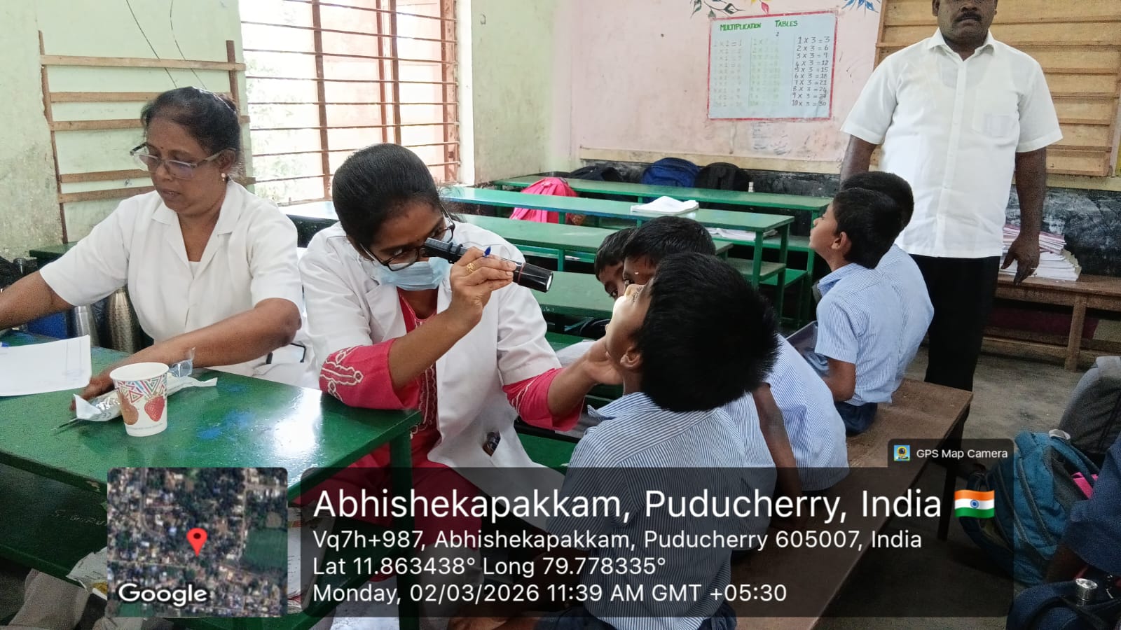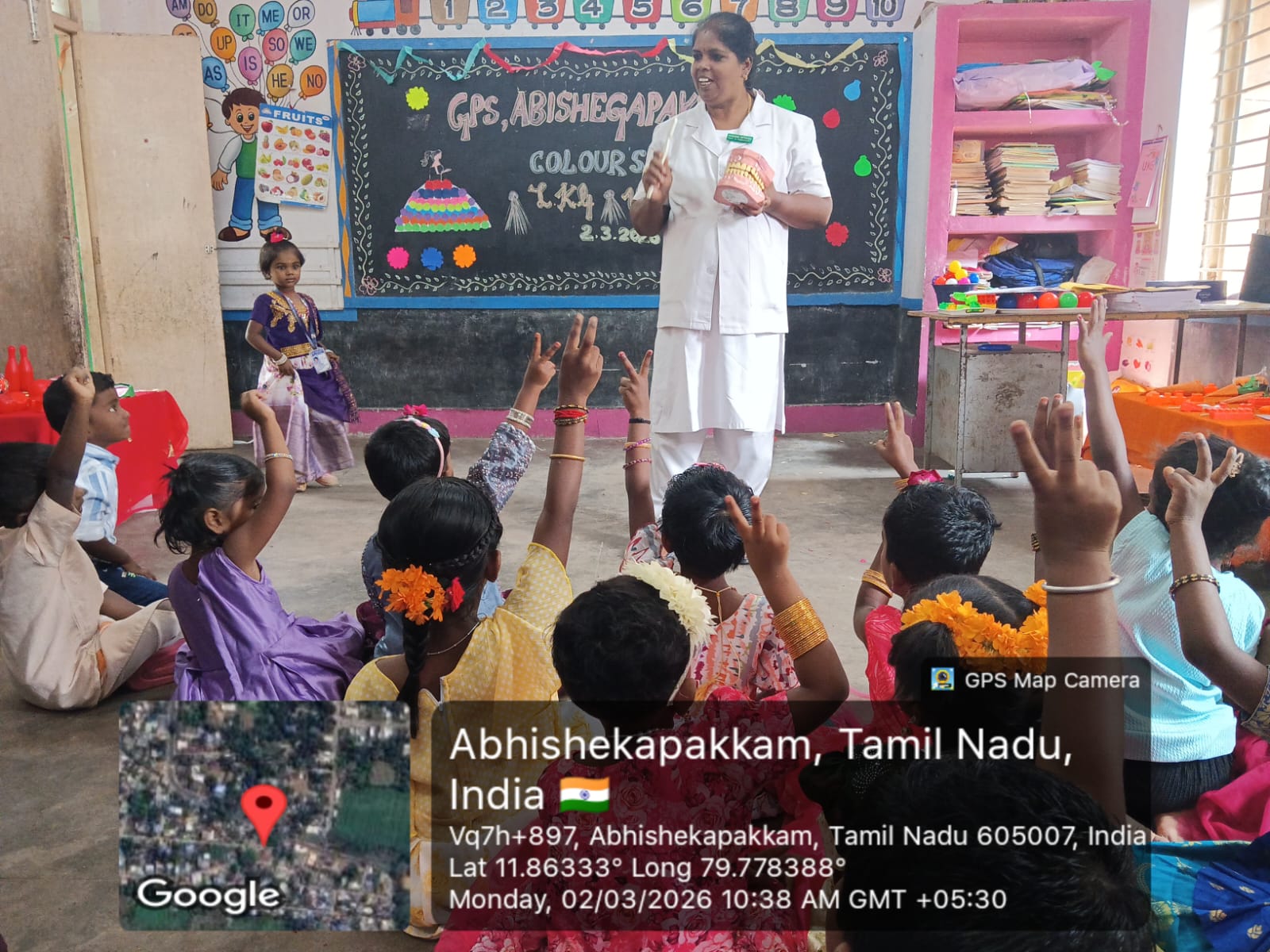As part of the *World Oral Health Day 2026* celebrations, a _Drawing and colouring competition_ was conducted at *GPS Abhishekapakkam* on 02-03-2026. The event marked the beginning of the month-long activities with the theme *“Happy Mouth is a Happy Life.”* Children from Class 5 actively participated in the colouring competition, expressing their ideas on good oral hygiene practices. A special oral health awareness talk was also delivered to students and teachers, emphasizing proper brushing techniques, healthy eating habits, and the importance of regular dental check-ups. Around *72* students got benefitted from screening. The program was interactive and informative, benefiting nearly *121* participants.