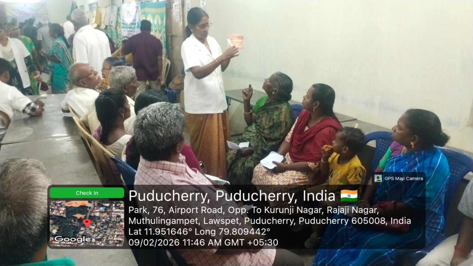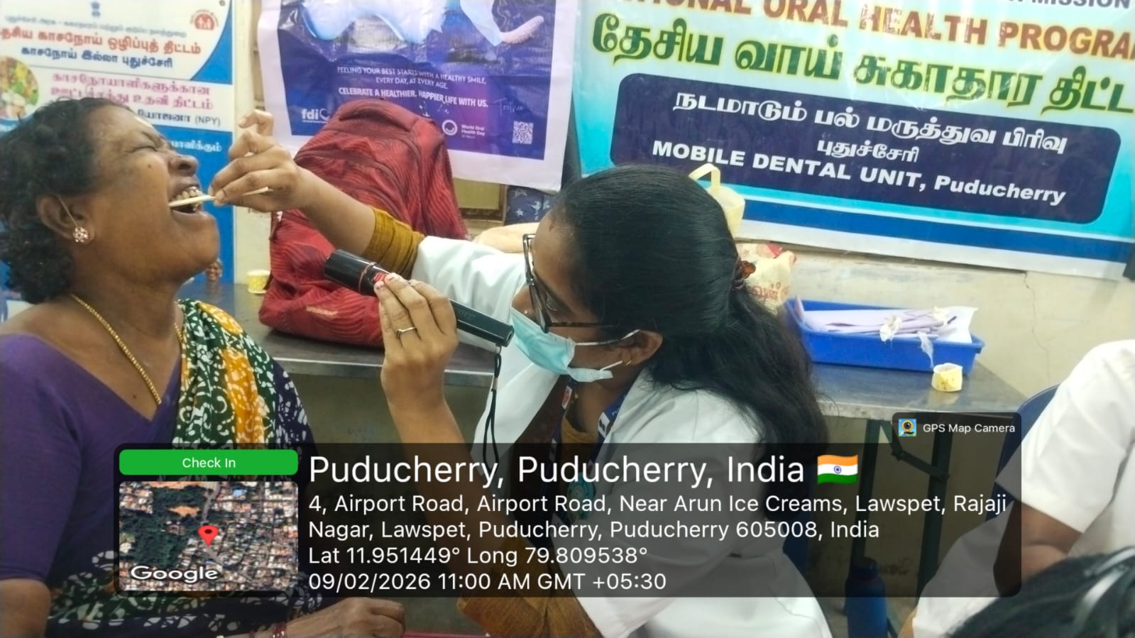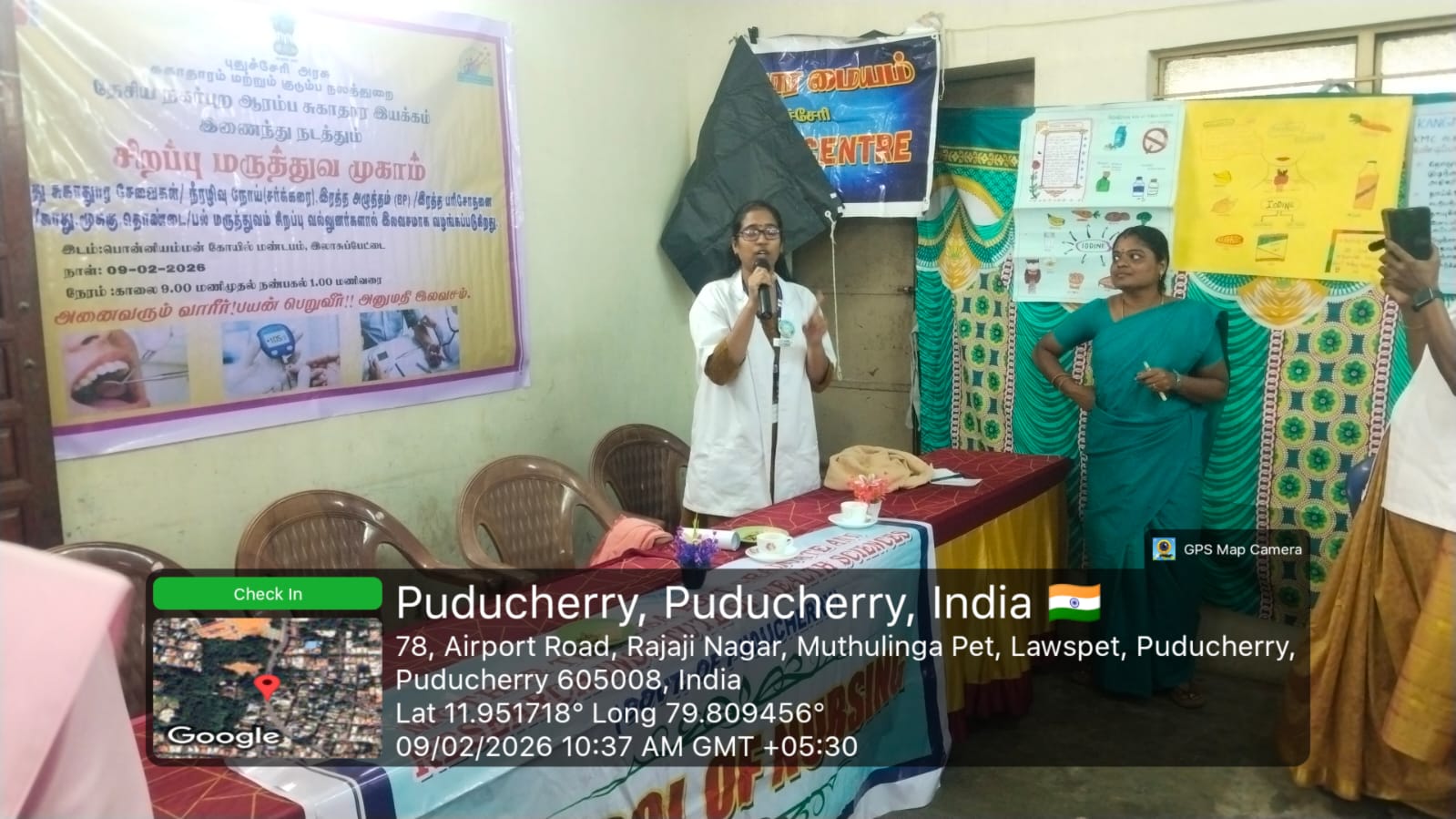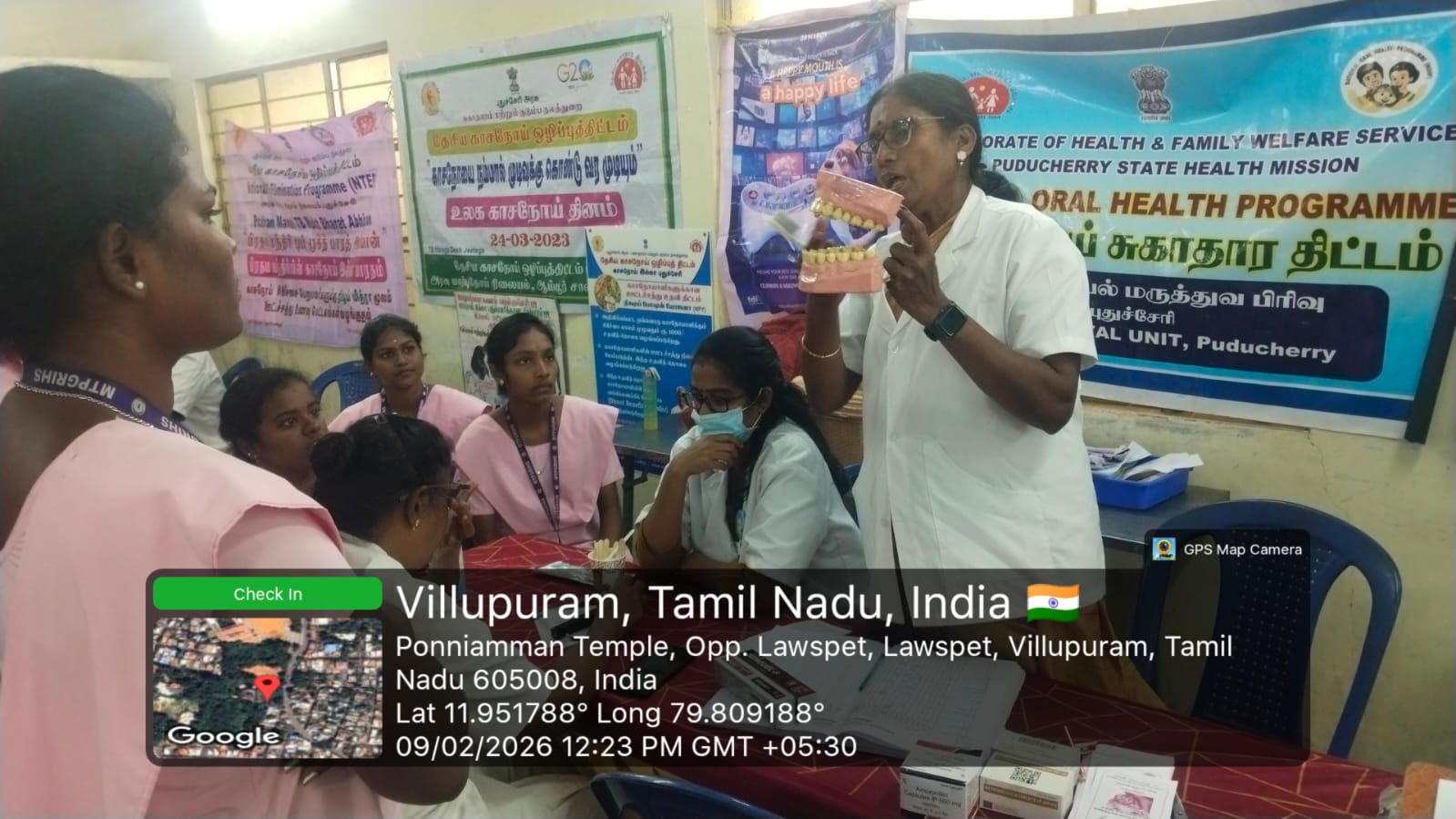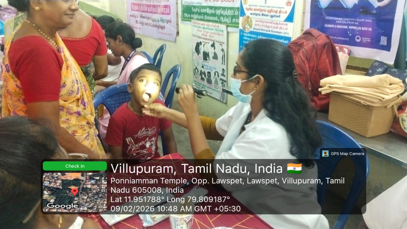 "An Oral Screening and Awareness services were conducted as part of the *Mega Special Health Camp* held at *Ponniamman Koil, Lawspet* by *UPHC Avvai nagar* on 9-2-2026. The camp provided comprehensive health services including dental check-up, blood pressure screening, hypertension evaluation, ENT examination, eye check-up, and general physician consultation. Specialists from various departments actively participated to ensure complete healthcare support for the public.