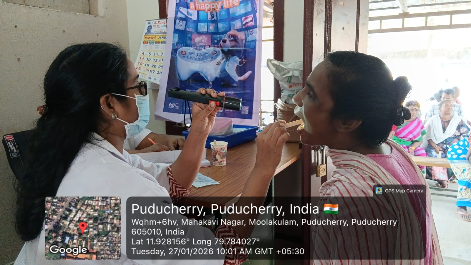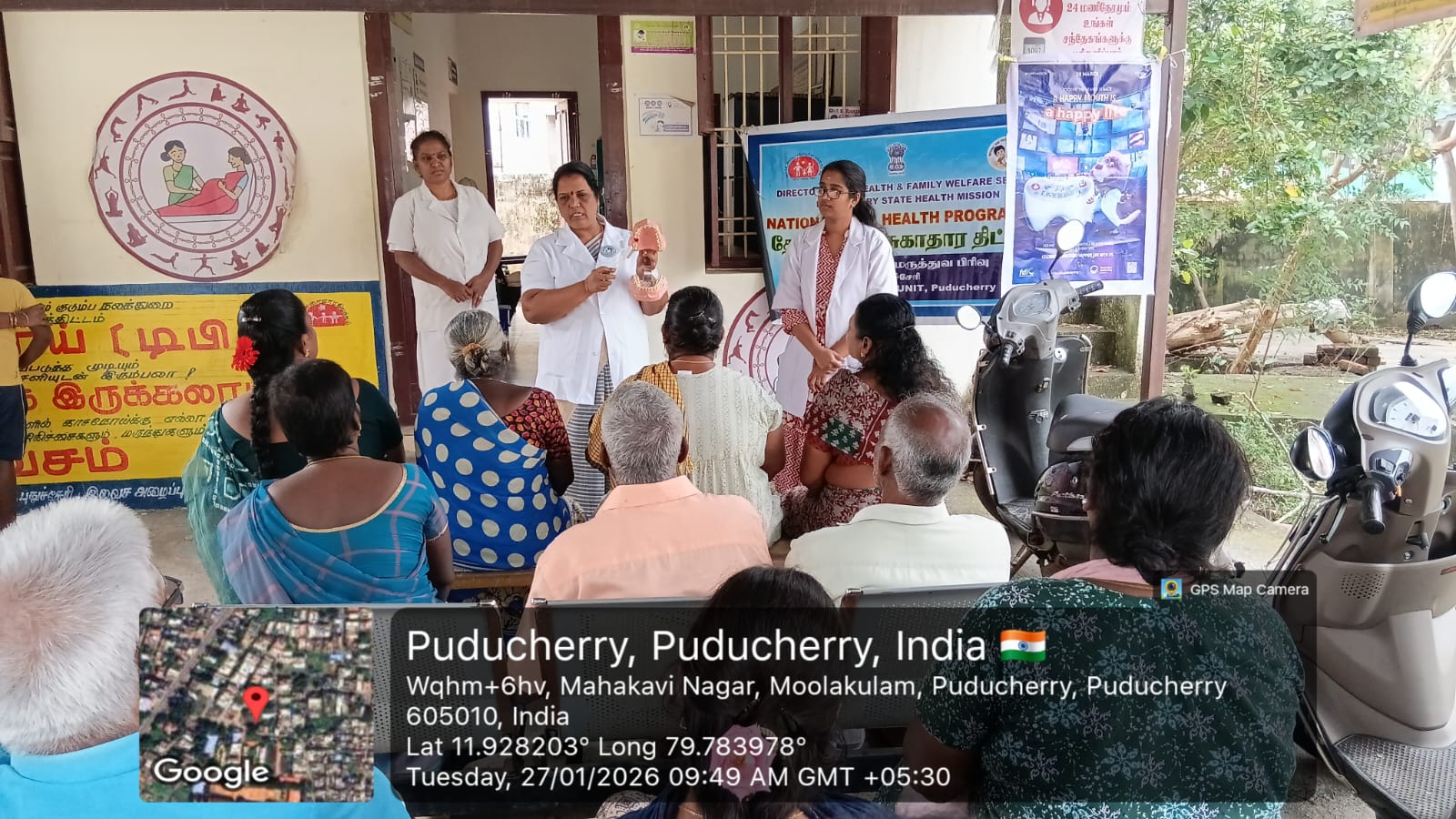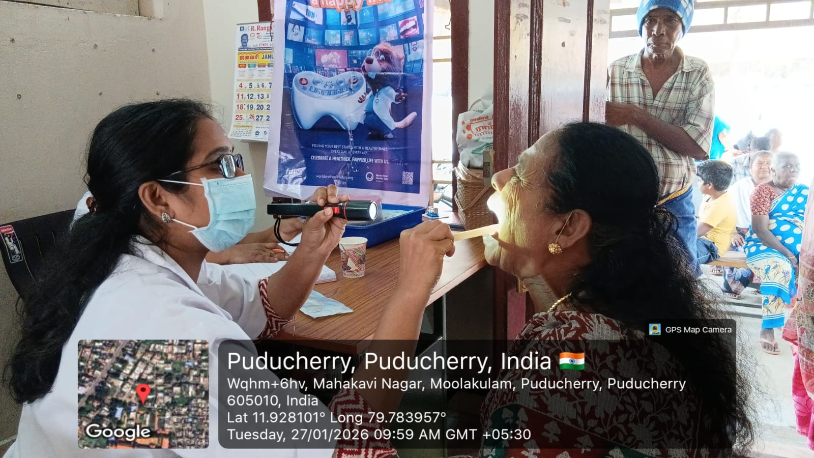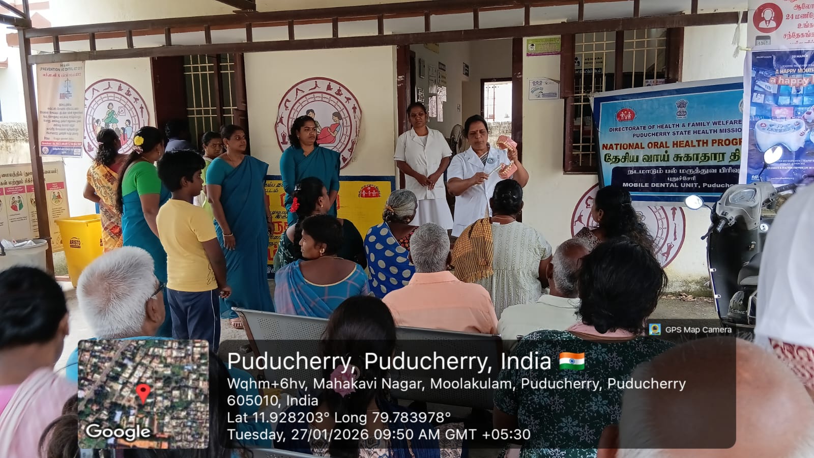 An Oral Screening and trearment camp was conducted at Urban Sub Health Centre , JJ Nagar, Moolakkulam, on 27-01-2026 to promote community oral health. The program included general oral screening and dental check-ups for the public. Awareness on oral hygiene and dental care was provided using dental models and banners.Brushing techniques demonstrations to help participants understand proper brushing techniques and preventive practices. A tobacco awareness talk was also delivered to educate the public on the harmful effects of tobacco on oral health. In addition, special oral hygiene instructions were given to mothers attending the _well-baby_ clinic, emphasizing early dental care for children. Overall, the camp was beneficial, with nearly *53* participants receiving guidance and screening services.