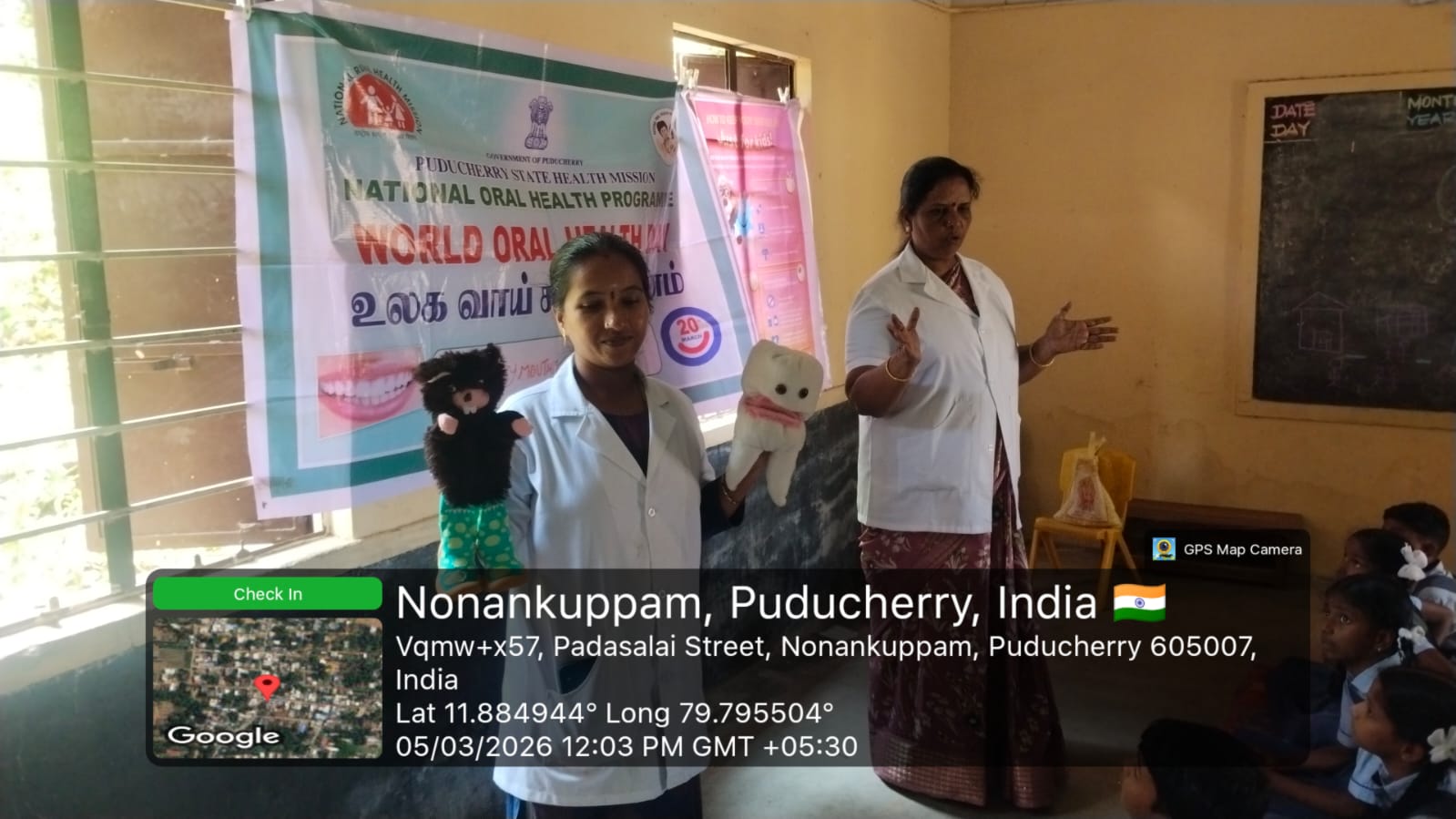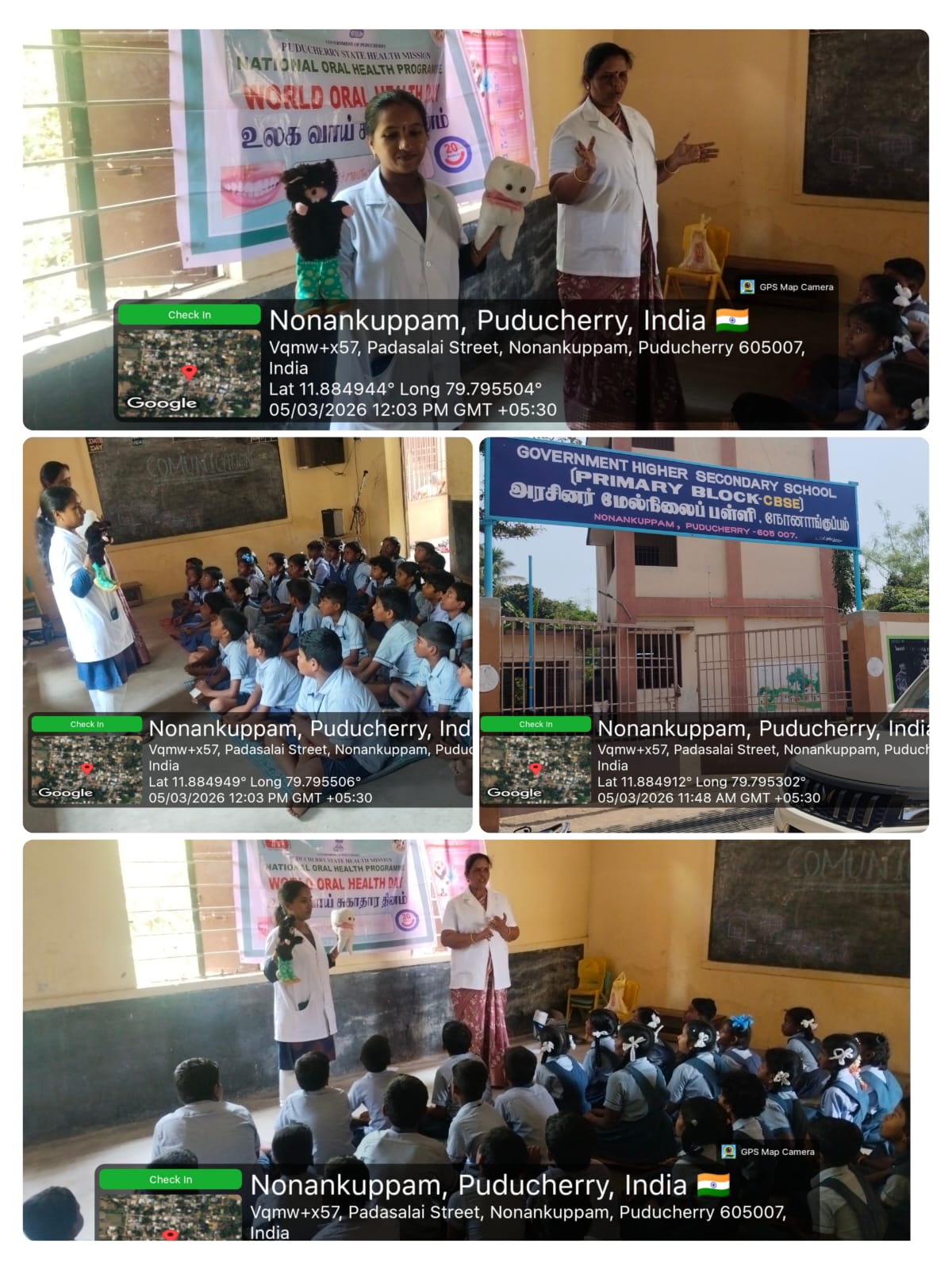 WOHD celebration :An oral health awareness session was conducted for the primary school students of *GPS Nonankuppam* on 5-3-2026. The session focused on educating children about the importance of maintaining healthy teeth and good oral hygiene habits. Students were encouraged to brush regularly and take care of their teeth to prevent dental problems. Nearly *84* students benefited from the session.