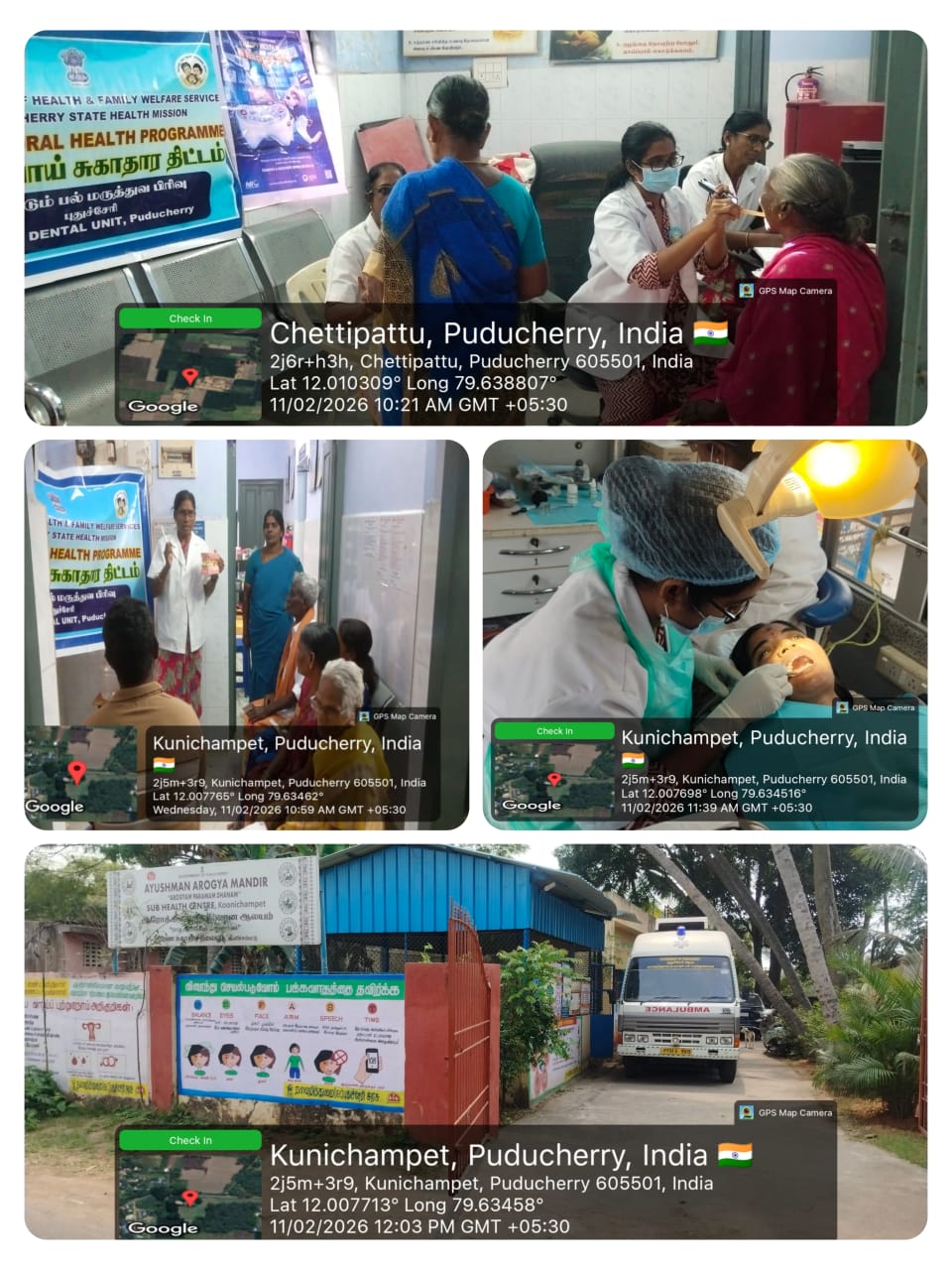 An oral screening and treatment camp was conducted at *AAM Sub Health Centre, Koonichampet* on 11-02-2026. During the camp, dental check-ups were carried out to identify common oral health problems such as dental caries, gum diseases, and oral lesions. A dental awareness session was also conducted for the general public, highlighting the importance of maintaining good oral hygiene and its connection to overall health. Proper brushing technique was demonstrated using a dental model to ensure participants understood correct methods of cleaning teeth. Participants were also educated about healthy food habits and the harmful effects of tobacco use. Nearly 45 beneficiaries attended and benefited from the camp.