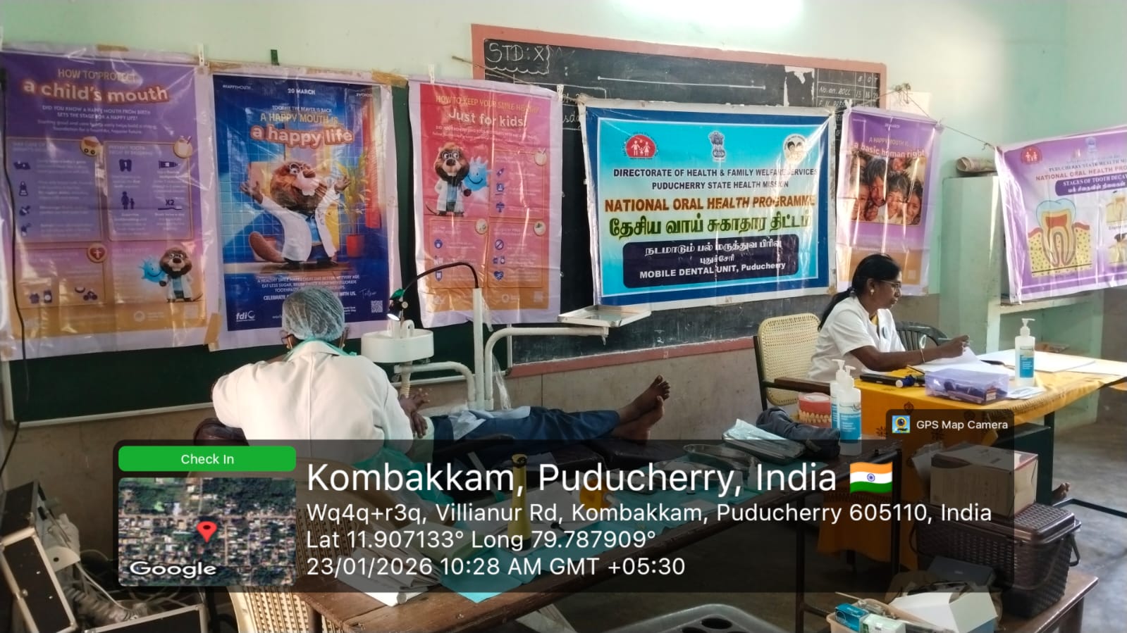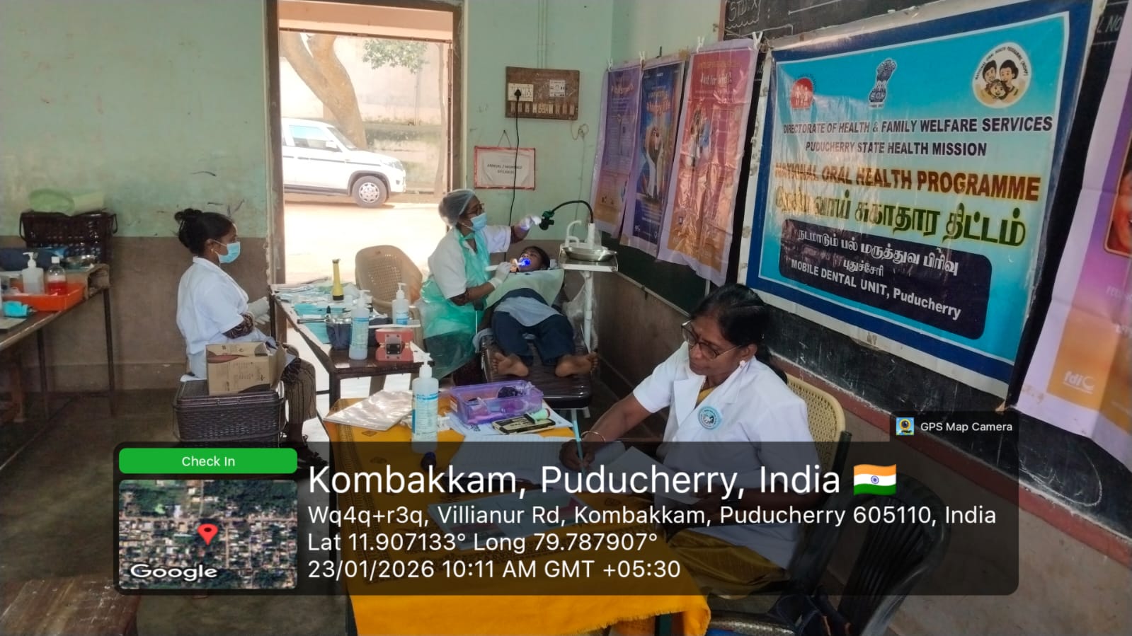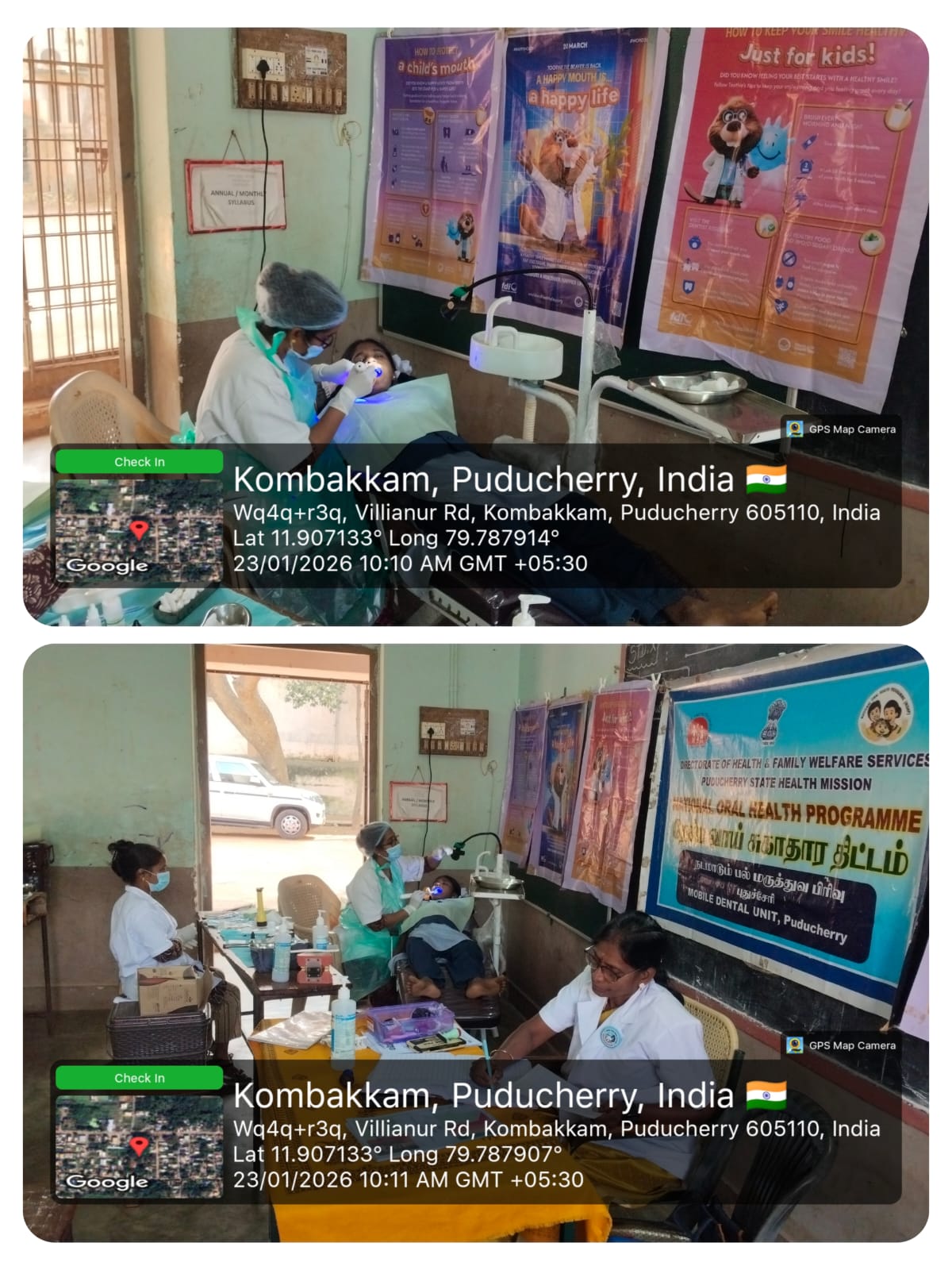 An Oral Screening and Treatment Camp was conducted at Government High School, Kombakkam, on 23.01.2026. The program aimed to improve the oral health of students through early detection and timely care. Students of seventh and eighth standards underwent oral screening, and those requiring treatment received basic dental procedures on-site. Treatments provided included permanent fillings, pit and fissure sealants, preventive restorations, glass ionomer cement restorations, and scaling. The camp helped in preventing further dental problems and promoted awareness about the importance of maintaining good oral hygiene. Overall, the initiative contributed to better oral health among students and encouraged them to adopt healthy dental practices.Nearly 25 benefitted.