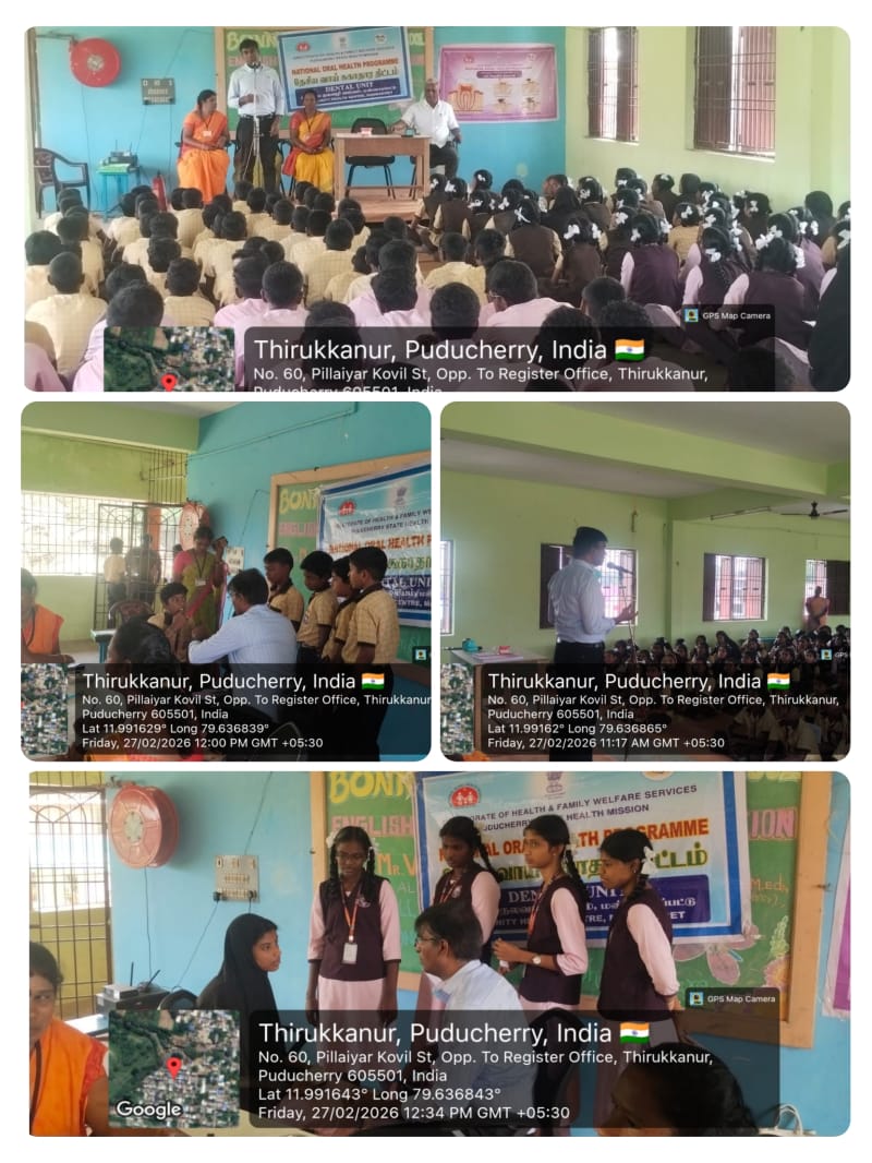 "27/2/26. CHC Mannadipet An oral screening camp conducted at Bonne Nehru Higher Secondary School Thirukanur .°During the camp, dental check-ups were carried out to identify common oral health problems such as dental caries, gum diseases, and oral lesions.