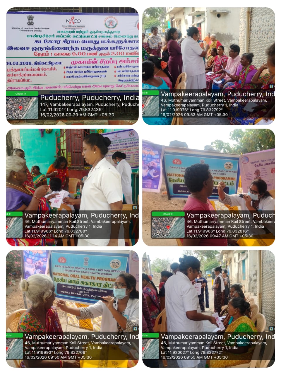 An oral screening camp was conducted at *Mariyamman Koil Street* , *Vambakeeraipalayam* , *Dubraypet* on 16.02.2026. The camp focused on improving oral health awareness among the general public. As part of the program, an _anti-tobacco awareness_ session was conducted to educate people about the harmful effects of tobacco use on oral and overall health. Informative _pamphlets_ were distributed to reinforce the health messages and encourage healthy lifestyle practices.