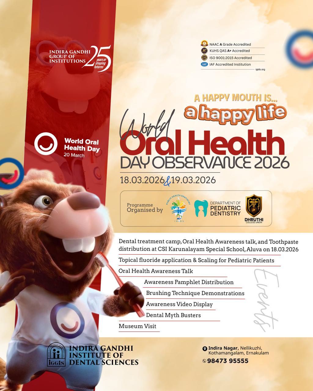 Indira Gandhi Institute of Dental Sciences, Nellikuzhi, Kothamangalam is conducting a Dental treatment camp, Oral Health Awareness talk, and Toothpaste distribution at CSI Karunalayam Special School, Aluva on 18.03.2026. The event is organized by the Department of Pediatric and Preventive Dentistry, the Department of Public Health Dentistry, and Dhruthi College Union